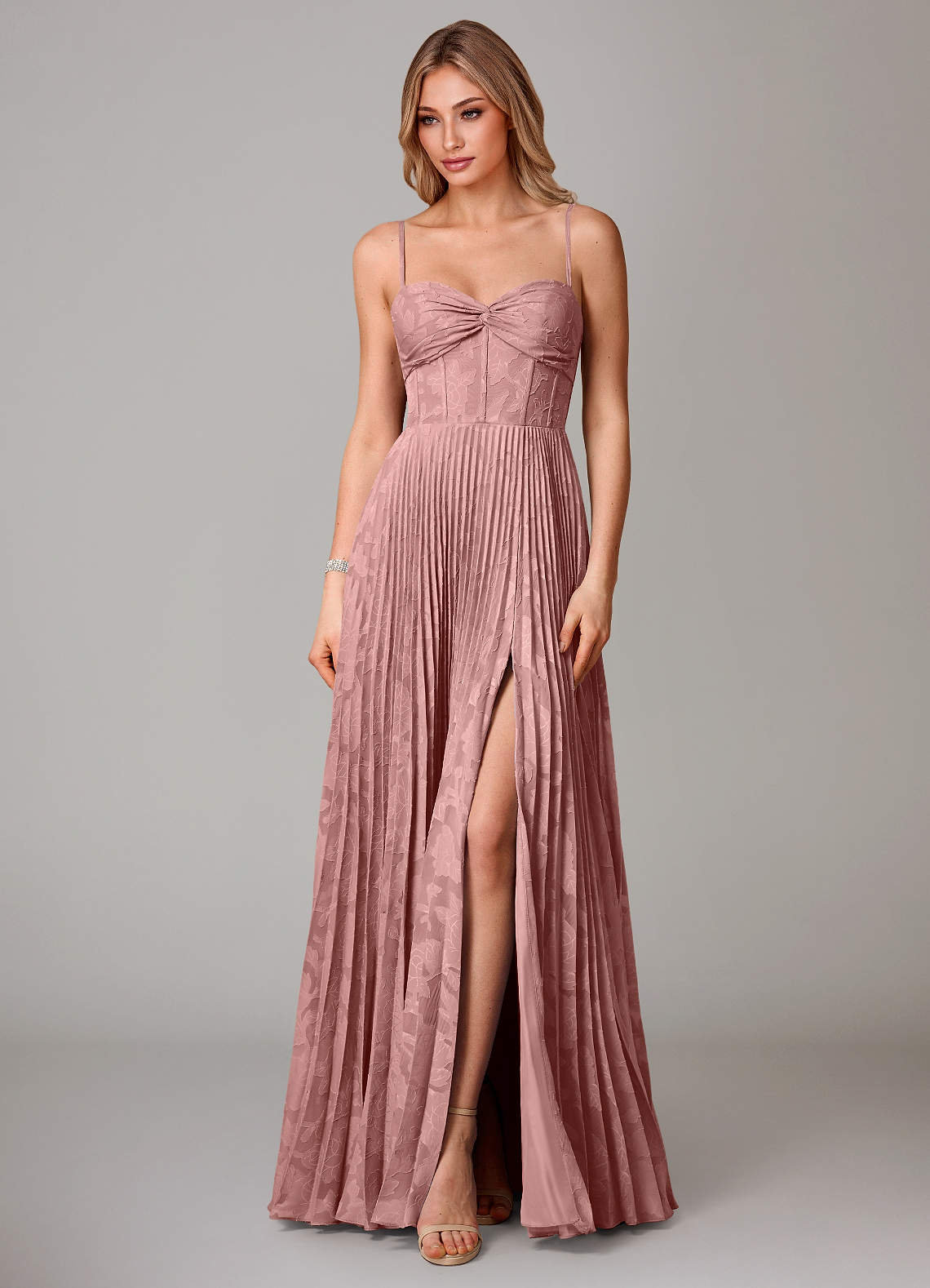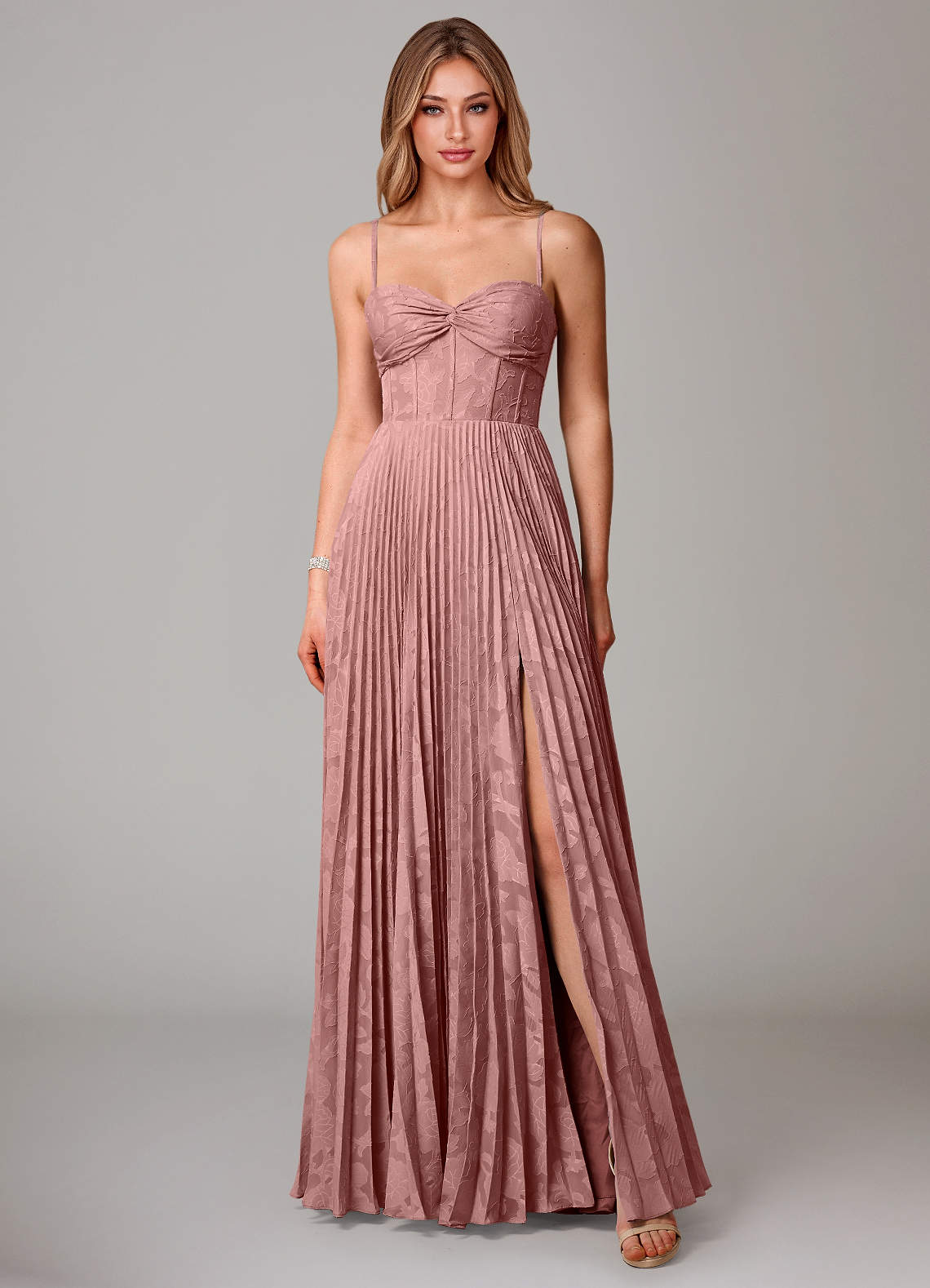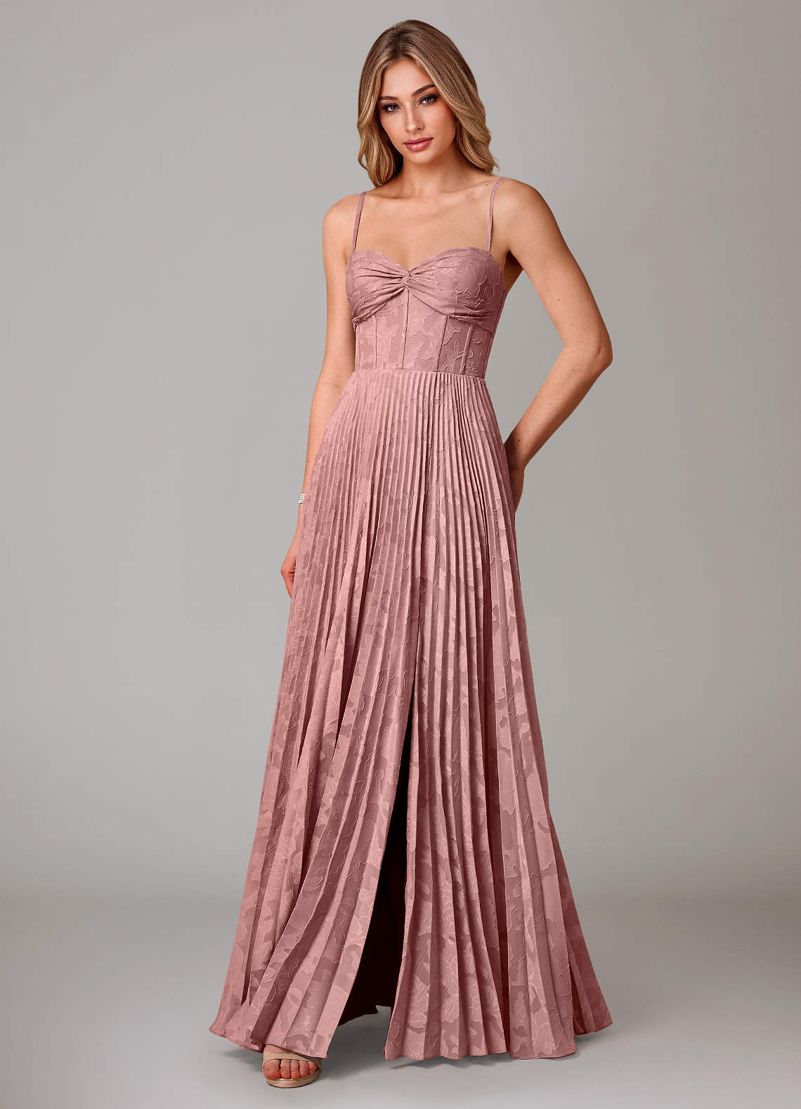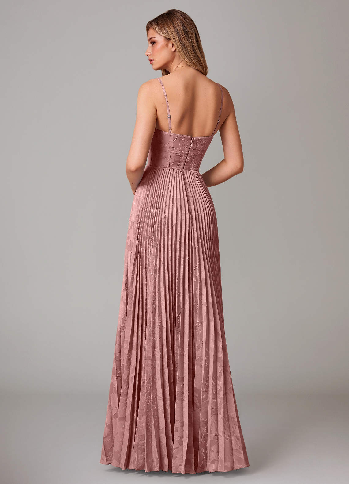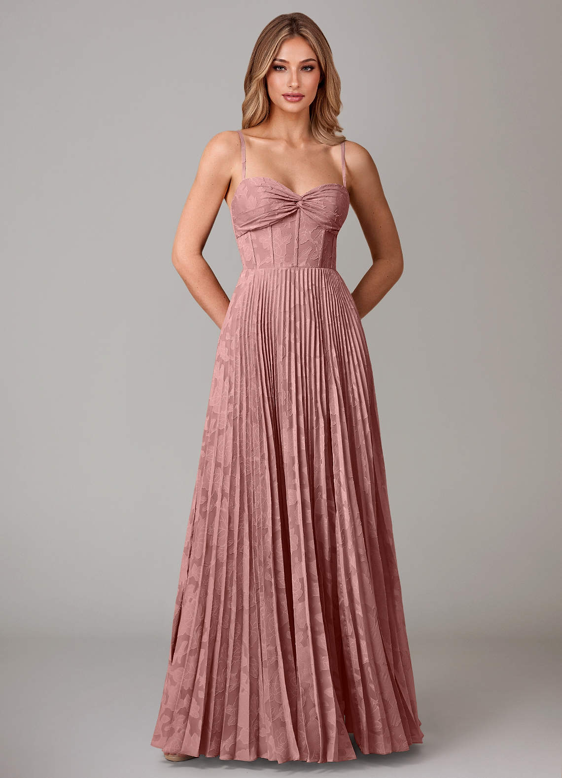 Wir präsentieren unser Brautjungfernkleid Akiko. Es ist aus wunderschönem, geblümtem Burnout gefertigt und besticht durch ein plissiertes Knotenmuster am Ausschnitt, verstellbare Spaghettiträger und sichtbare Stäbchen in der Taille für zusätzlichen Halt. Der bodenlange Rock verleiht Ihnen einen Hauch von Charme und sorgt dafür, dass Sie überall die Blicke auf sich ziehen.
