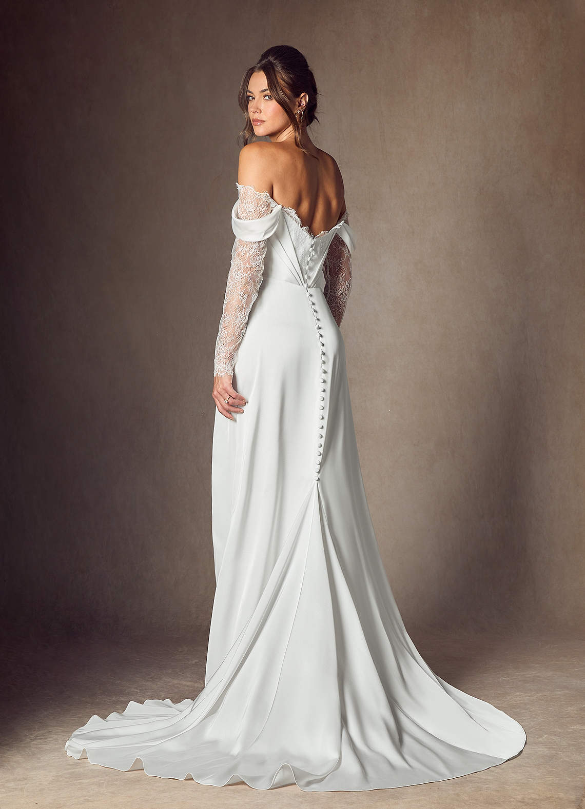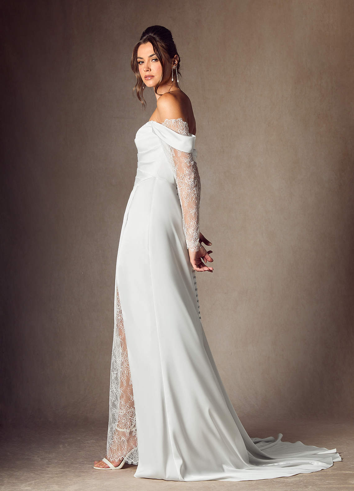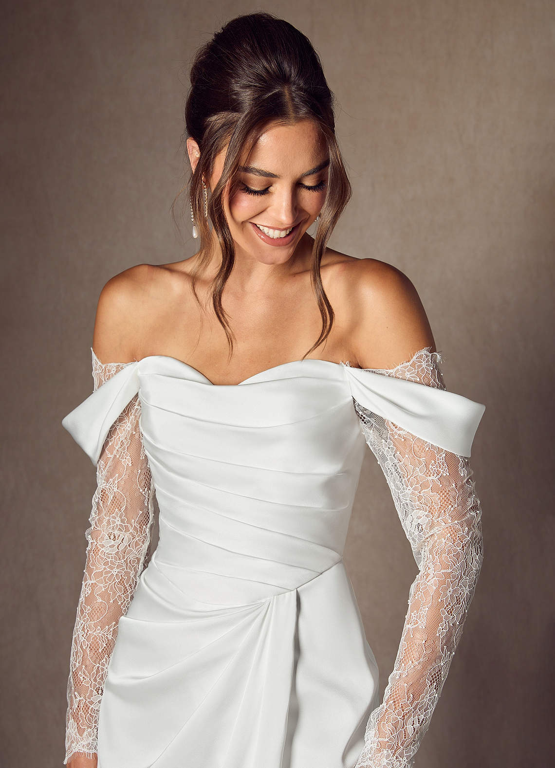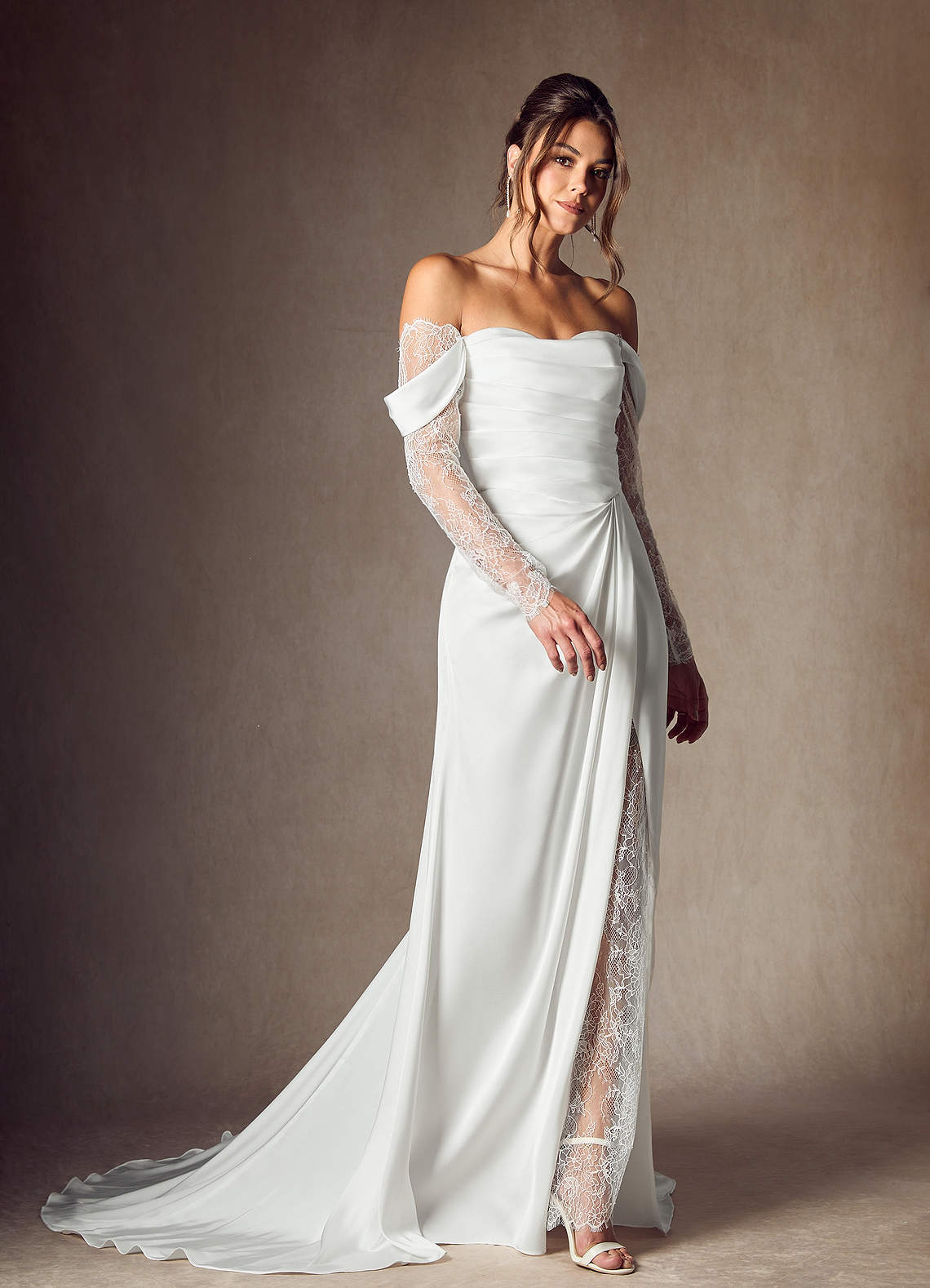 Entfesseln Sie Ihre weibliche Energie im Alexa-Kleid. Dieses romantische Modell aus Stretch-Satin und Spitze besticht durch einen herzförmigen Ausschnitt, schulterfreie Ärmel, durchgehende Falten und einen A-Linien-Rock mit Spitzenschlitz und Hofschleppe.