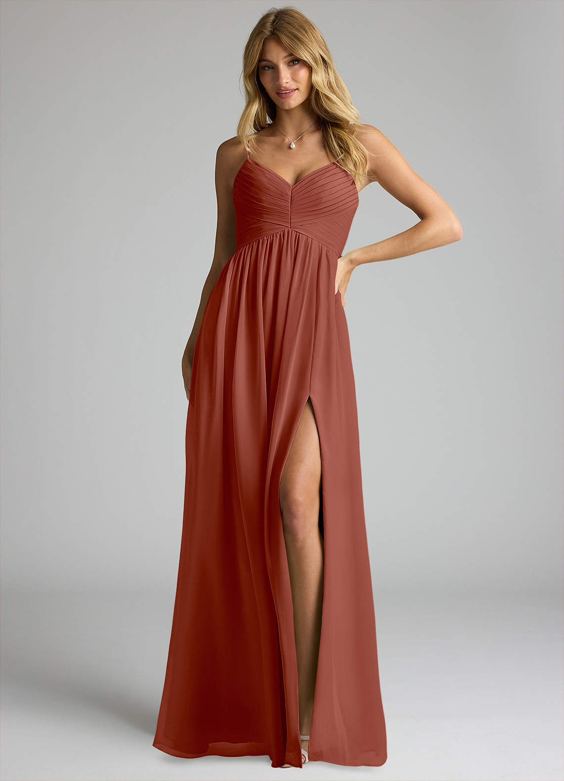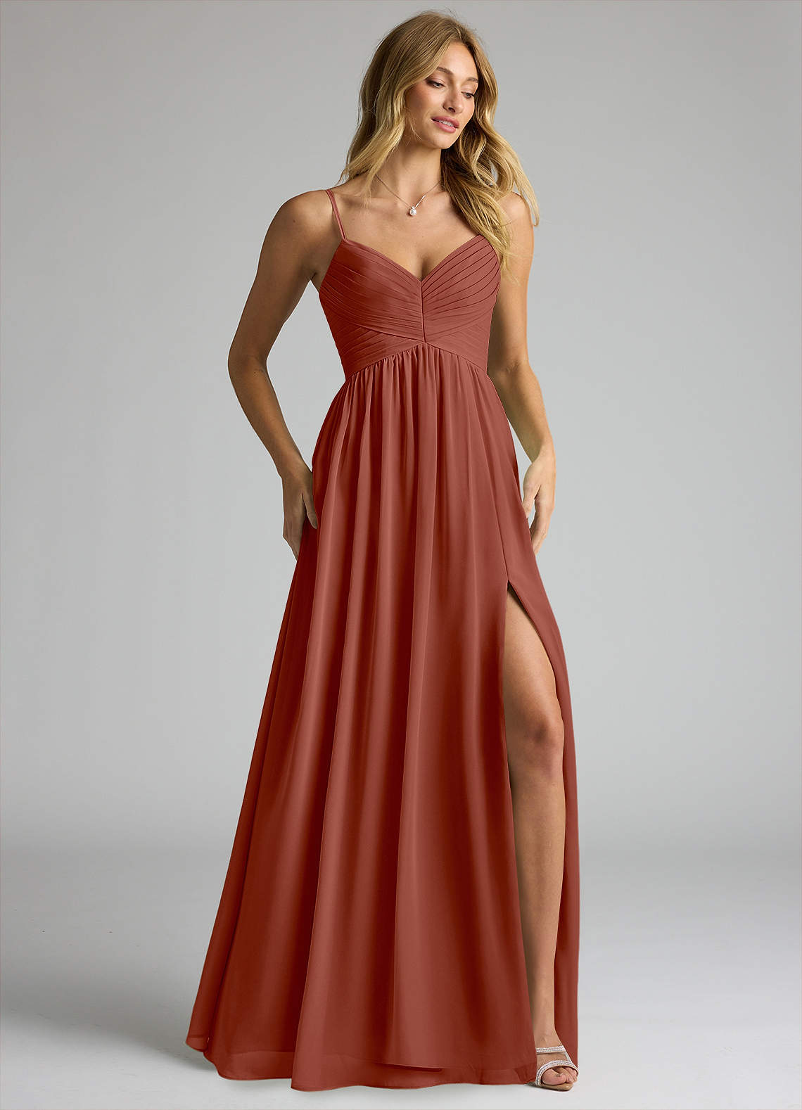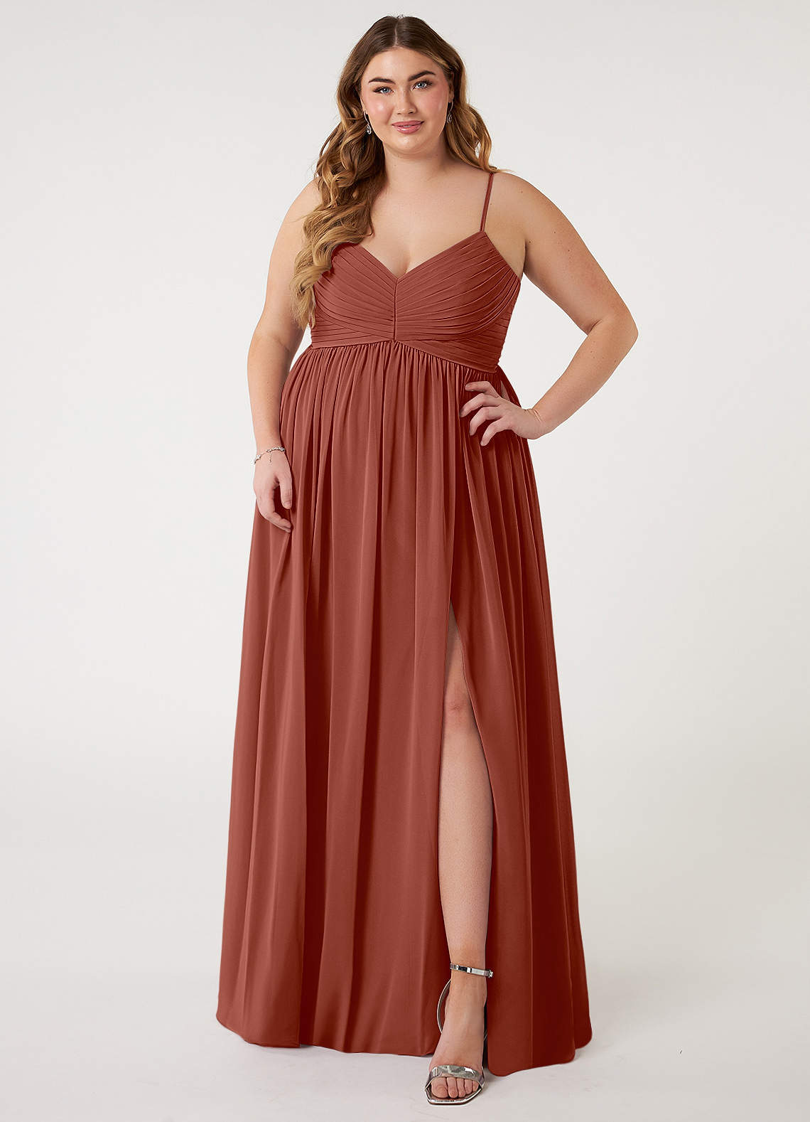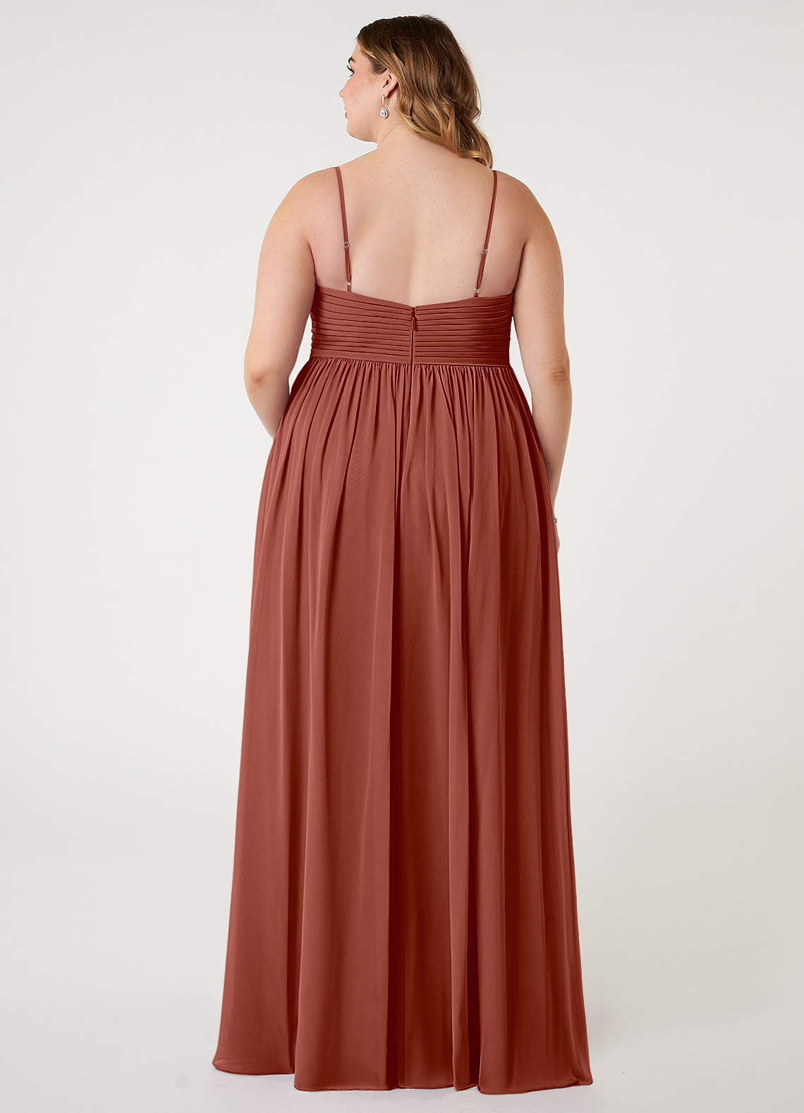 Alia ist unser Chiffonkleid mit perfekten Details für alle Ihre Brautjungfern. Ihr zart plissierter V-Ausschnitt wird von verstellbaren Spaghettiträgern gehalten, die über Ihre Schultern fallen. Die vordere Taille ist eine Empire-Naht, die auf einem fließenden, gerafften A-Linien-Rock mit einem vorderen Seitenschlitz sitzt. Wir haben auch Taschen hinzugefügt!