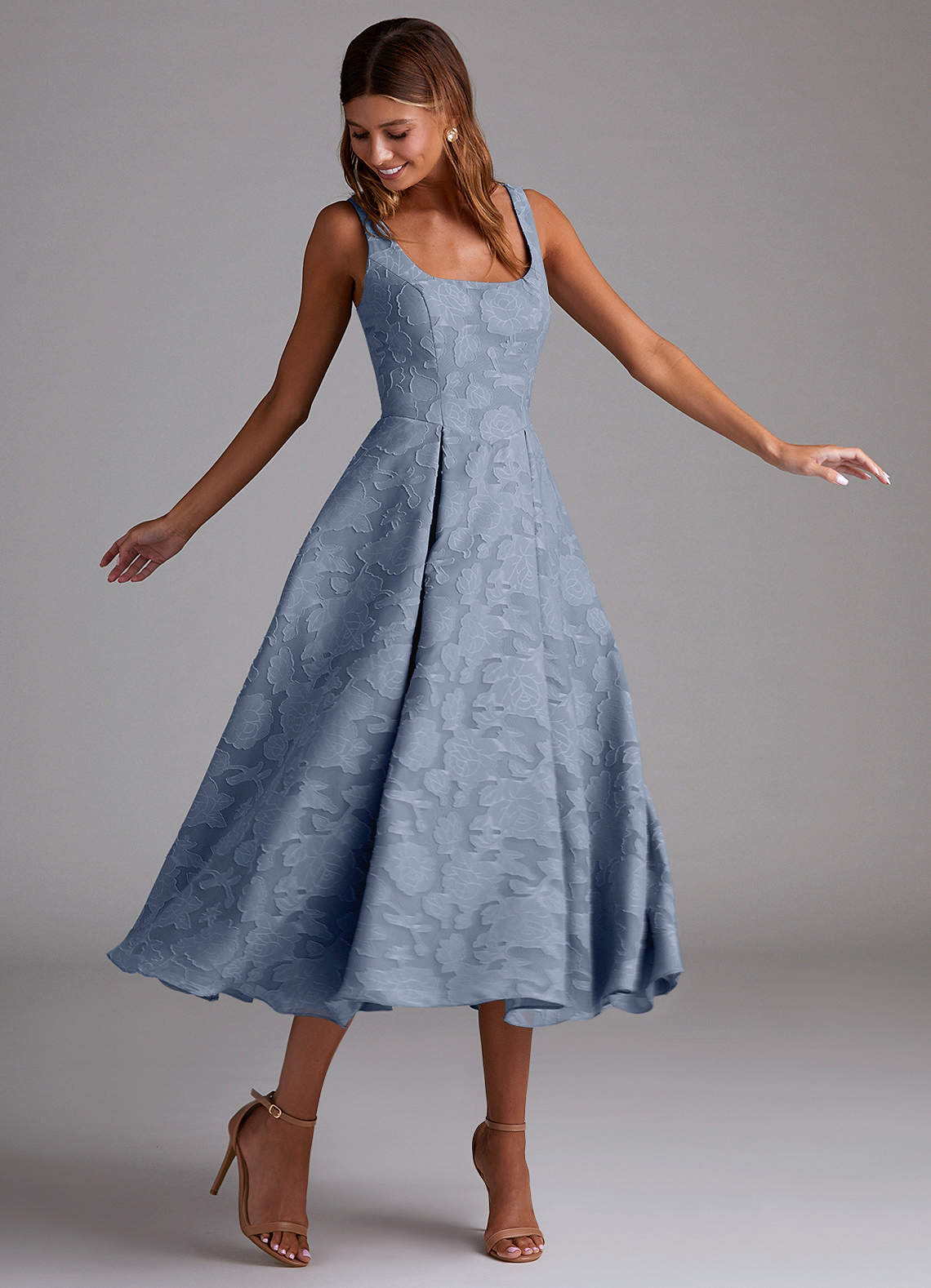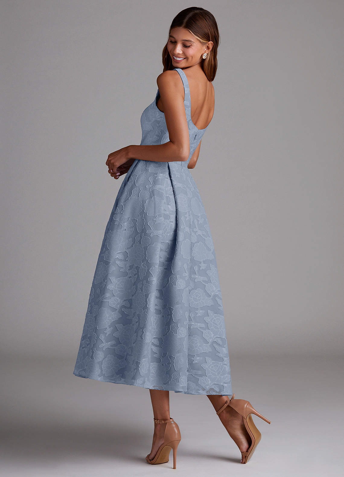 Unsere Brautjungfern Amalia ist aus unserem geblümten Burnout-Stoff in unserer klassischen A-Linien-Silhouette geschnitten. Sie hat einen eleganten Rundhalsausschnitt gepaart mit einer spitzen Taille. Der plissierte A-Linien-Rock ist knielang und mit versteckten Taschen versehen.