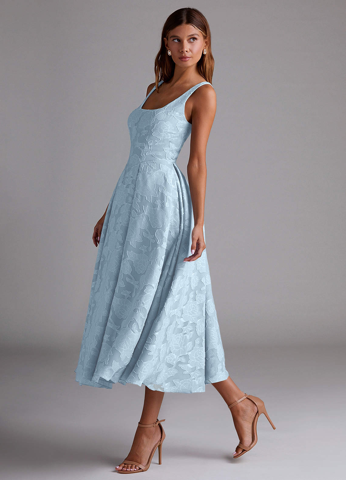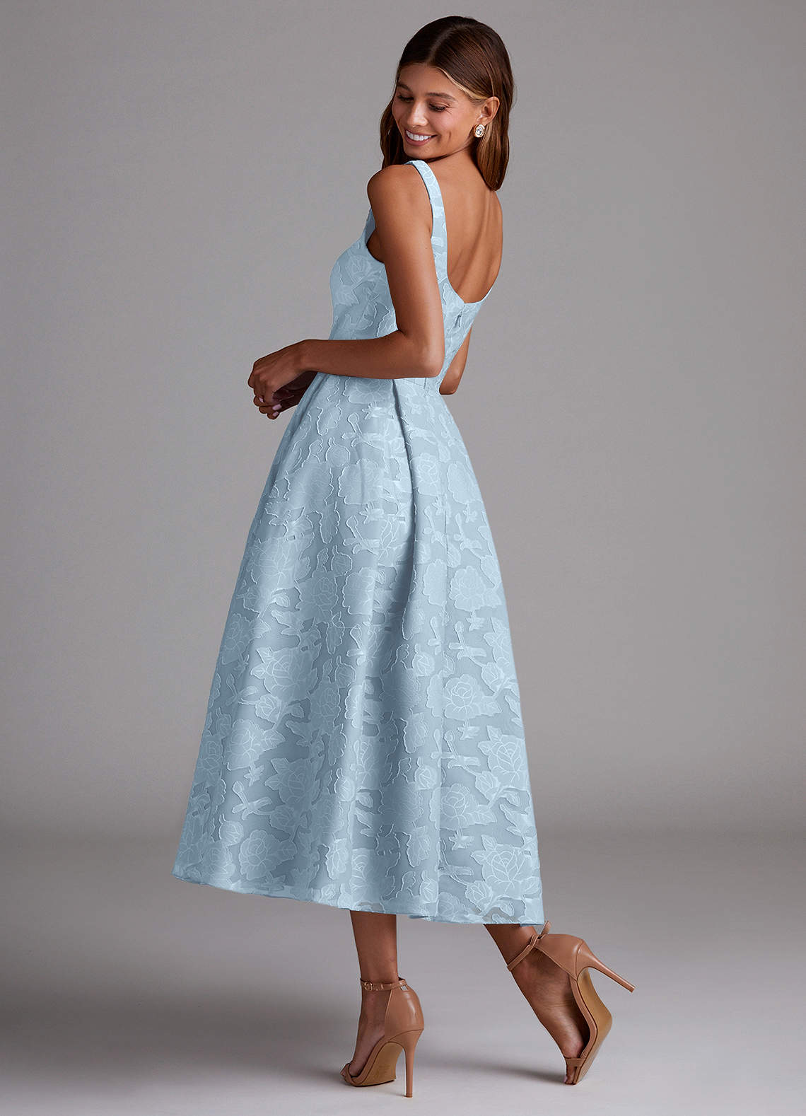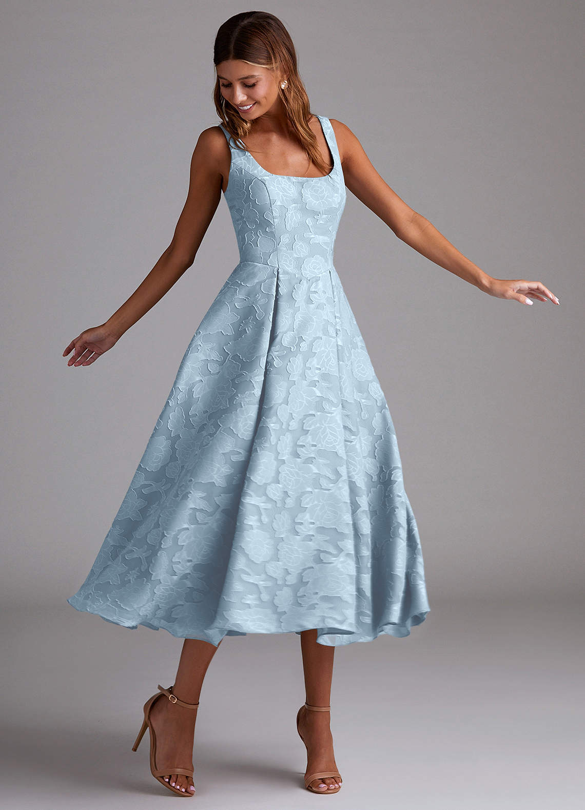 Unsere Brautjungfern Amalia ist aus unserem geblümten Burnout-Stoff in unserer klassischen A-Linien-Silhouette geschnitten. Sie hat einen eleganten Rundhalsausschnitt gepaart mit einer spitzen Taille. Der plissierte A-Linien-Rock ist knielang und mit versteckten Taschen versehen.