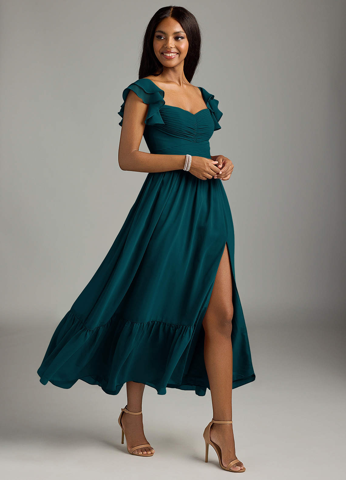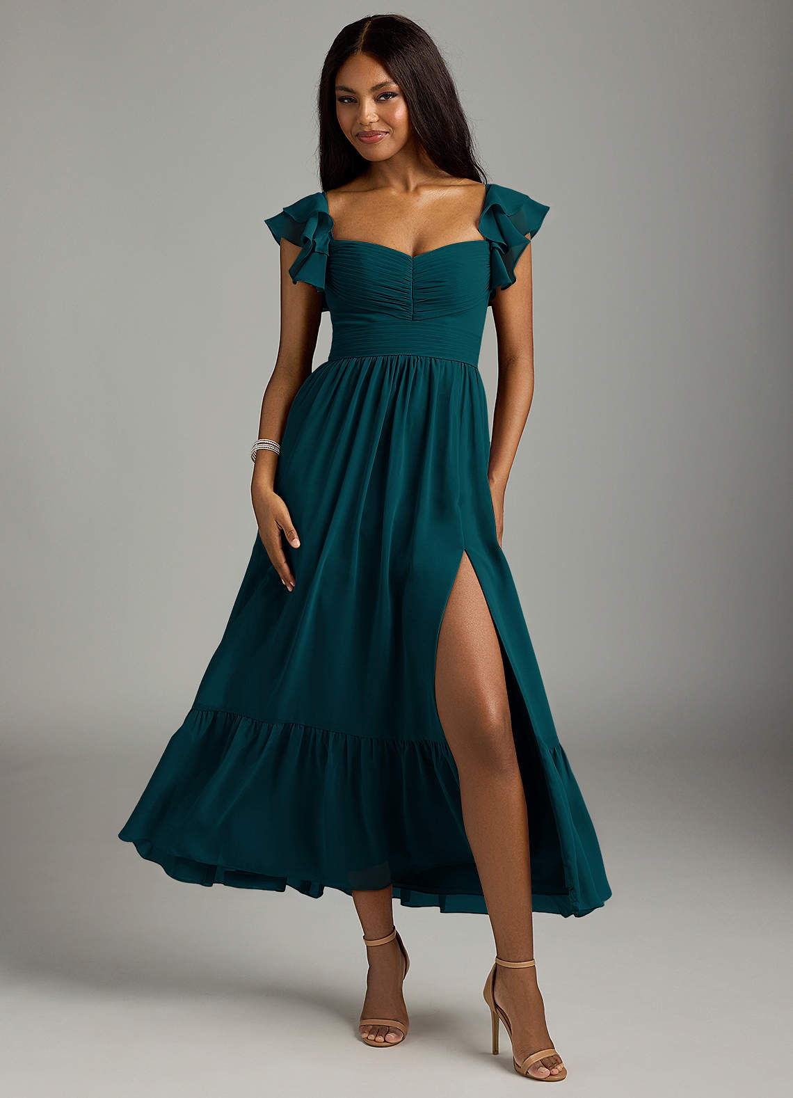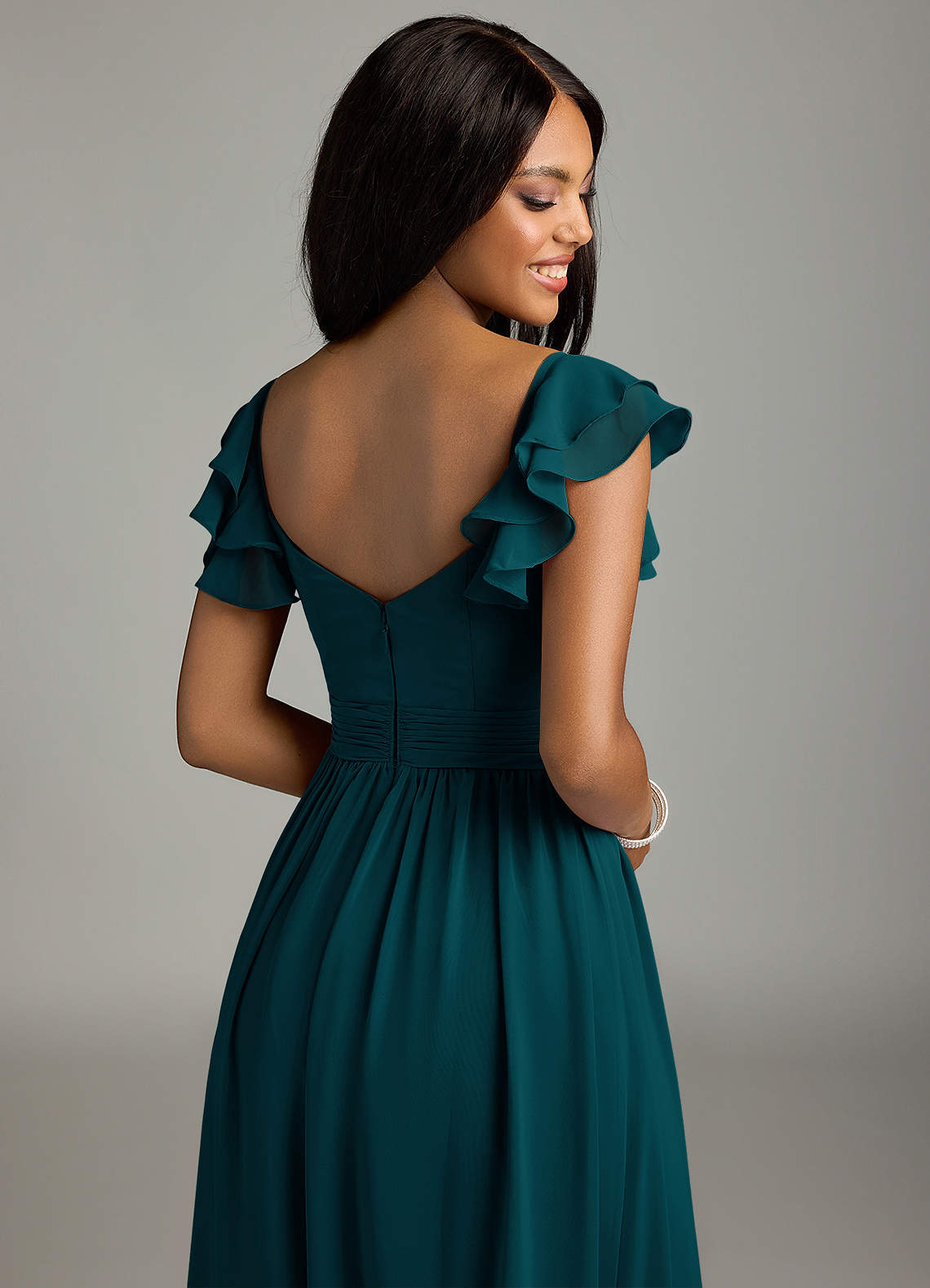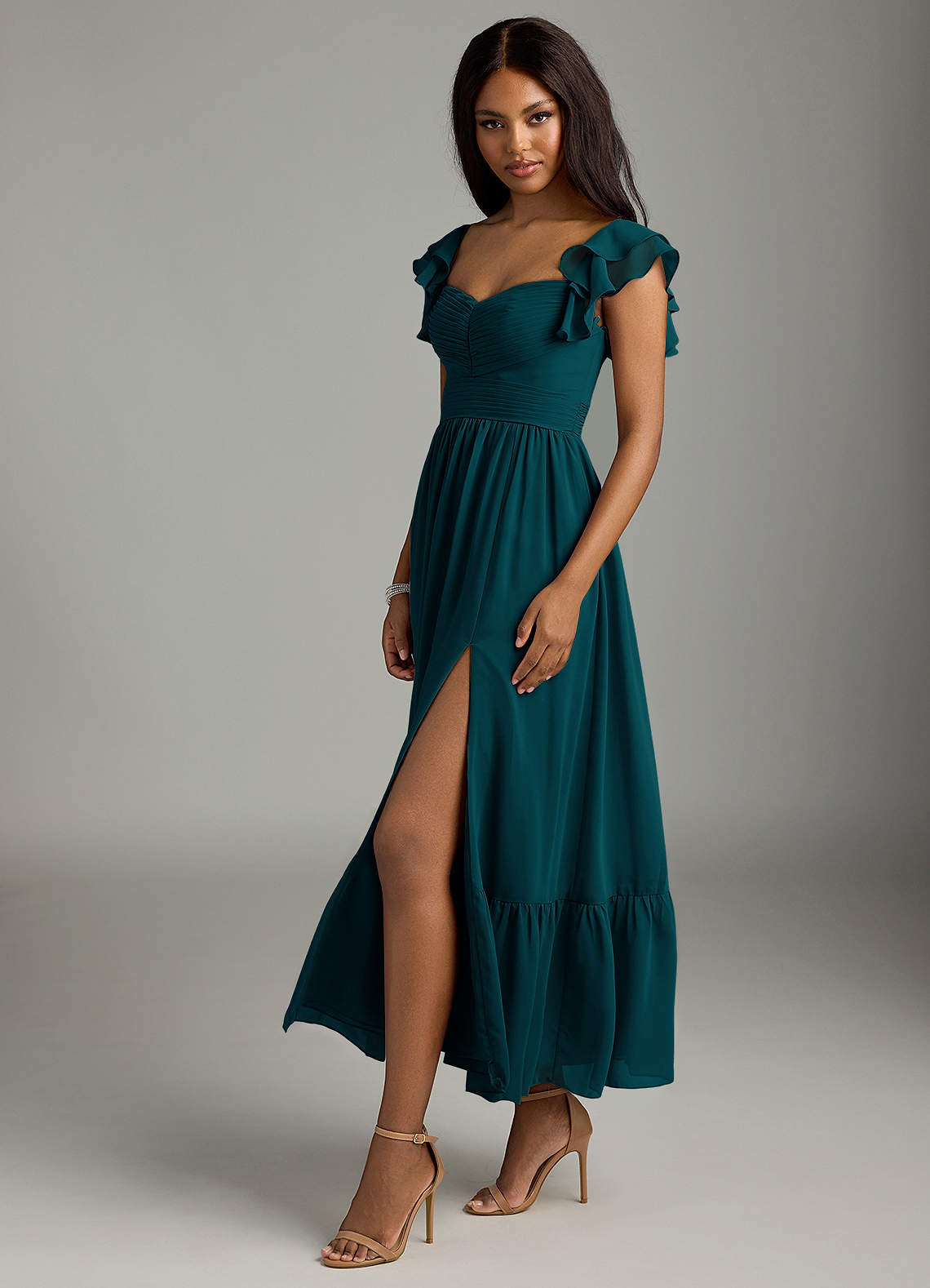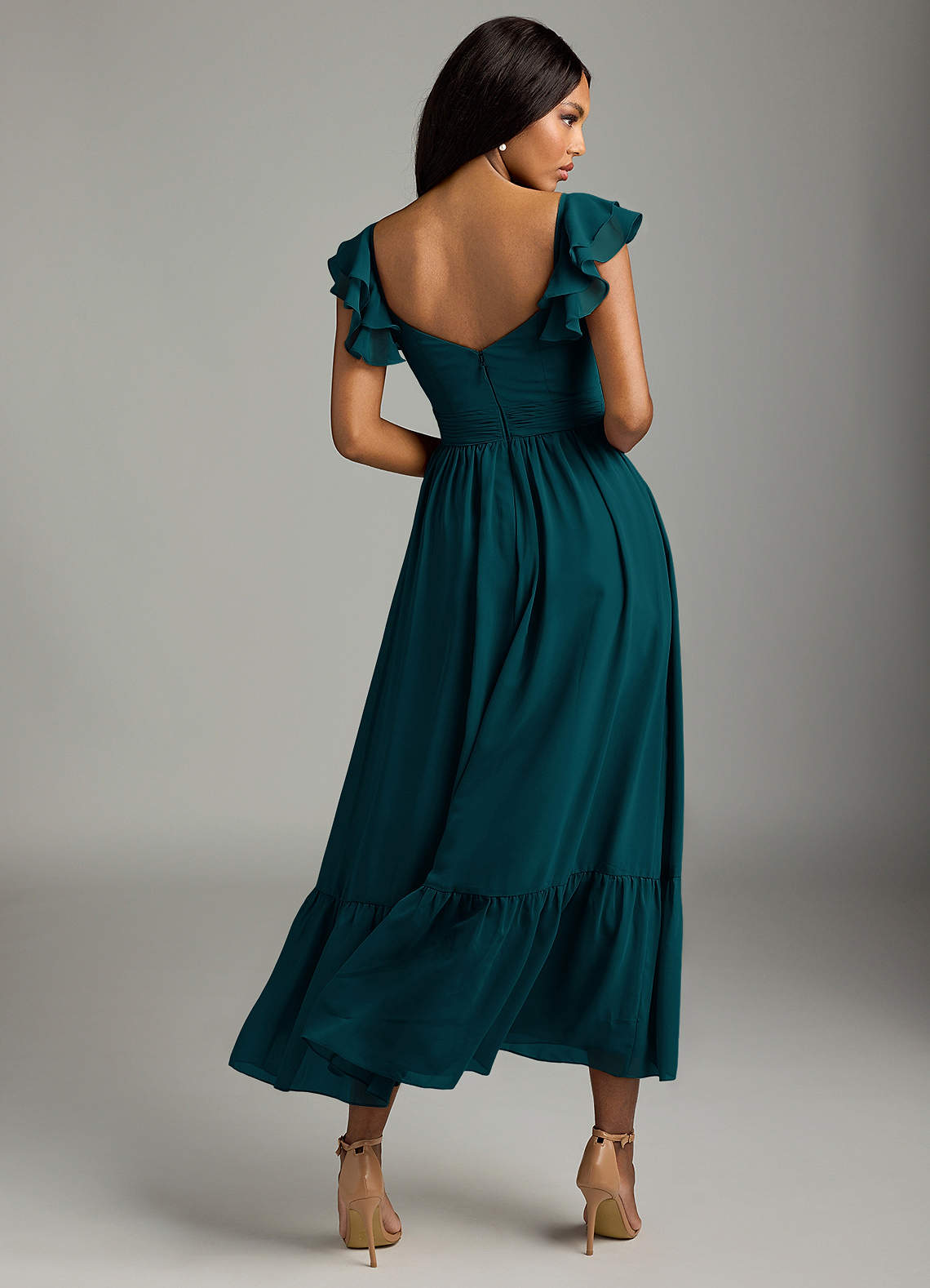 Tanzen Sie die ganze Nacht durch in Anaya, unserem Chiffonkleid in Ballerinalänge. Es hat einen schmeichelnden V-Ausschnitt, ein Faltenmuster entlang des Oberteils, Rüschenärmel, einen V-Ausschnitt am Rücken, Rüschen entlang der Rocktaille, einen A-Linienrock mit Rüschen und einen atemberaubenden Beinschlitz.