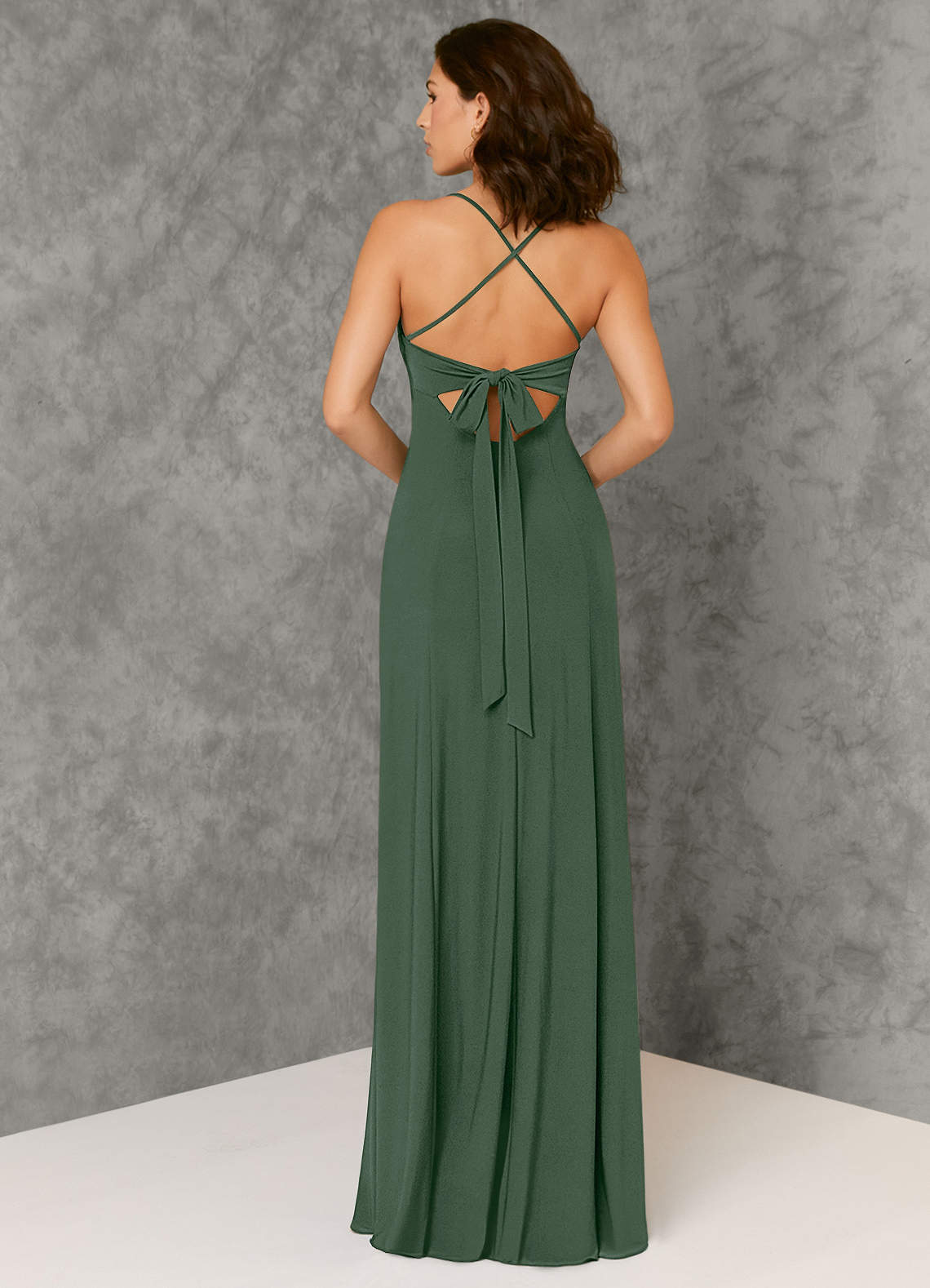 Aubrianna ist unser wunderschönes Brautjungfernkleid aus luxuriösem Strick. Sie hat einen plissierten Wasserfallausschnitt gepaart mit überkreuzten Spaghettiträgern, die zu einem Bindeband am Rücken führen. Der Look wird durch einen Rock in A-Linie und einen Beinschlitz abgerundet.