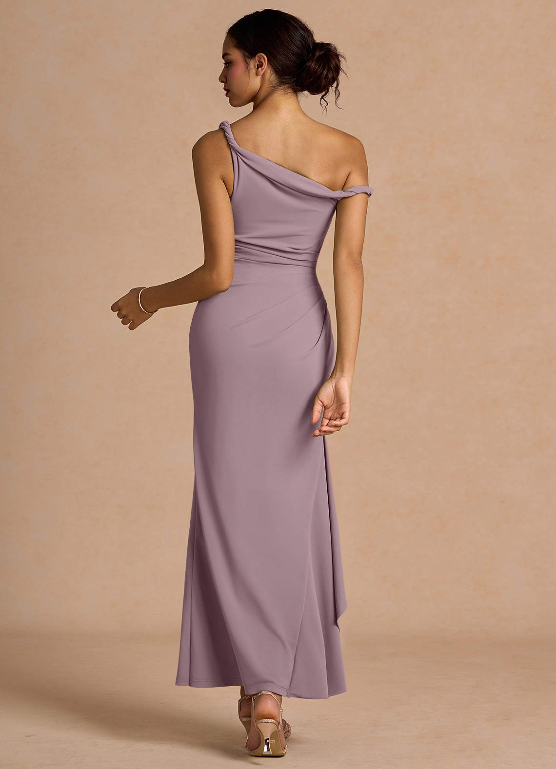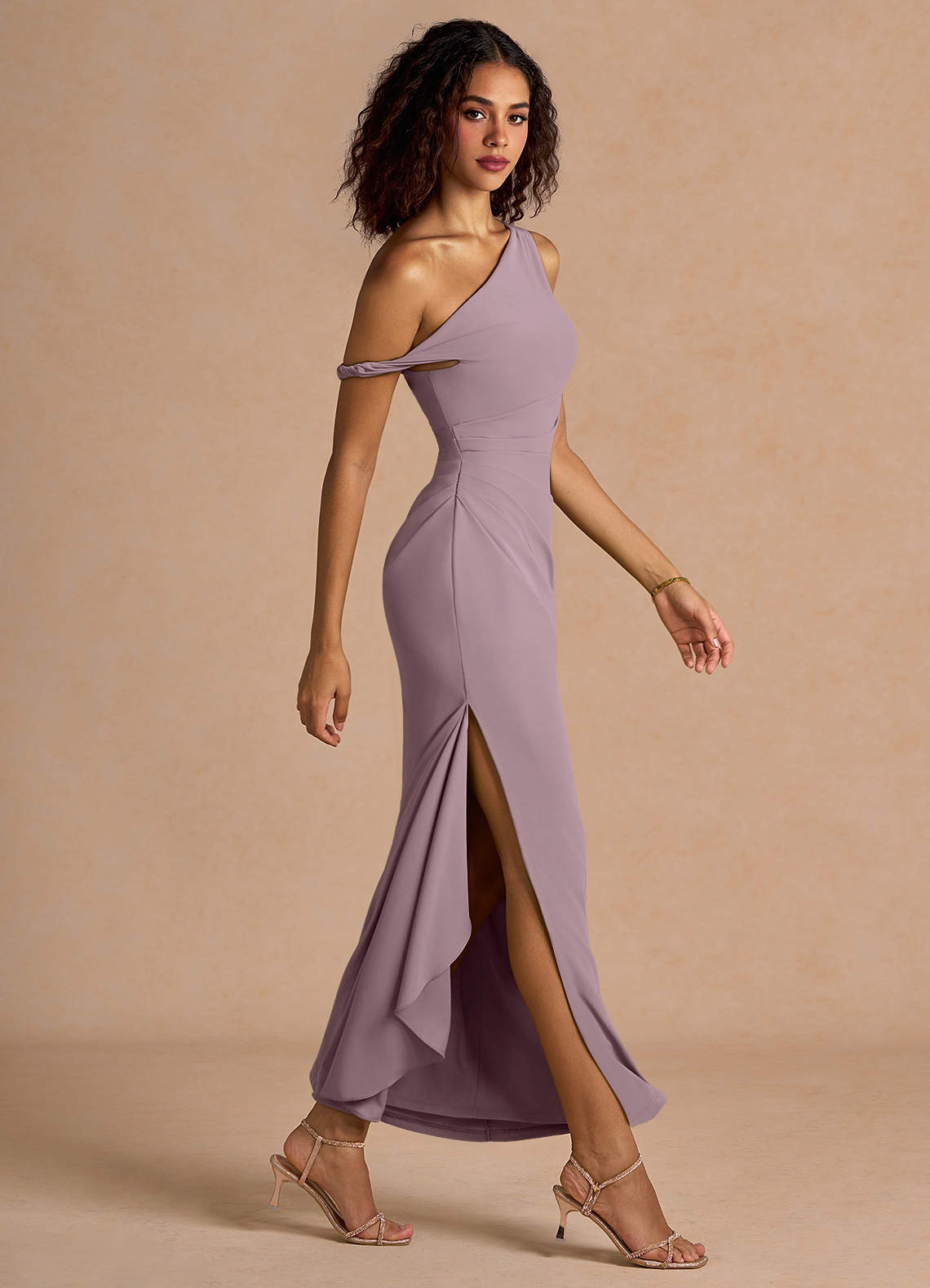 Schmeichelndes, figurbetontes Kleid mit plissierter Taille, gerüschtem, hohem Schlitz und wandelbarem Off-Shoulder-Ausschnitt. Hergestellt aus hochwertigem Stretch-Stoff für Komfort und Eleganz – ideal für Hochzeiten, formelle Anlässe oder den schicken Alltag.