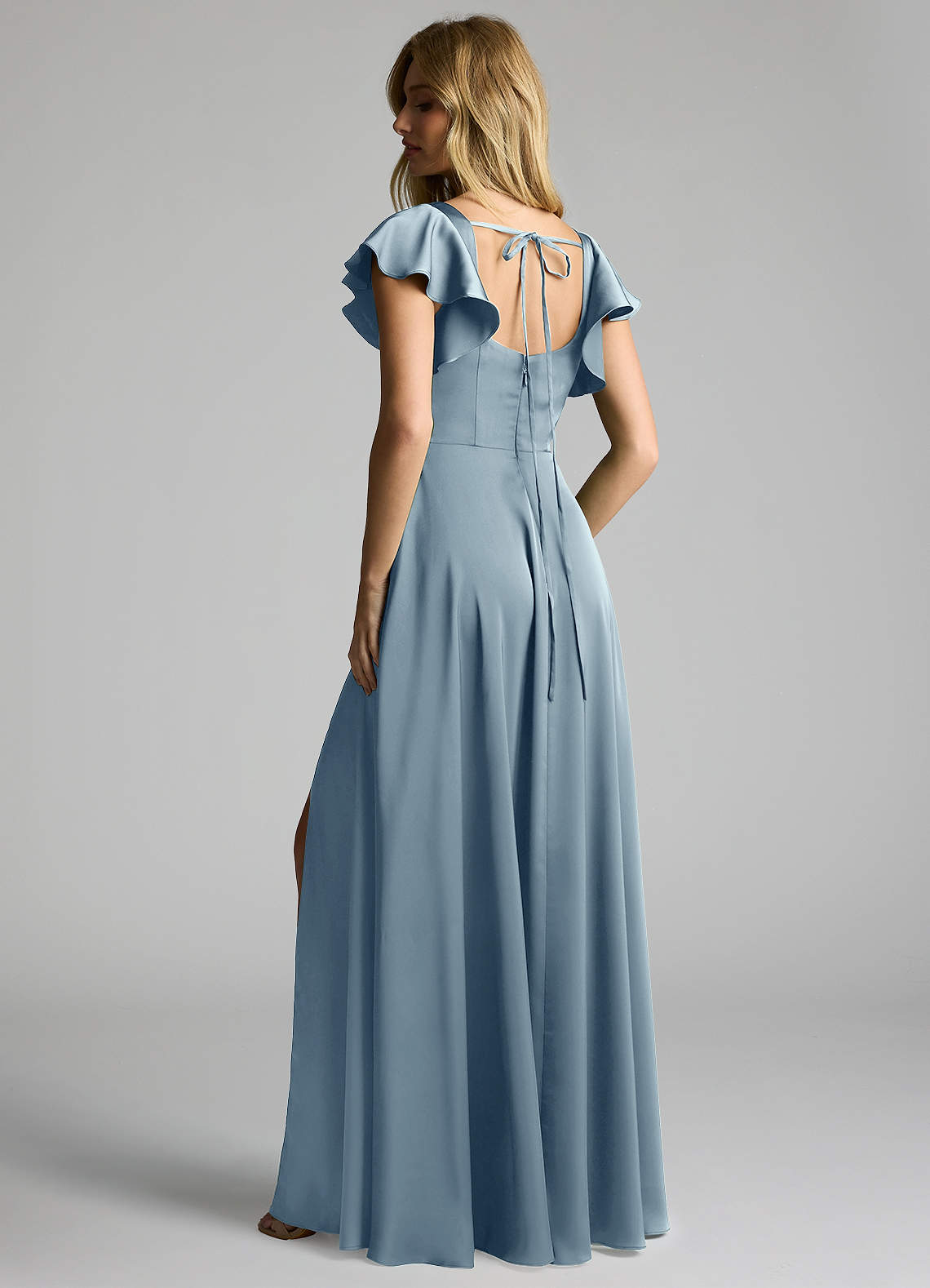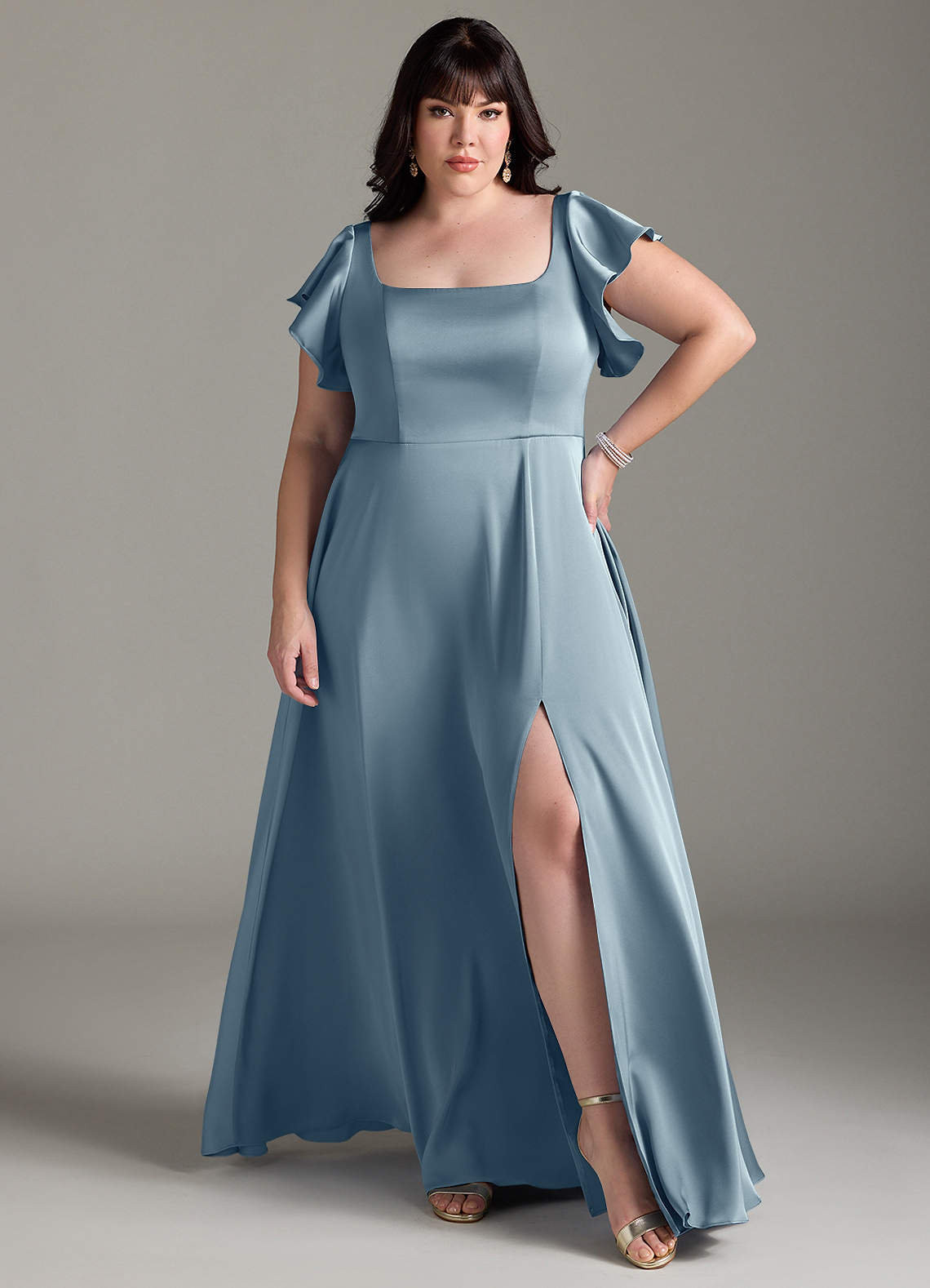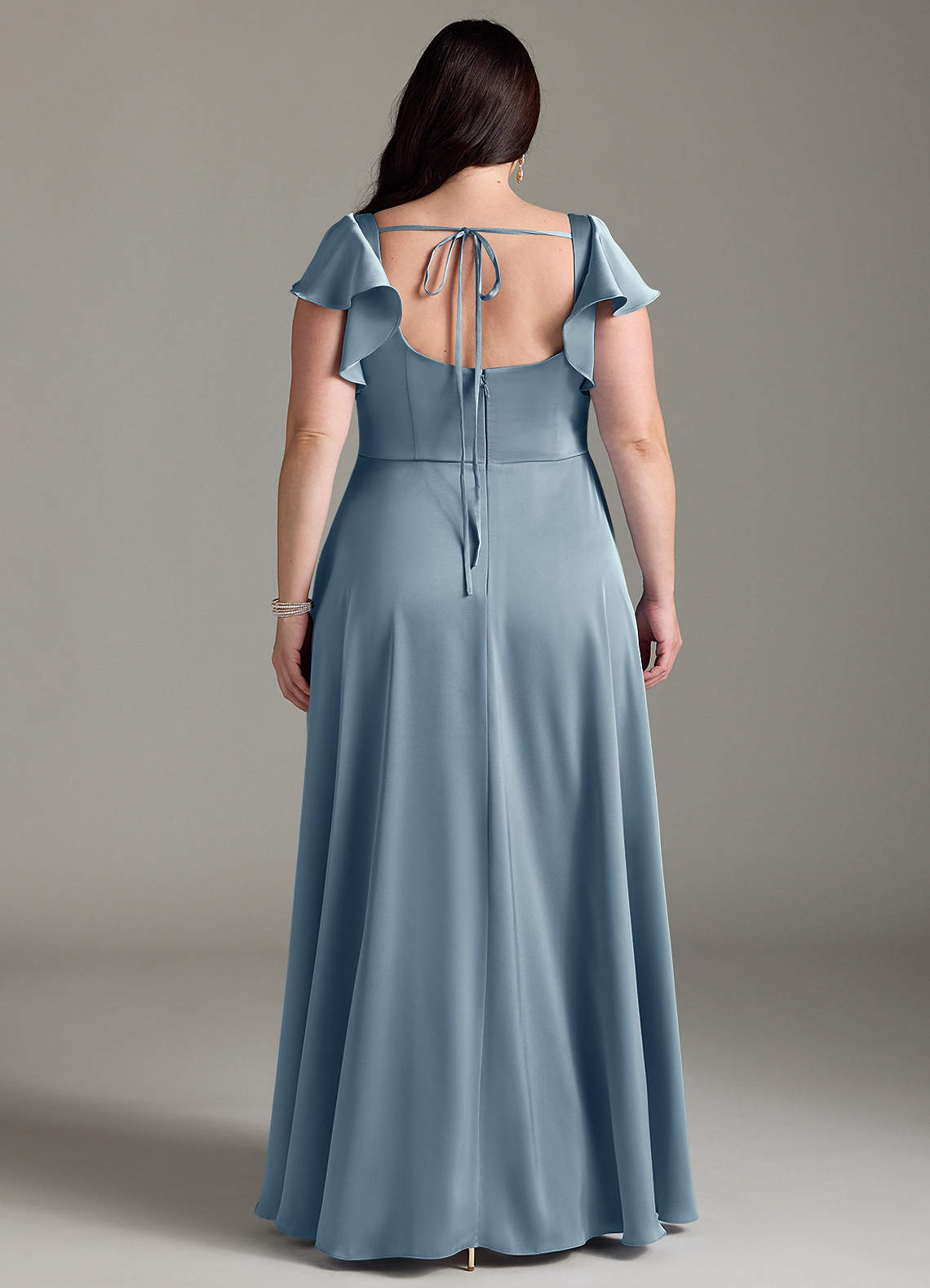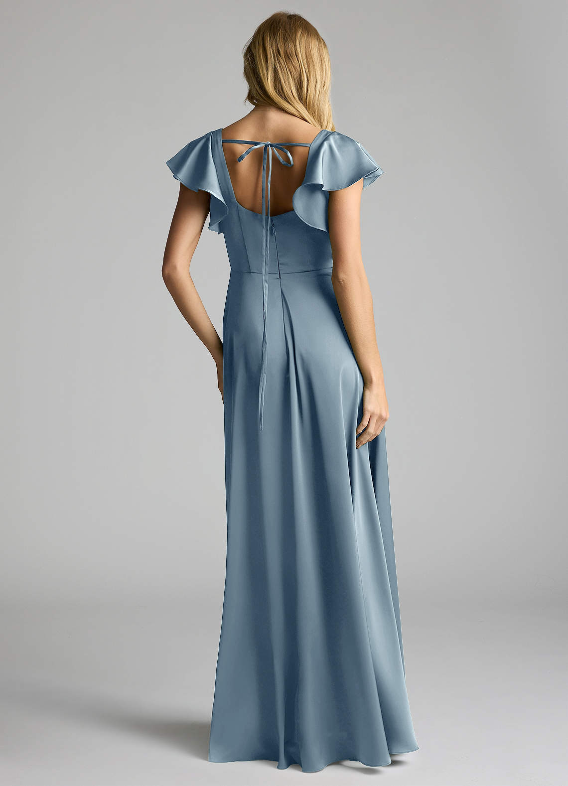 Bondi ist unser wunderschönes Brautjungfernkleid aus Stretch-Satin. Es hat einen quadratischen Ausschnitt mit Flügelärmeln und einen U-Boot-Rücken zum Binden. Der Look wird durch einen A-Linien-Rock mit Beinschlitz komplettiert.