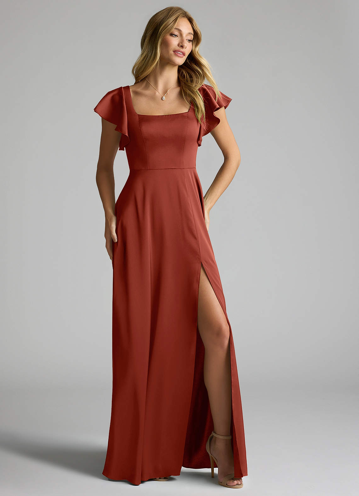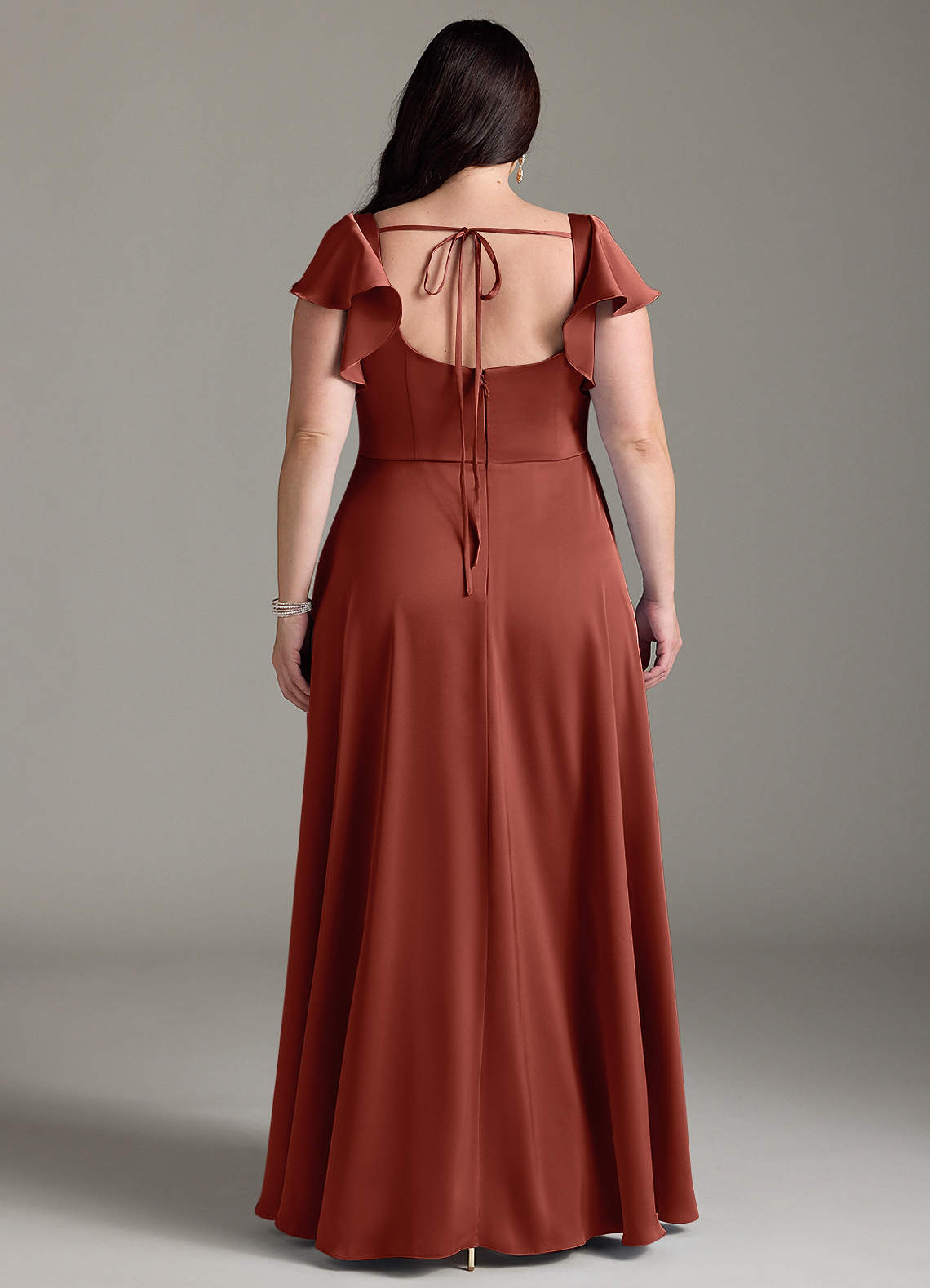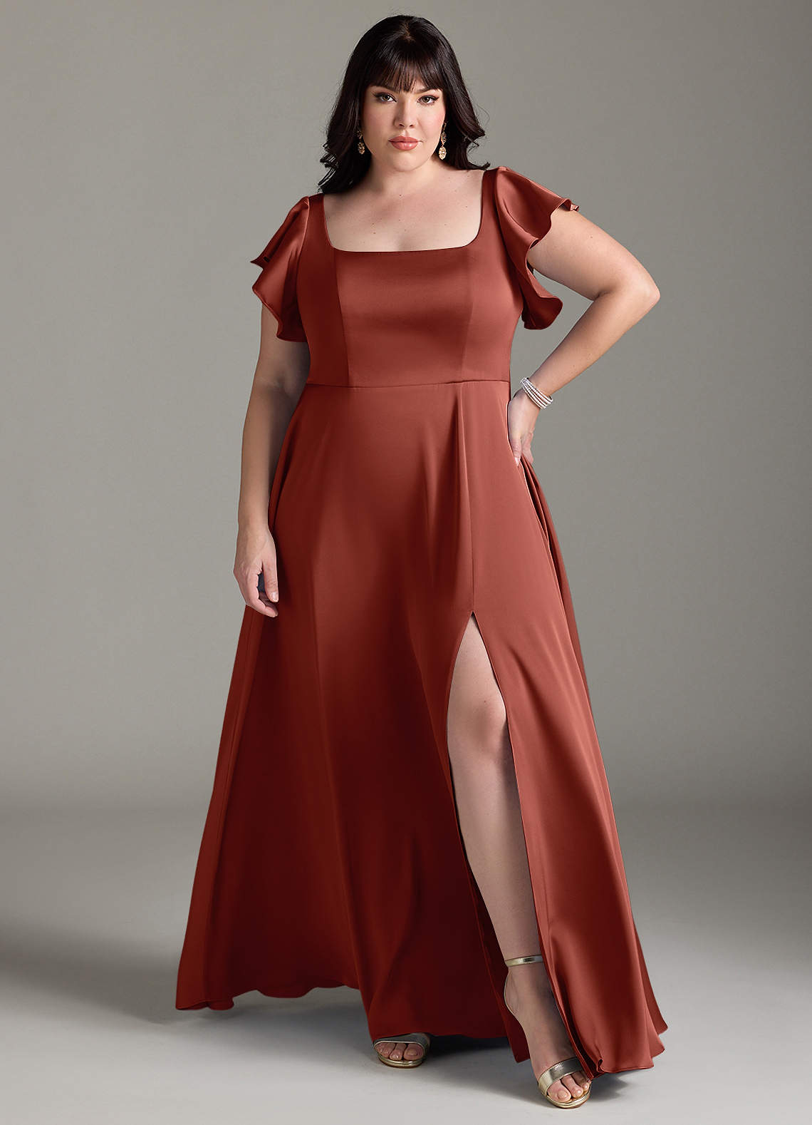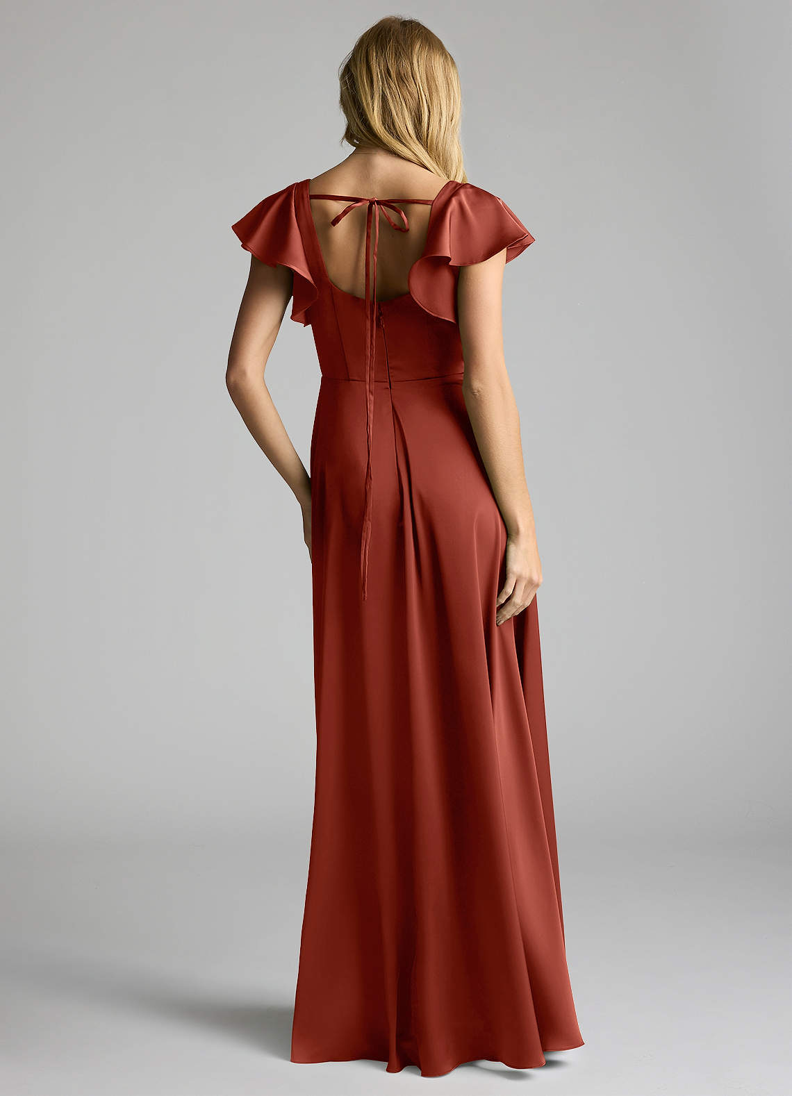 Bondi ist unser wunderschönes Brautjungfernkleid aus Stretch-Satin. Es hat einen quadratischen Ausschnitt mit Flügelärmeln und einen U-Boot-Rücken zum Binden. Der Look wird durch einen A-Linien-Rock mit Beinschlitz komplettiert.
