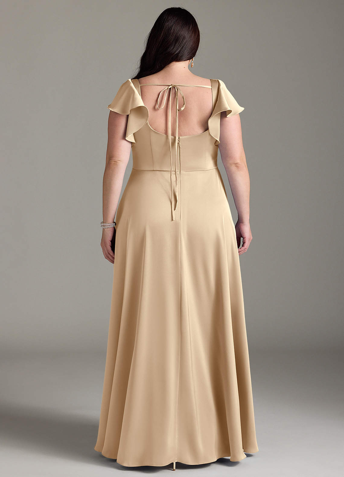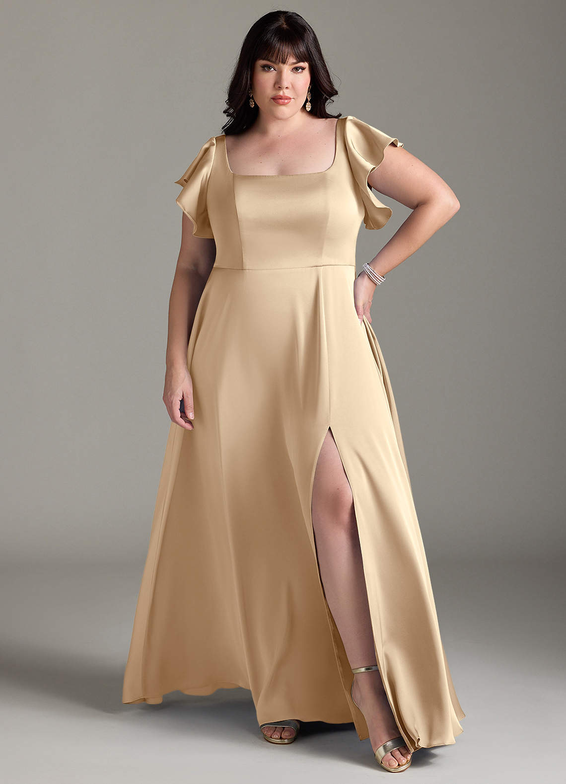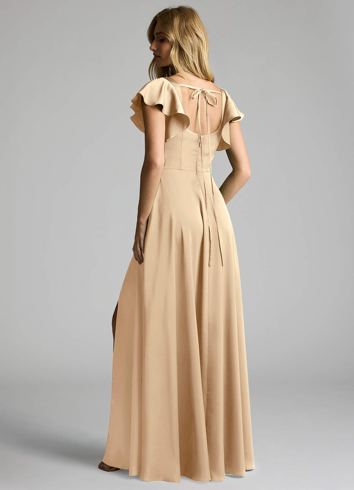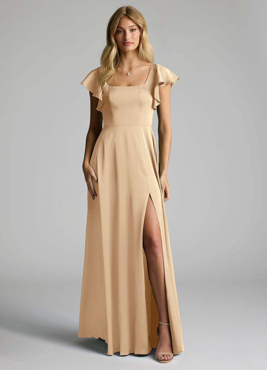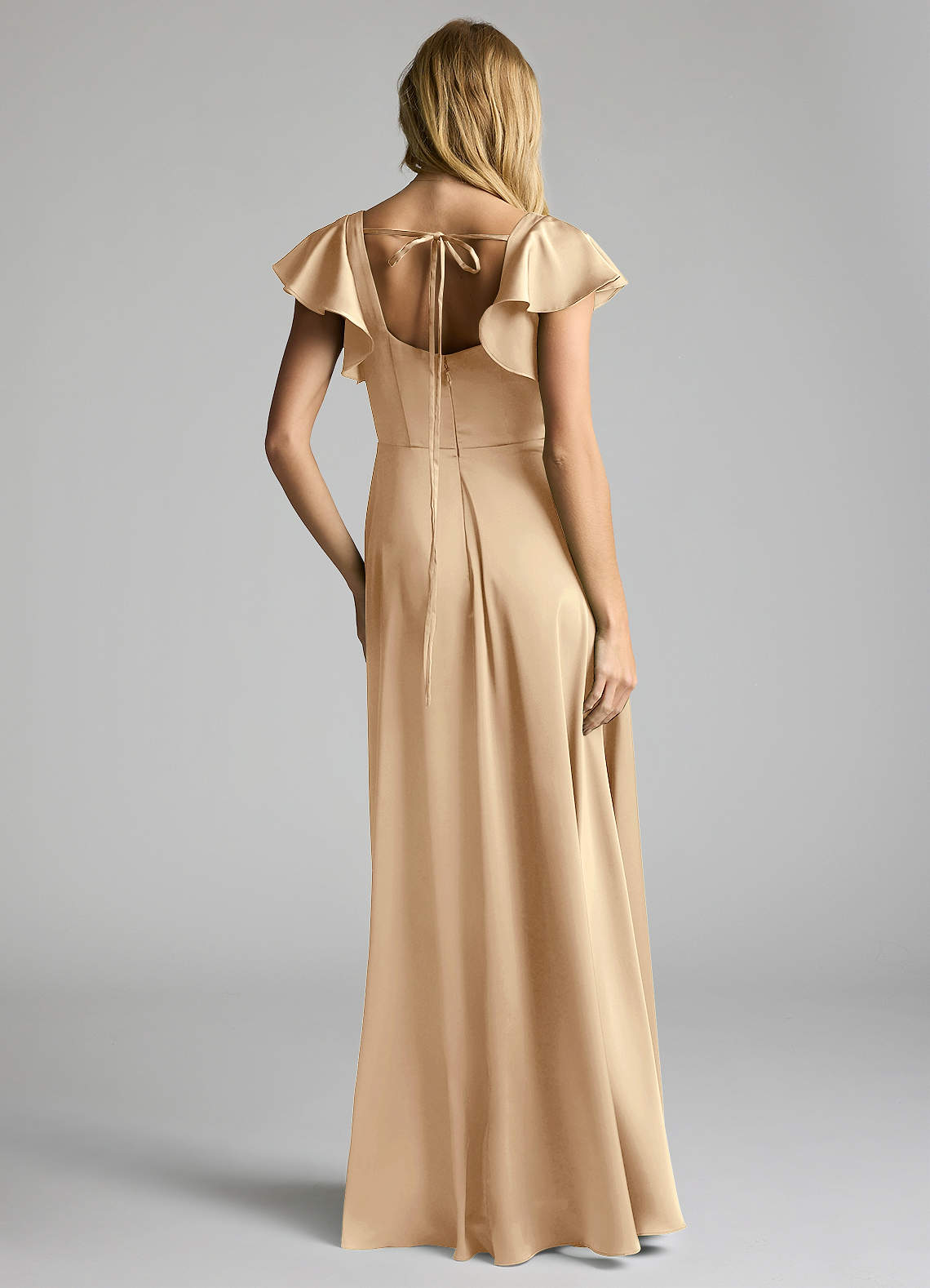 Bondi ist unser wunderschönes Brautjungfernkleid aus Stretch-Satin. Es hat einen quadratischen Ausschnitt mit Flügelärmeln und einen U-Boot-Rücken zum Binden. Der Look wird durch einen A-Linien-Rock mit Beinschlitz komplettiert.