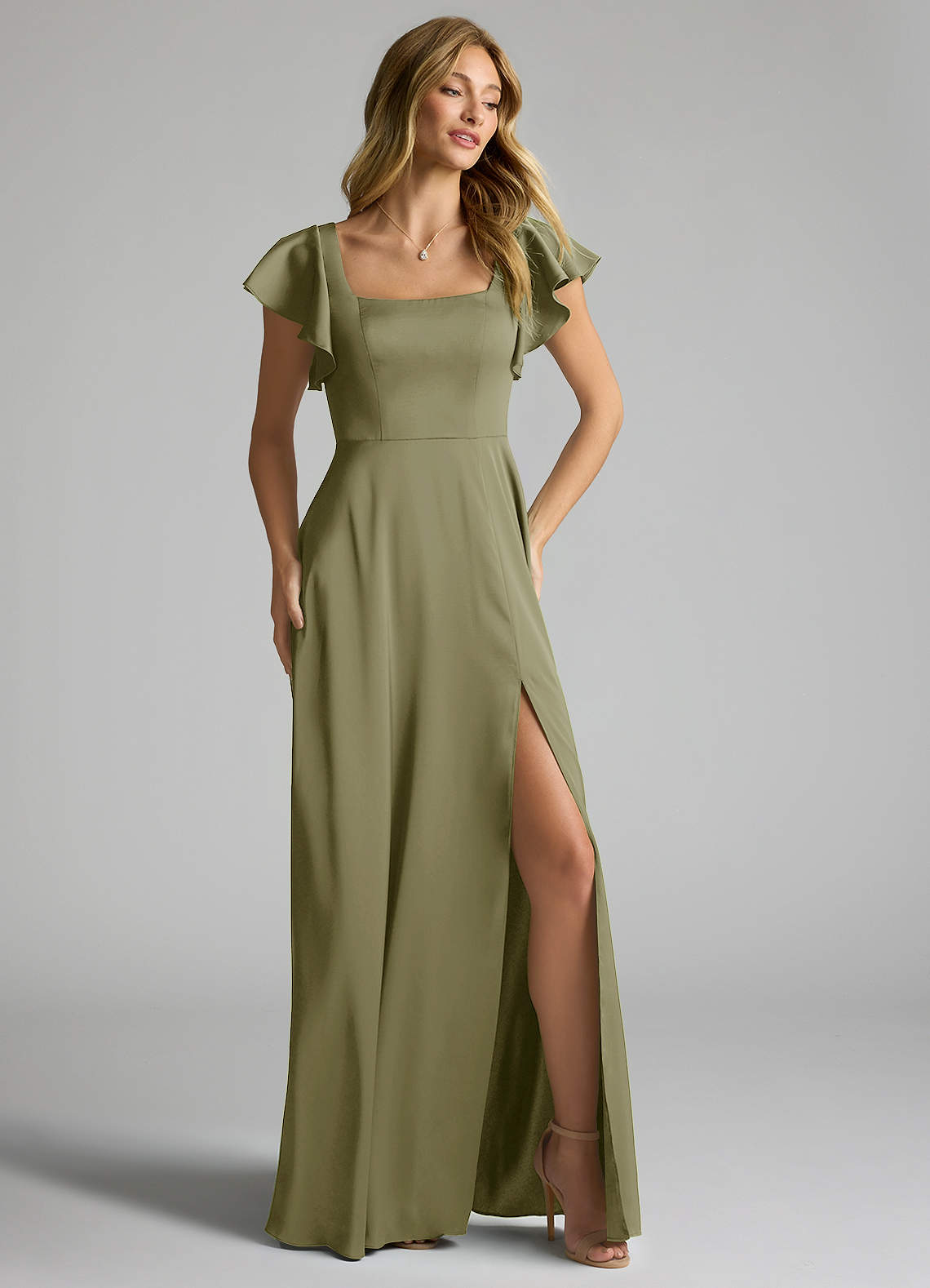 Bondi ist unser wunderschönes Brautjungfernkleid aus Stretch-Satin. Es hat einen quadratischen Ausschnitt mit Flügelärmeln und einen U-Boot-Rücken zum Binden. Der Look wird durch einen A-Linien-Rock mit Beinschlitz komplettiert.