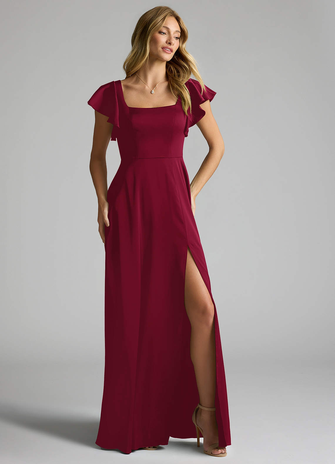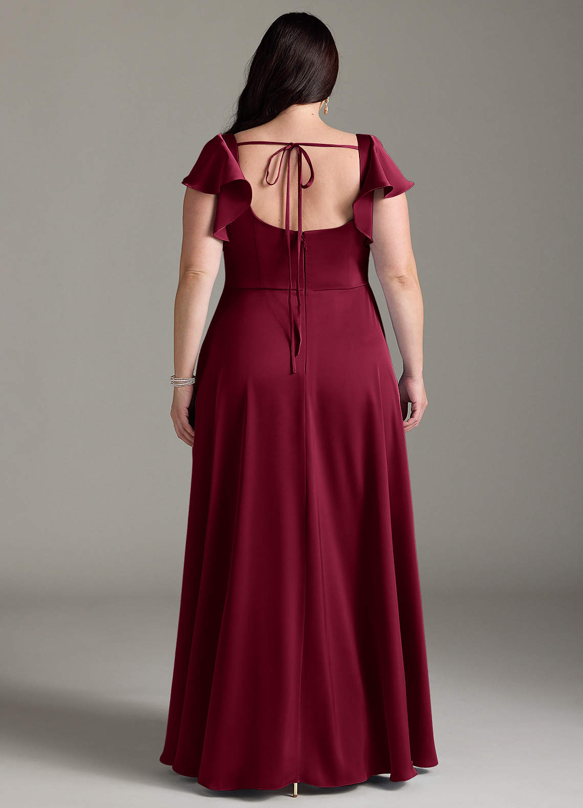 Bondi ist unser wunderschönes Brautjungfernkleid aus Stretch-Satin. Es hat einen quadratischen Ausschnitt mit Flügelärmeln und einen U-Boot-Rücken zum Binden. Der Look wird durch einen A-Linien-Rock mit Beinschlitz komplettiert.