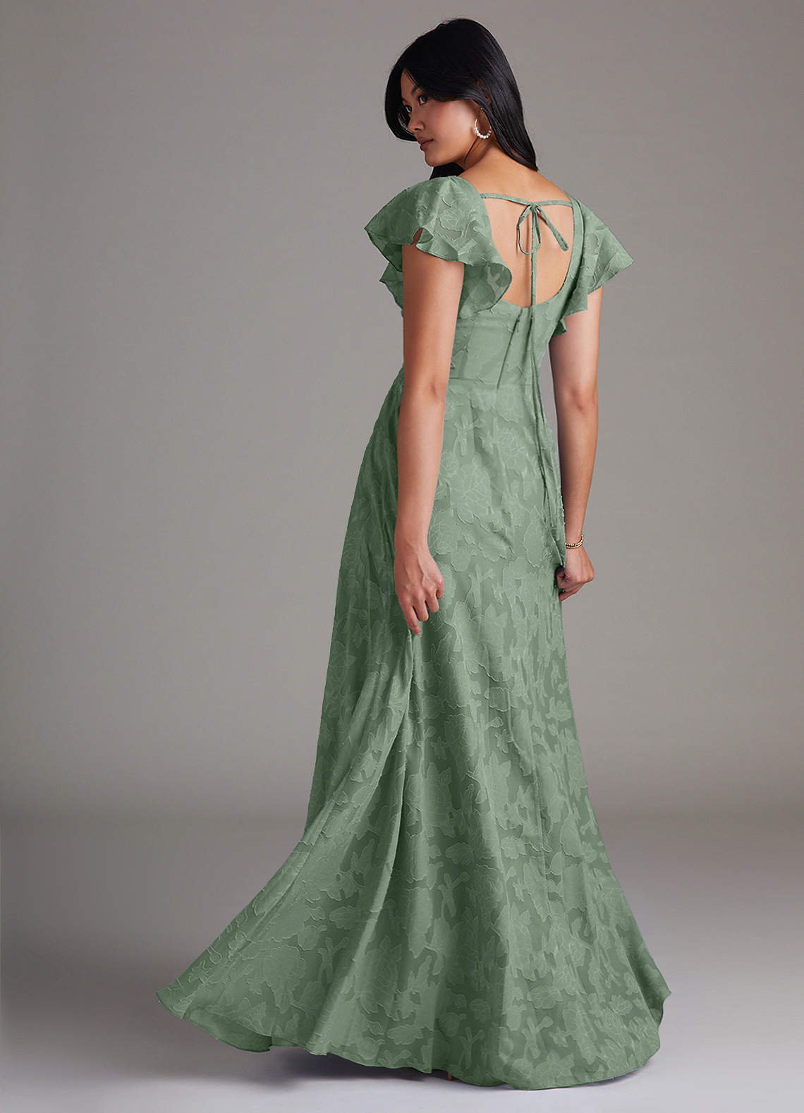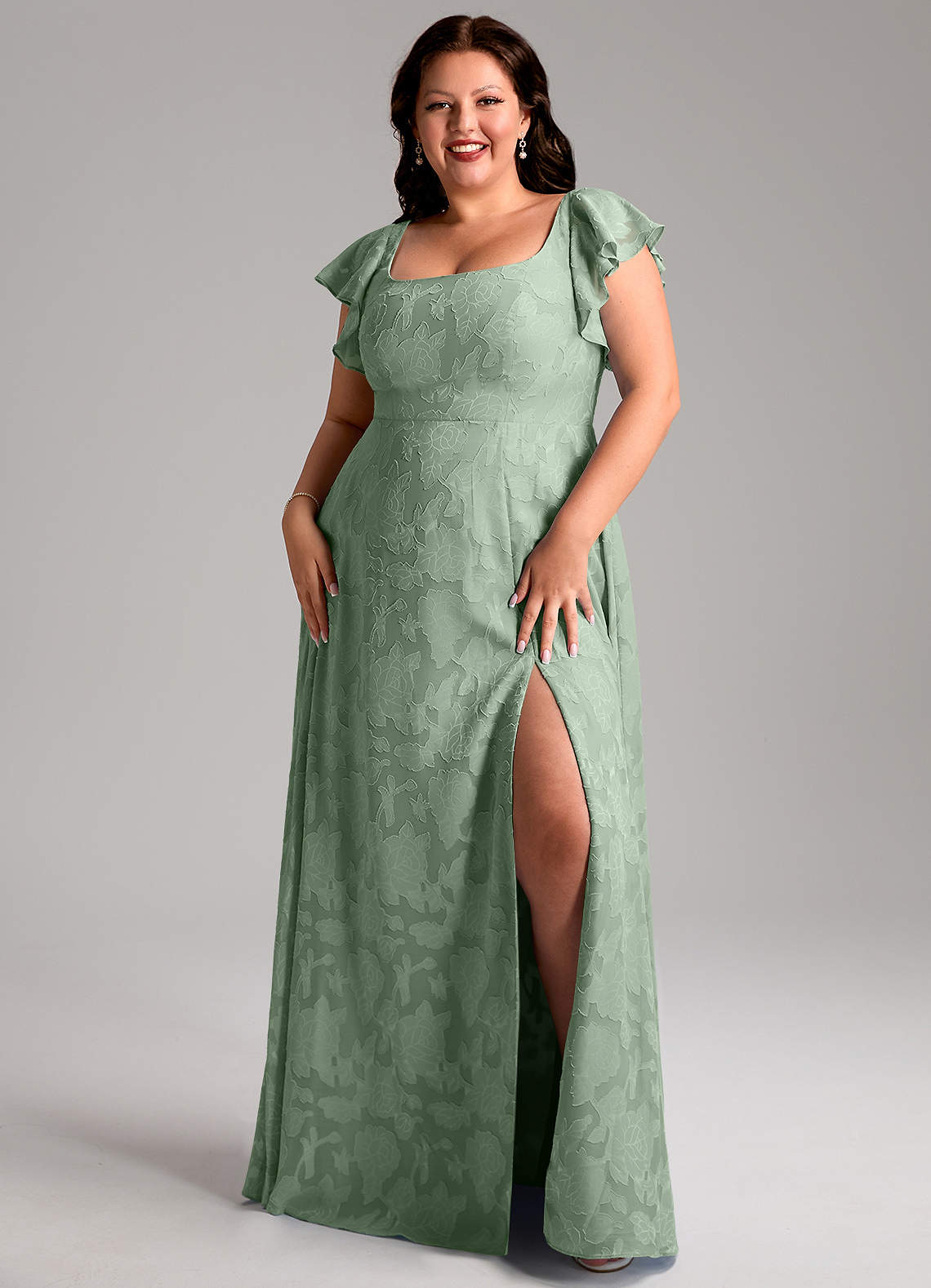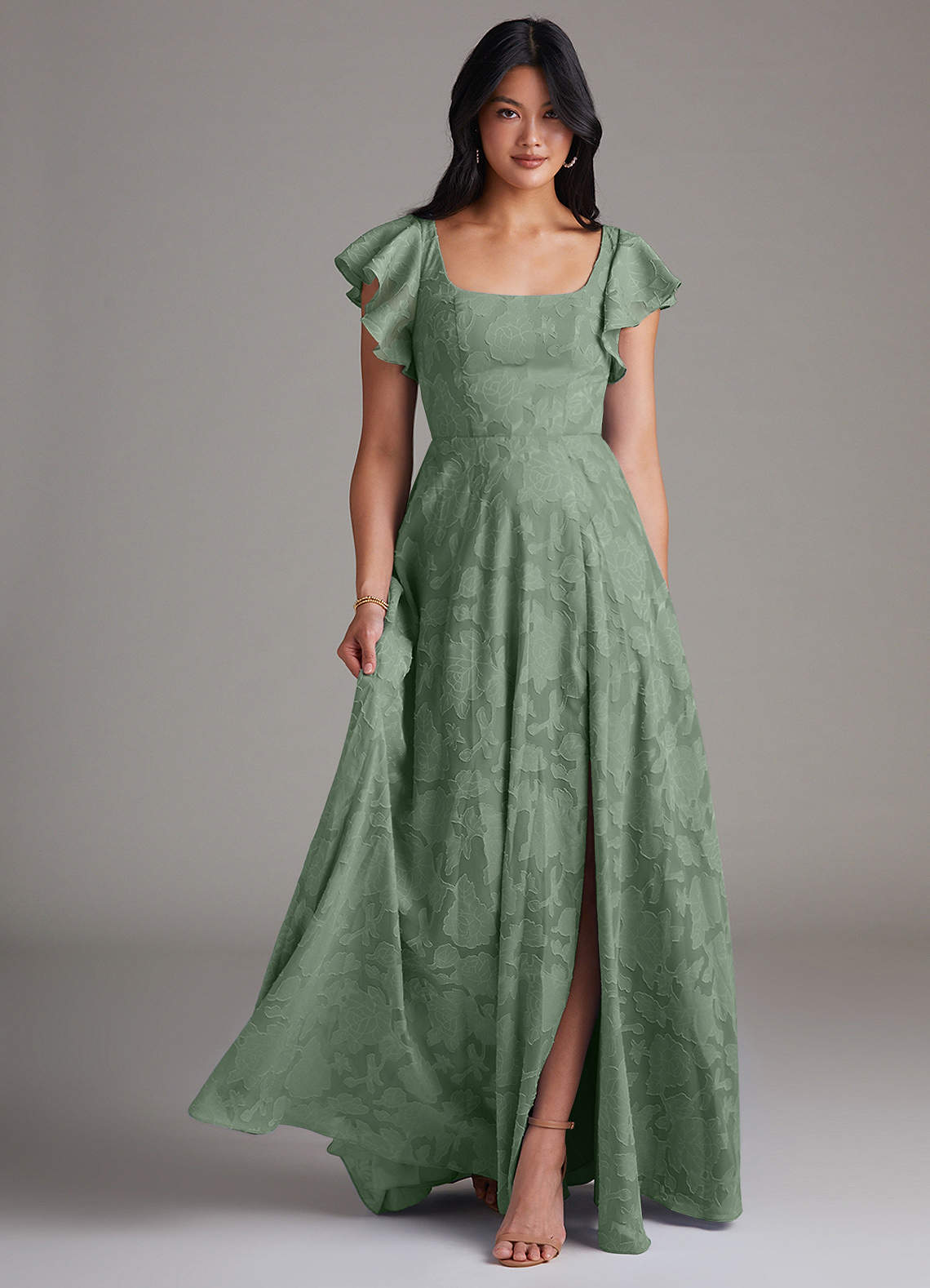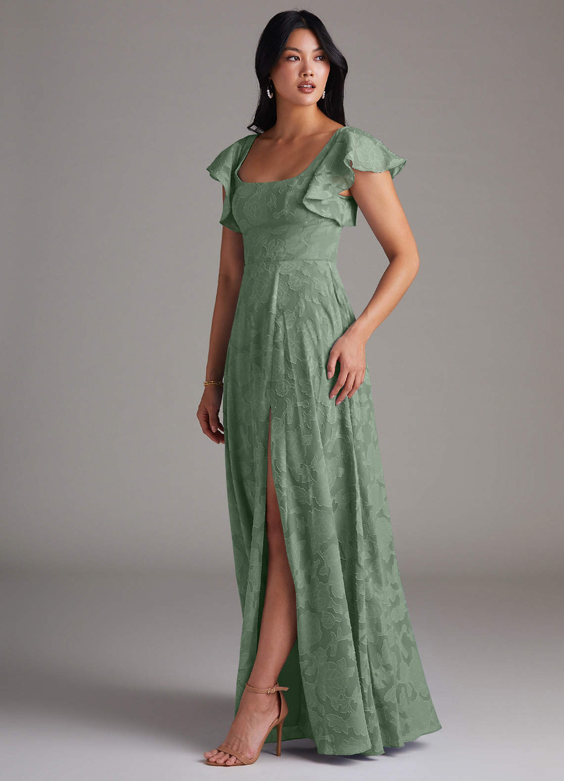Bondi ist unser wunderschönes Brautjungfernkleid aus unserem geblümten Burnout-Stoff. Es hat einen quadratischen Ausschnitt mit Flügelärmeln und einen U-Boot-Rücken zum Binden. Der Look wird durch einen A-Linien-Rock mit Beinschlitz komplettiert.