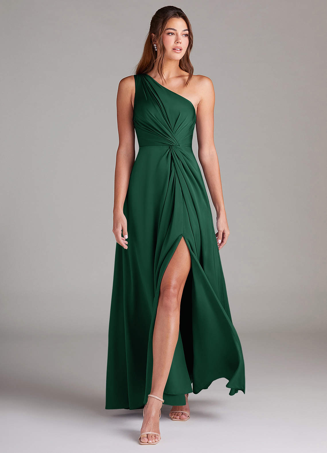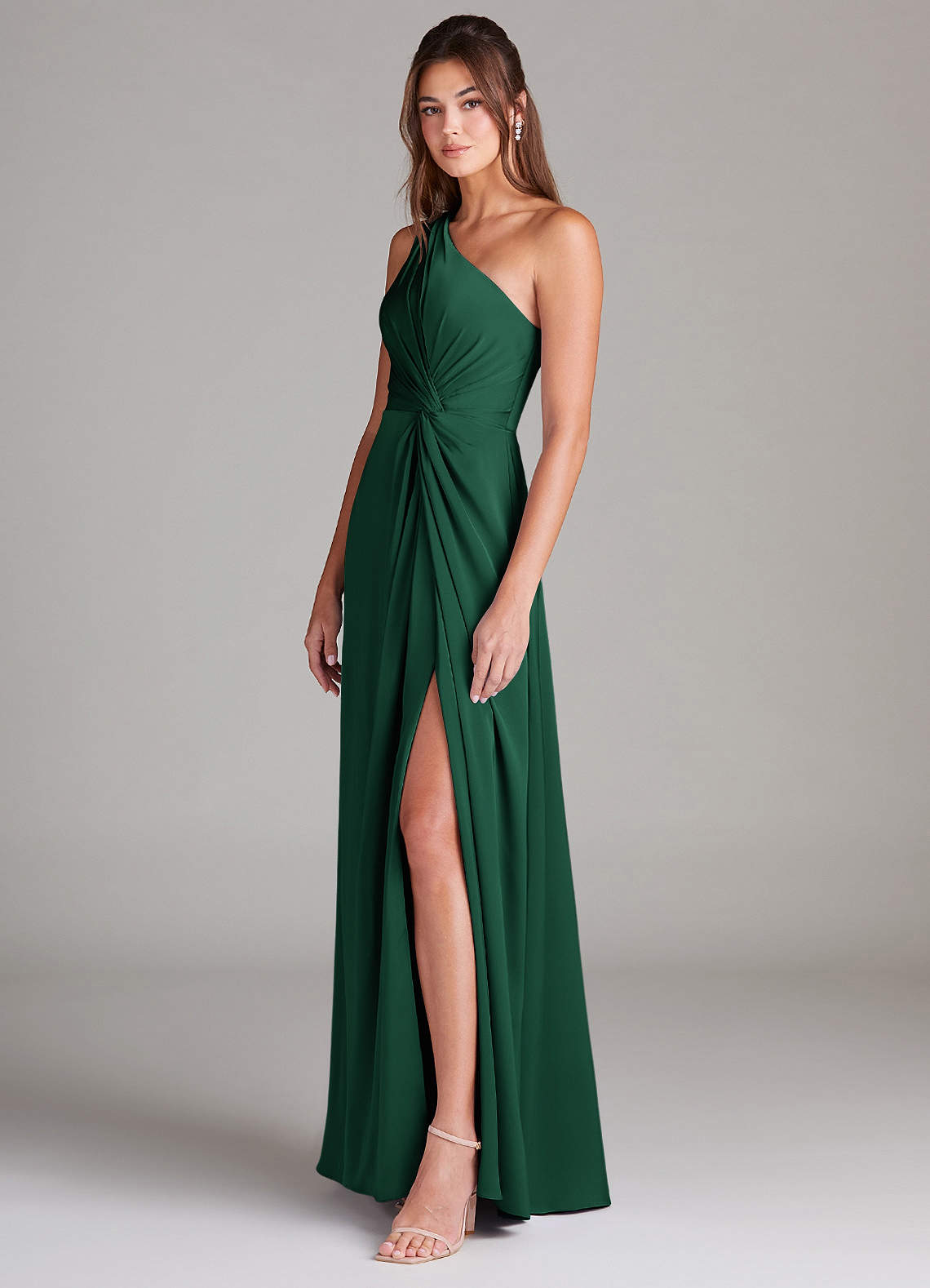 Sehen Sie in Brooke aus wie eine moderne griechische Göttin. Dieses One-Shoulder-Kleid ist aus schmeichelndem Stretch-Satin gefertigt und verleiht Ihren Brautjungfern einen Look moderner Eleganz. Die Falten am Mieder und der seitliche Taillenknoten betonen die Taille und ein seitlicher Beinschlitz verleiht ihrem klassischen A-Linien-Rock eine verführerische Note.