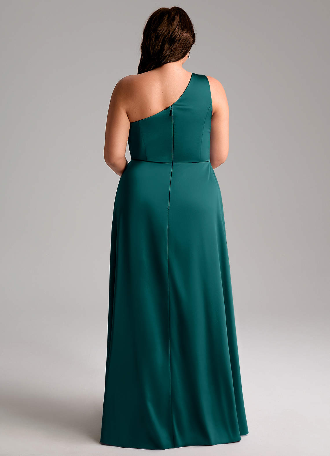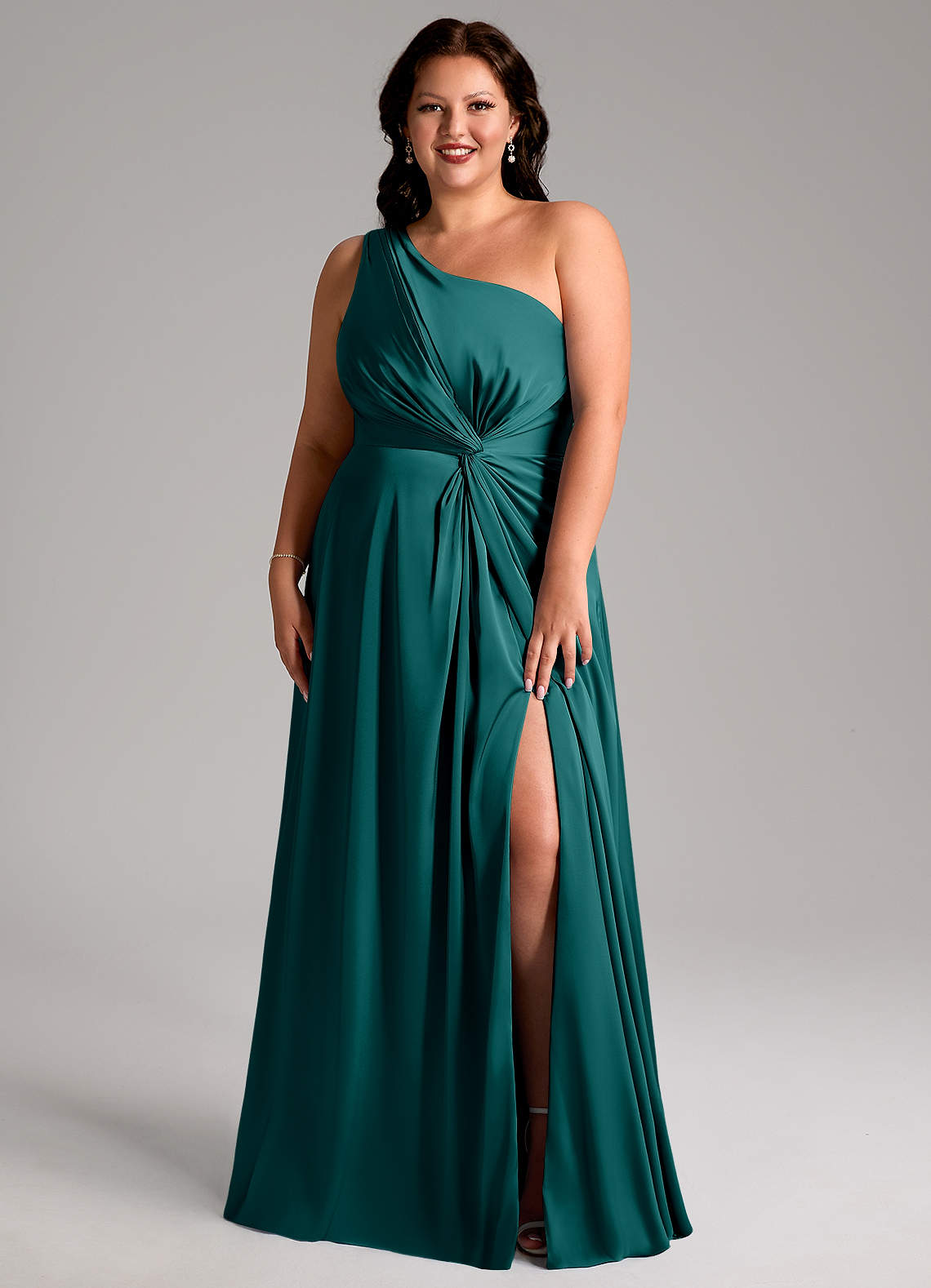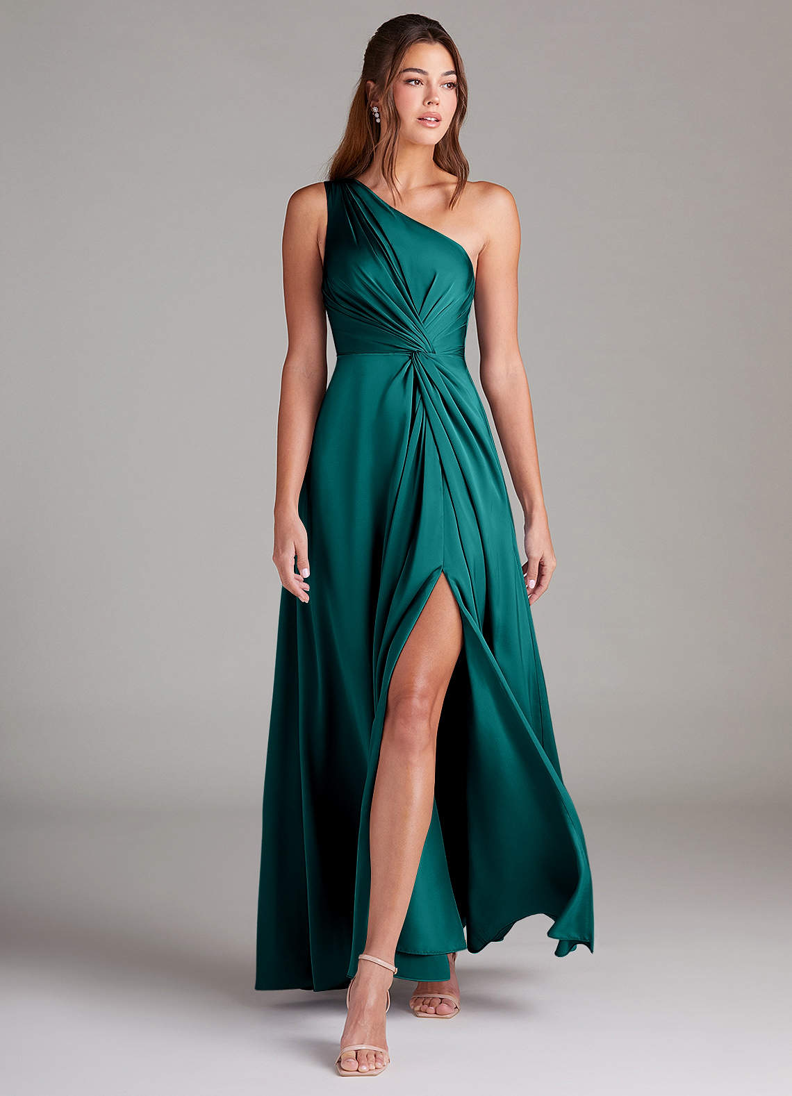 In Brooke sehen Sie aus wie eine moderne griechische Göttin. Dieses Brautjungfernkleid mit einer Schulter besteht aus schmeichelndem Stretch-Satin und verleiht Ihren Brautjungfern einen Look moderner Eleganz. Die Falten am Mieder und der seitliche Taillenknoten betonen die Taille und ein seitlicher Beinschlitz verleiht ihrem klassischen A-Linien-Rock eine verführerische Note.