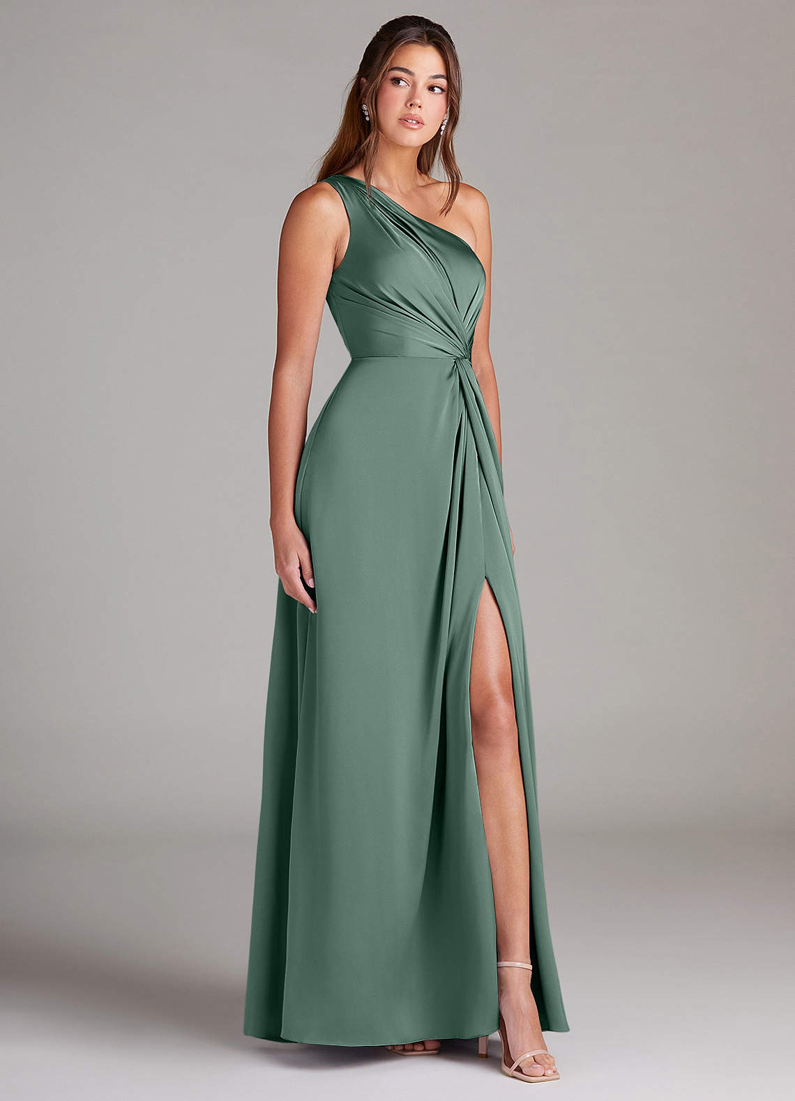 Sehen Sie in Brooke aus wie eine moderne griechische Göttin. Dieses One-Shoulder-Kleid ist aus schmeichelndem Stretch-Satin gefertigt und verleiht Ihren Brautjungfern einen Look moderner Eleganz. Die Falten am Mieder und der seitliche Taillenknoten betonen die Taille und ein seitlicher Beinschlitz verleiht ihrem klassischen A-Linien-Rock eine verführerische Note.