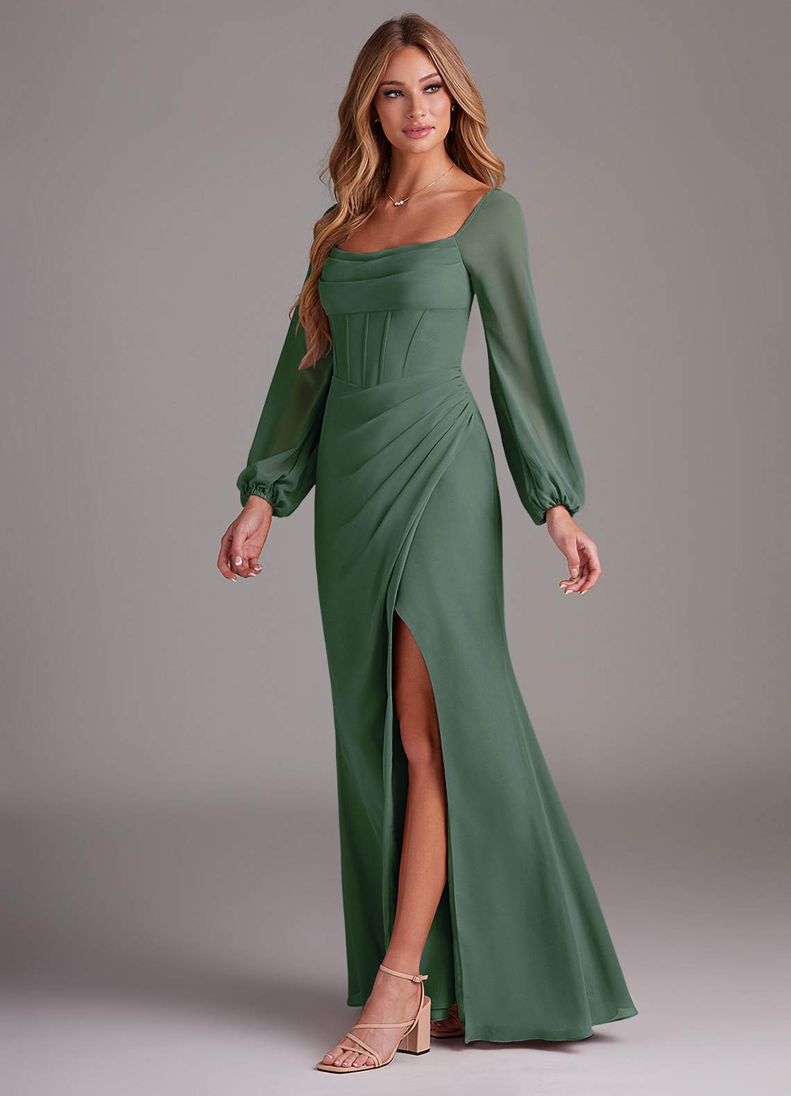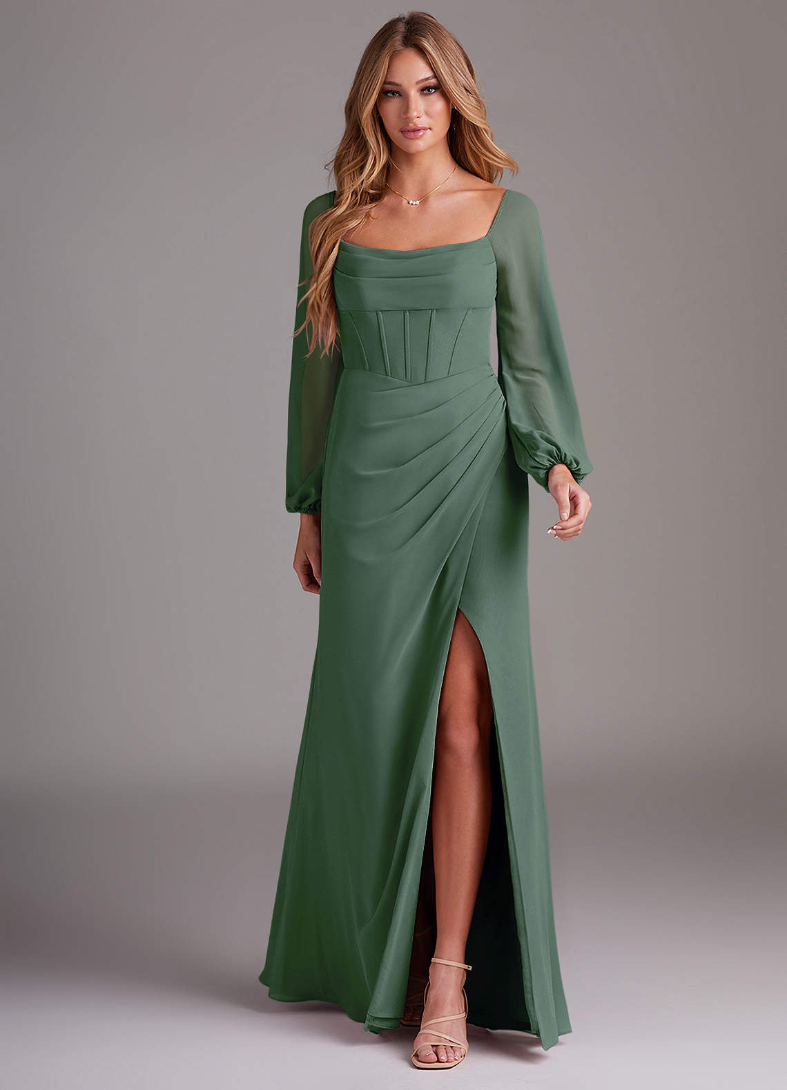 Charissa ist unser atemberaubendes Brautjungfernkleid aus Chiffon. Es hat einen plissierten Wasserfallausschnitt mit transparenten Blousonärmeln und selbst zu bindenden Rückenträgern, um sie an Ort und Stelle zu halten. Der Look wird durch ein korsettähnliches Oberteil abgerundet, das in ein plissiertes Etuikleid und einen Beinschlitz übergeht.