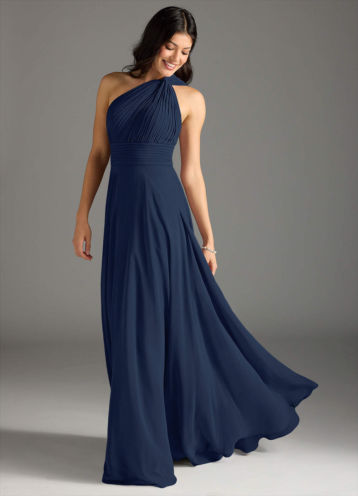 Mit Charlize werden Sie sich wie eine moderne griechische Göttin fühlen! Das asymmetrische Brautjungfernkleid zeichnet sich durch zart plissierte Einsätze und ein Schulterdetail mit gedrehten Knoten aus. Das strukturierte Oberteil ist wunderschön mit einem sanft gerafften A-Linien-Rock harmoniert, der allen Formen schmeichelt.
