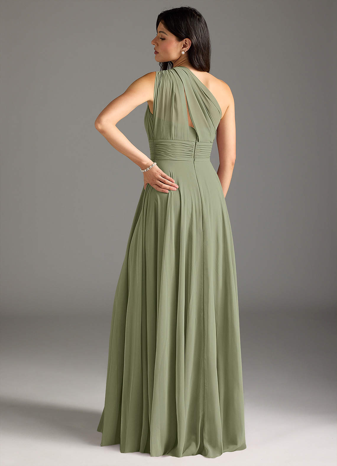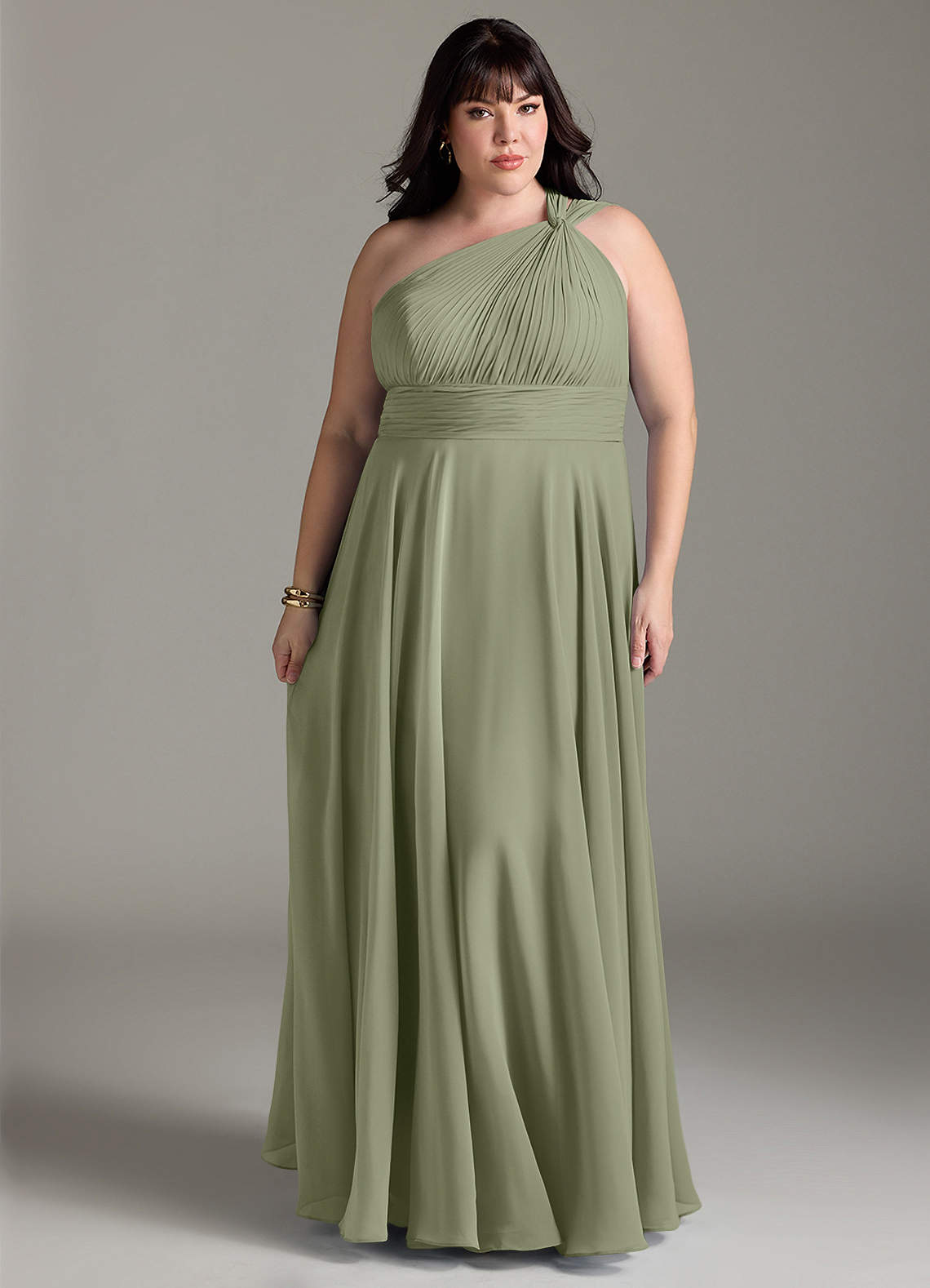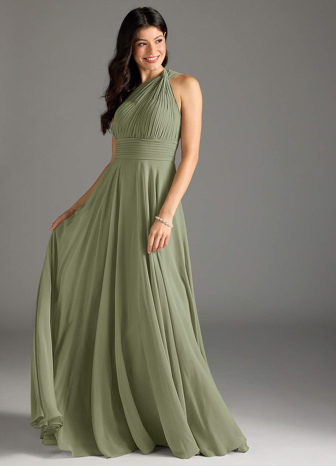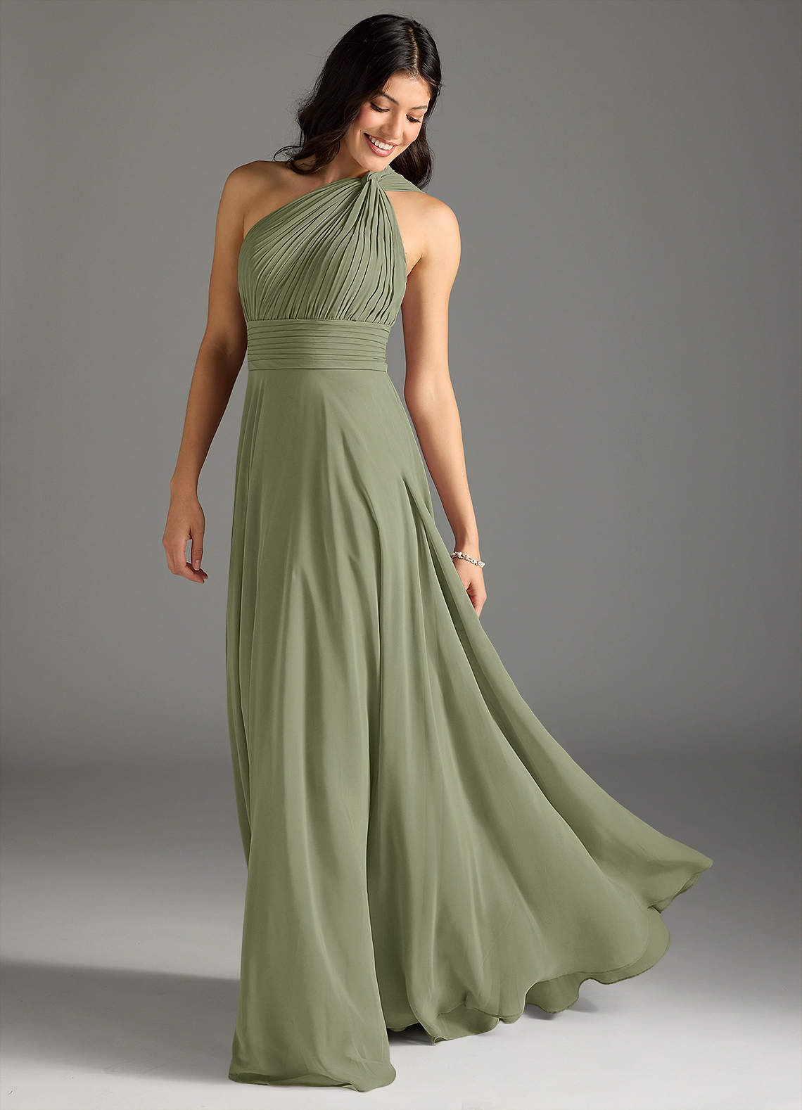 Mit Charlize werden Sie sich wie eine moderne griechische Göttin fühlen! Das asymmetrische Brautjungfernkleid zeichnet sich durch zart plissierte Einsätze und ein Schulterdetail mit gedrehten Knoten aus. Das strukturierte Oberteil ist wunderschön mit einem sanft gerafften A-Linien-Rock harmoniert, der allen Formen schmeichelt.