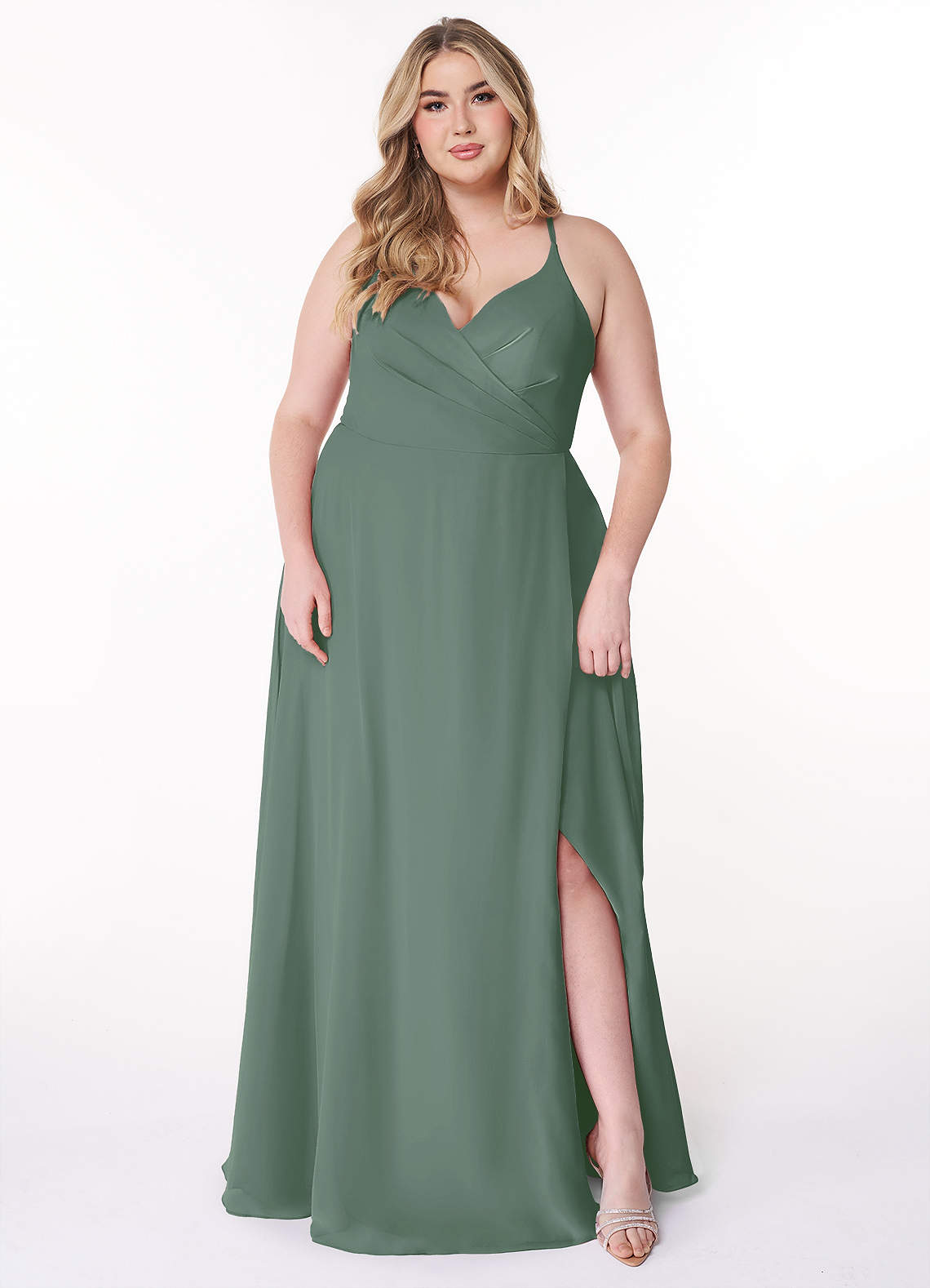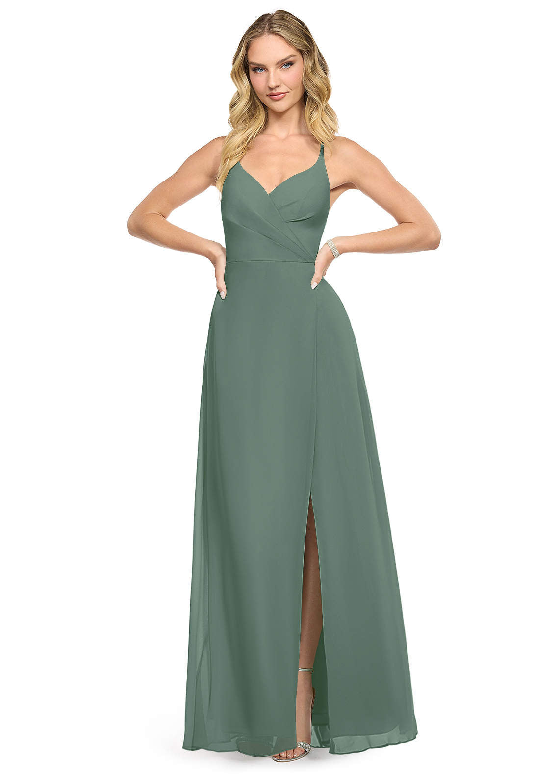 Mit dem Davis-Kleid sehen Sie klassisch elegant aus. Sie ist aus Chiffon gefertigt und hat ein Oberteil mit V-Ausschnitt und Falten. Ihr Rock in A-Linien-Silhouette ist überlappt und erzeugt beim Gehen einen Beinschlitz. Ihre zarten Spaghettiträger führen zu einem verführerischen offenen Rücken mit einem Schlüsselloch und einem verdeckten Knopfverschluss.