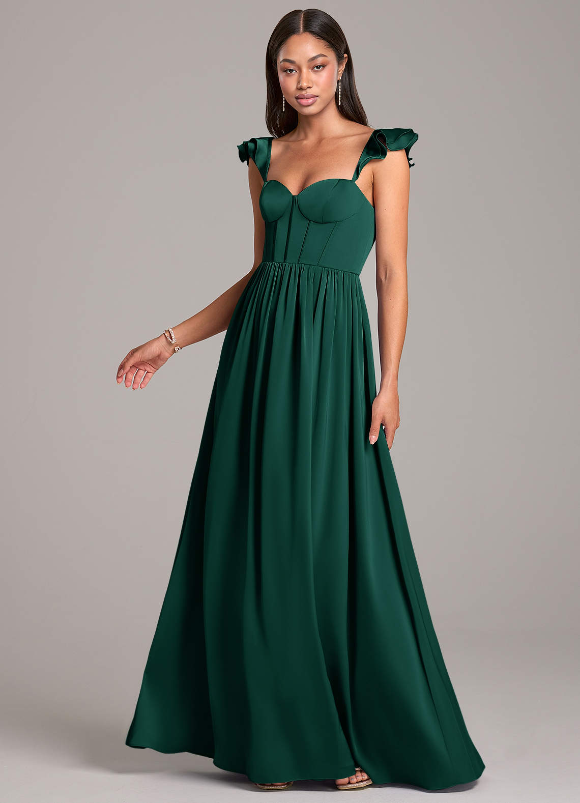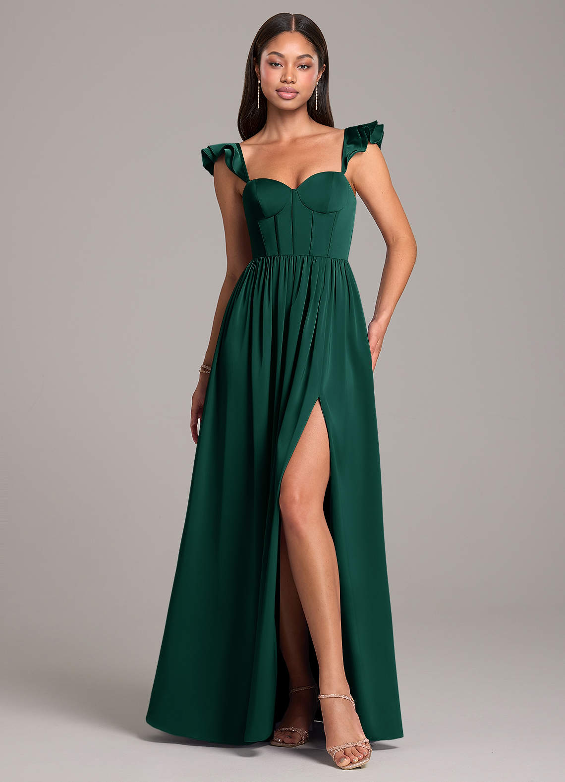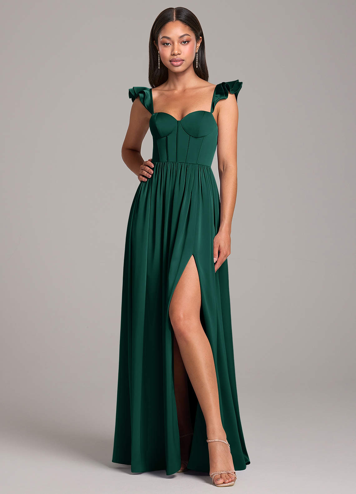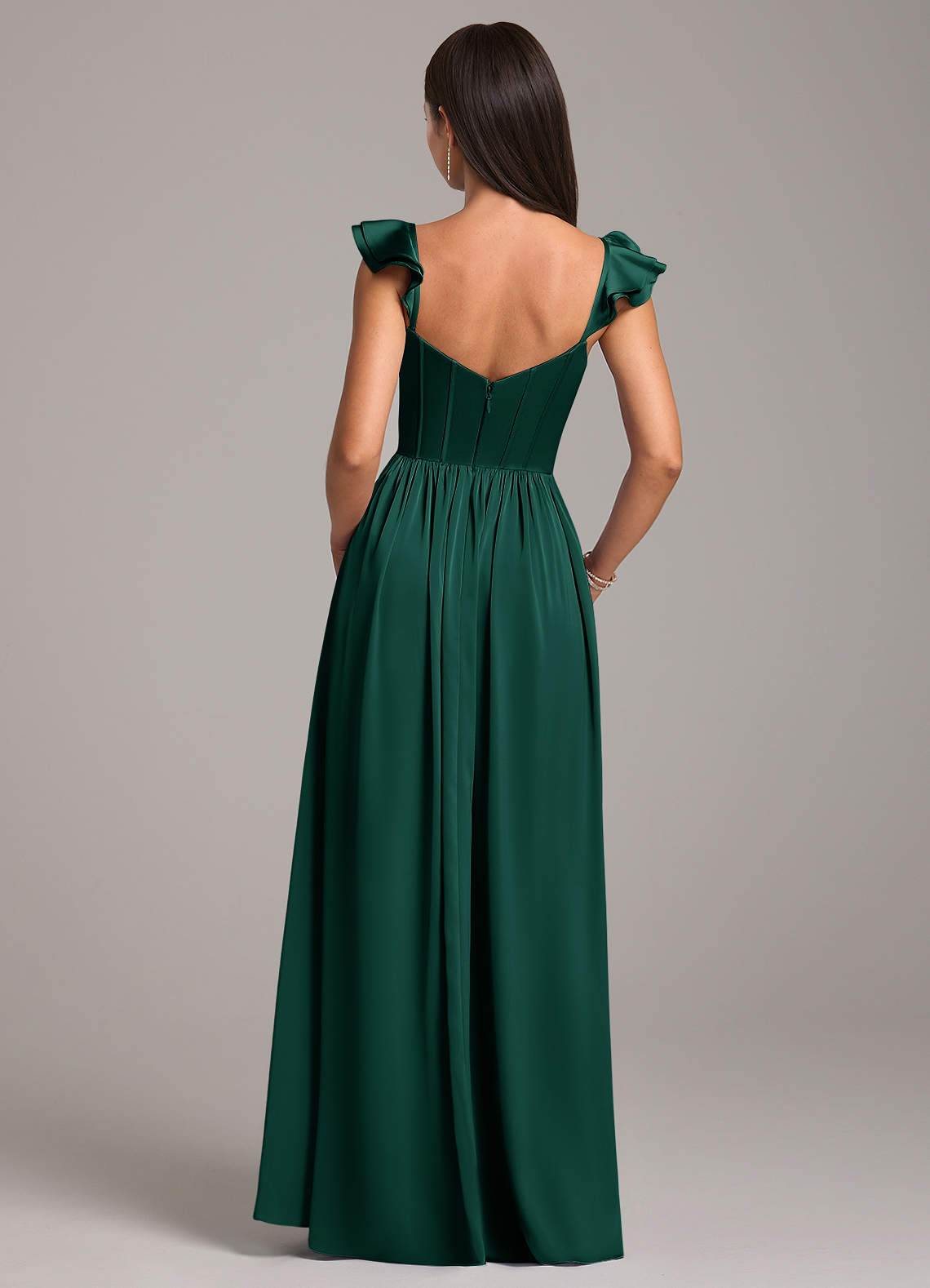 Unser Brautjungfernkleid Denisse ist aus wunderschönem Stretch-Satin in unserer klassischen A-Linie gefertigt. Es besticht durch einen herzförmigen Ausschnitt, romantische Flügelärmel und einen offenen Rücken. Der geraffte Rock hat einen Beinschlitz für mehr Bewegungsfreiheit.