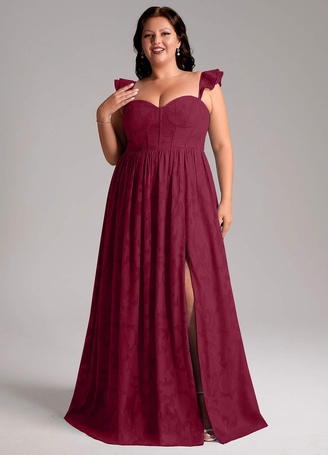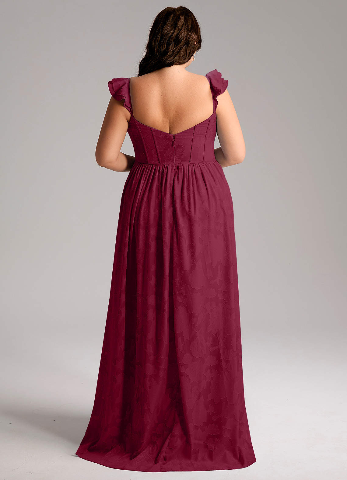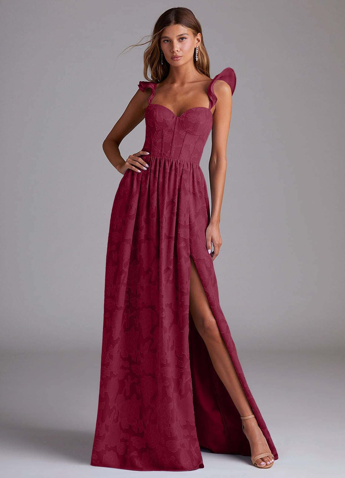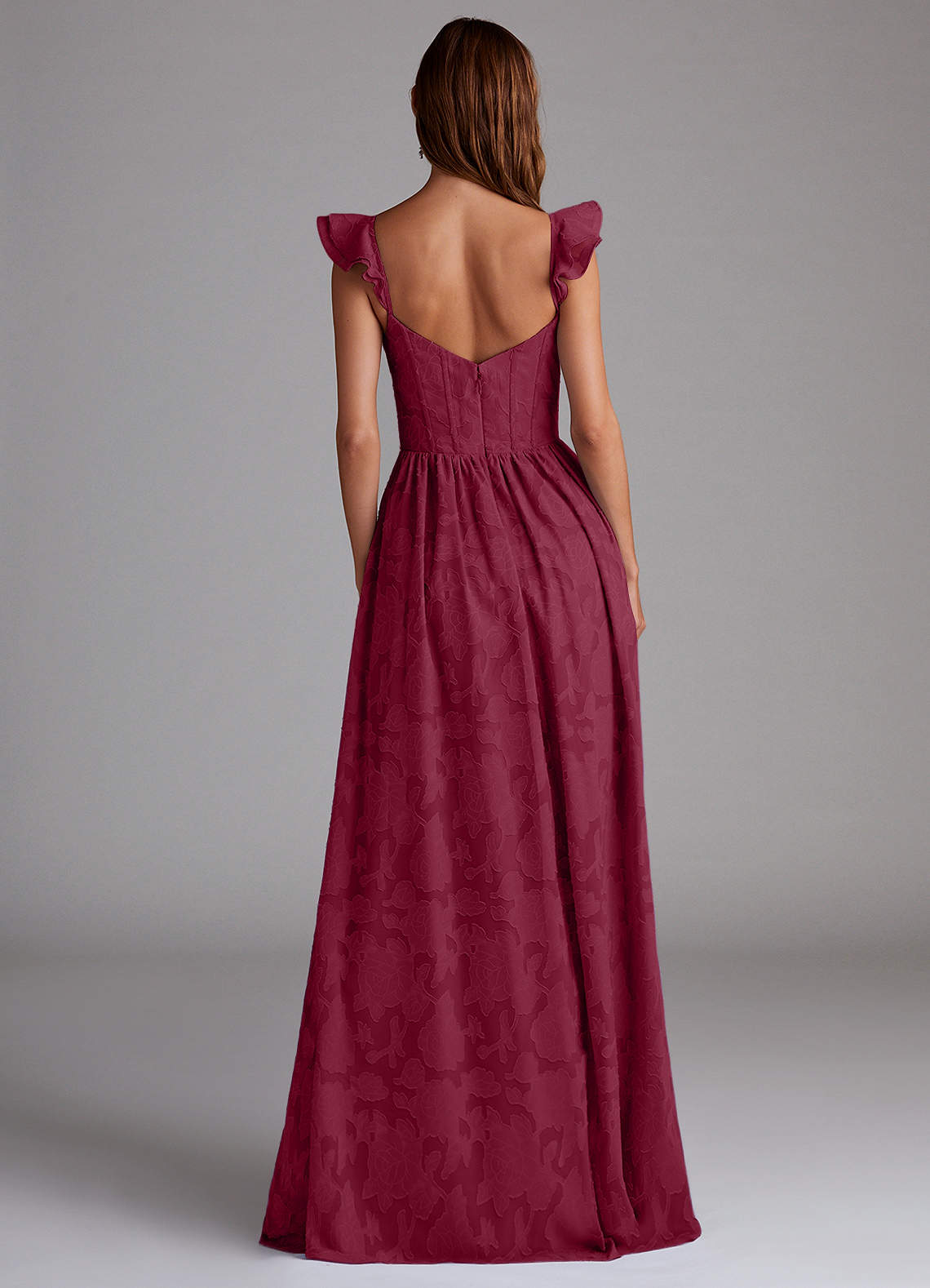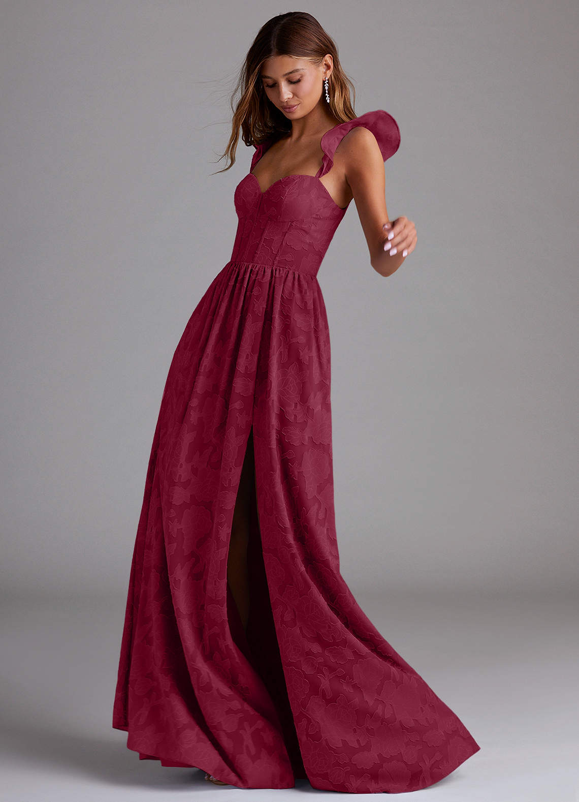 Unser Brautjungfernkleid Denisse ist aus einem wunderschönen, geblümten Burnout-Stoff in unserer klassischen A-Linien-Silhouette geschnitten. Es hat einen herzförmigen Ausschnitt, romantische Flügelärmel und einen offenen Rücken. Der geraffte Rock hat einen Beinschlitz für mehr Bewegungsfreiheit.