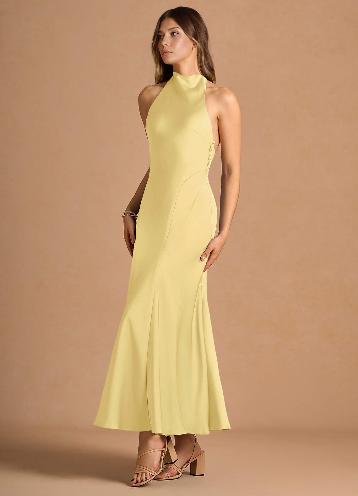 Elegantes Meerjungfrauenkleid aus leichtem, glänzendem Stoff, der Ihre Kurven betont. Mit seitlichen Knopfdetails an der Taille und einem markanten offenen Rücken für zusätzlichen Charme. Perfekt für Urlaub und Cocktailpartys. Erleben Sie mühelosen Glamour.