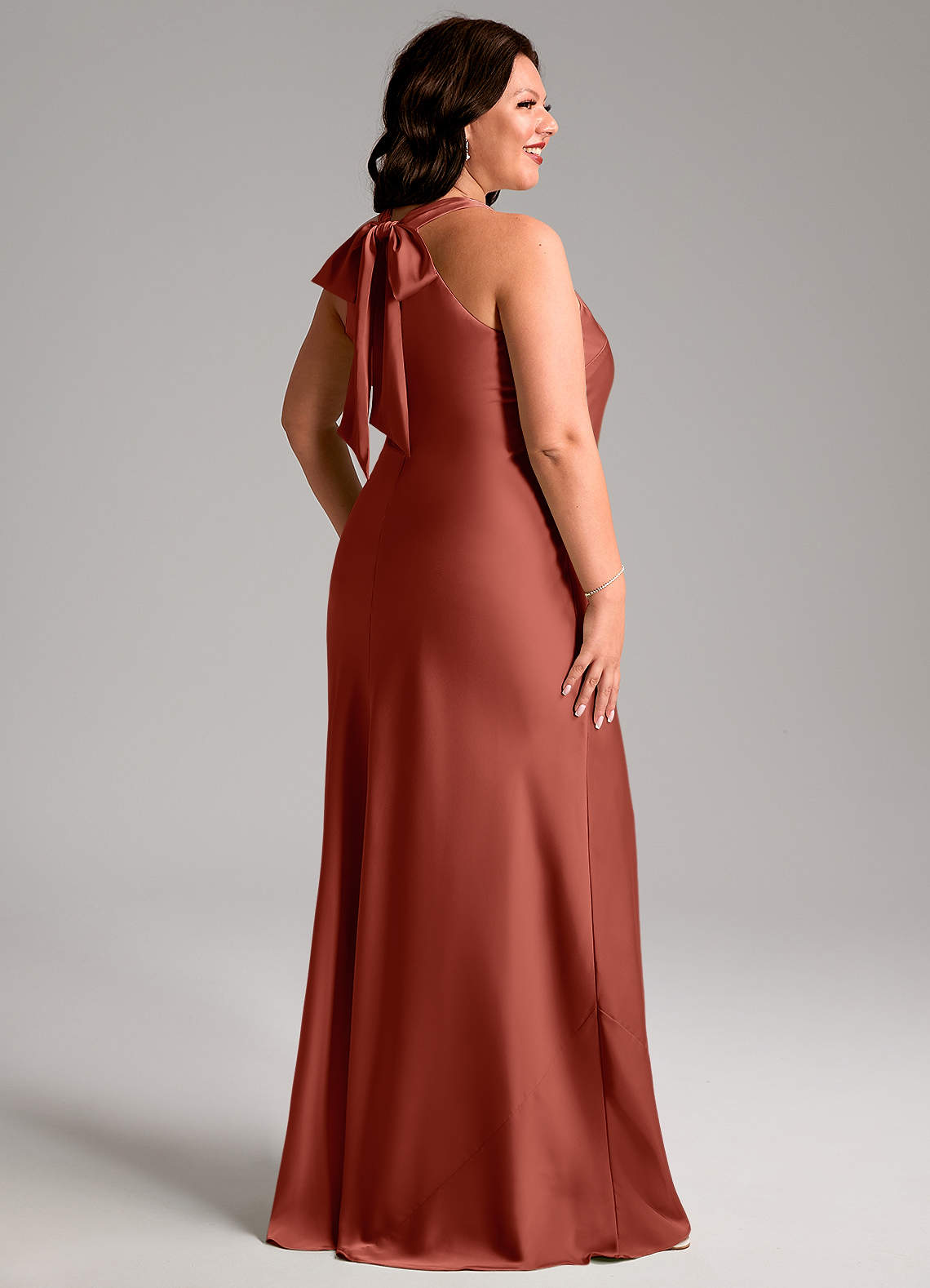 Doretta ist der Inbegriff eleganter Eleganz, mit einer figurbetonten Meerjungfrauenform aus leuchtendem Stretch-Satin, die die Kurven umarmt und anmutig bis zum Boden fließt. Das Kleid wird durch einen eleganten überlappenden Neckholder-Ausschnitt aufgewertet, der mit einer Schleife zum Binden und einem auffälligen Schlüsselloch-Detail auf der Rückseite versehen ist.