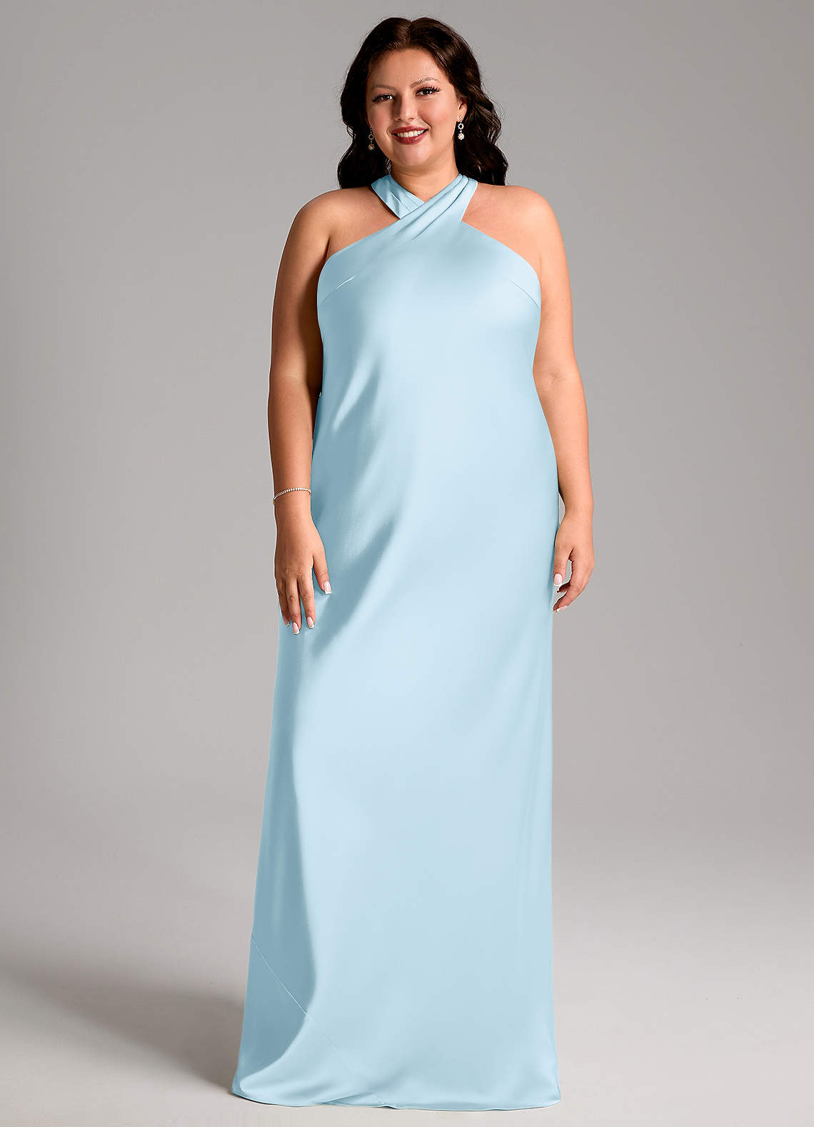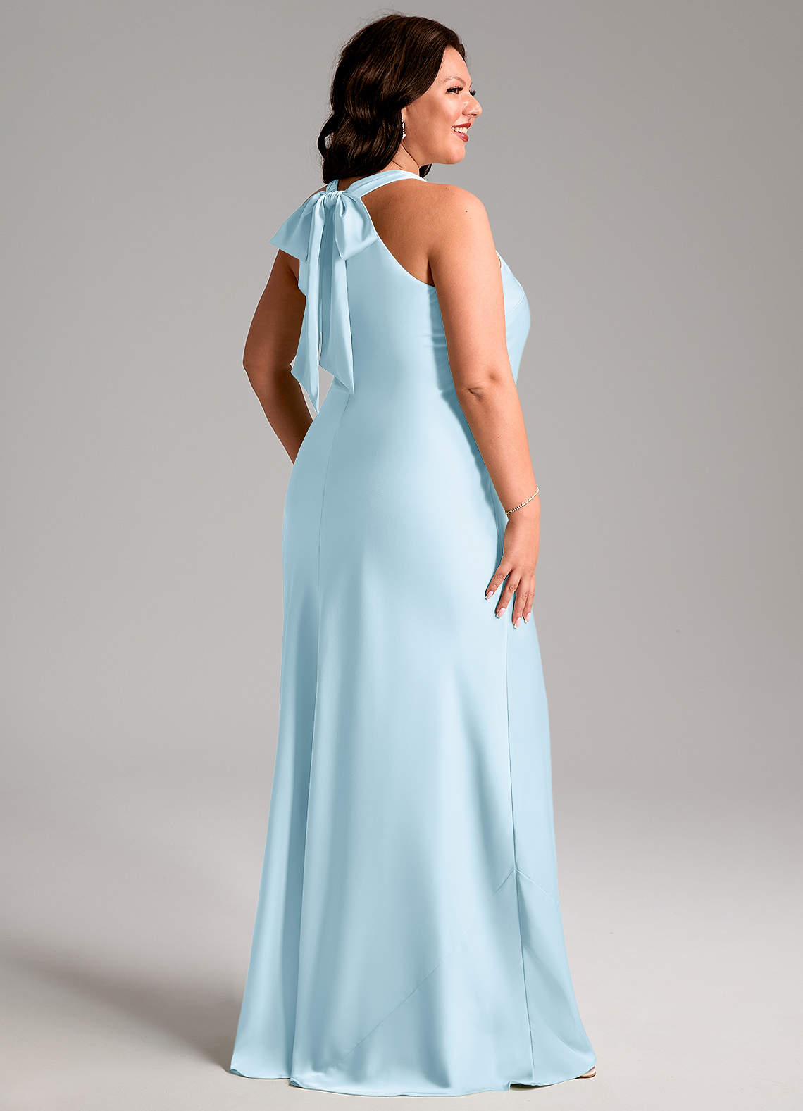 Doretta ist der Inbegriff eleganter Eleganz, mit einer figurbetonten Meerjungfrauenform aus leuchtendem Stretch-Satin, die die Kurven umarmt und anmutig bis zum Boden fließt. Das Kleid wird durch einen eleganten überlappenden Neckholder-Ausschnitt aufgewertet, der mit einer Schleife zum Binden und einem auffälligen Schlüsselloch-Detail auf der Rückseite versehen ist.
