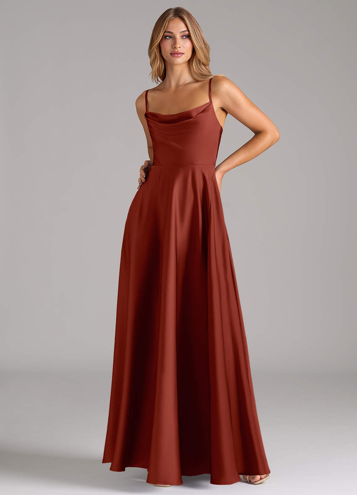 Das mühelos elegante Elle-Kleid präsentiert sich in bodenlanger A-Linie aus glattem Stretch-Satin mit weichem Wasserfallausschnitt, geradem Rücken und zarten Spaghettiträgern. Der fließende Faltenrock mit versteckten Taschen und einem Beinschlitz verleiht ihm einen modernen, funktionalen Touch.