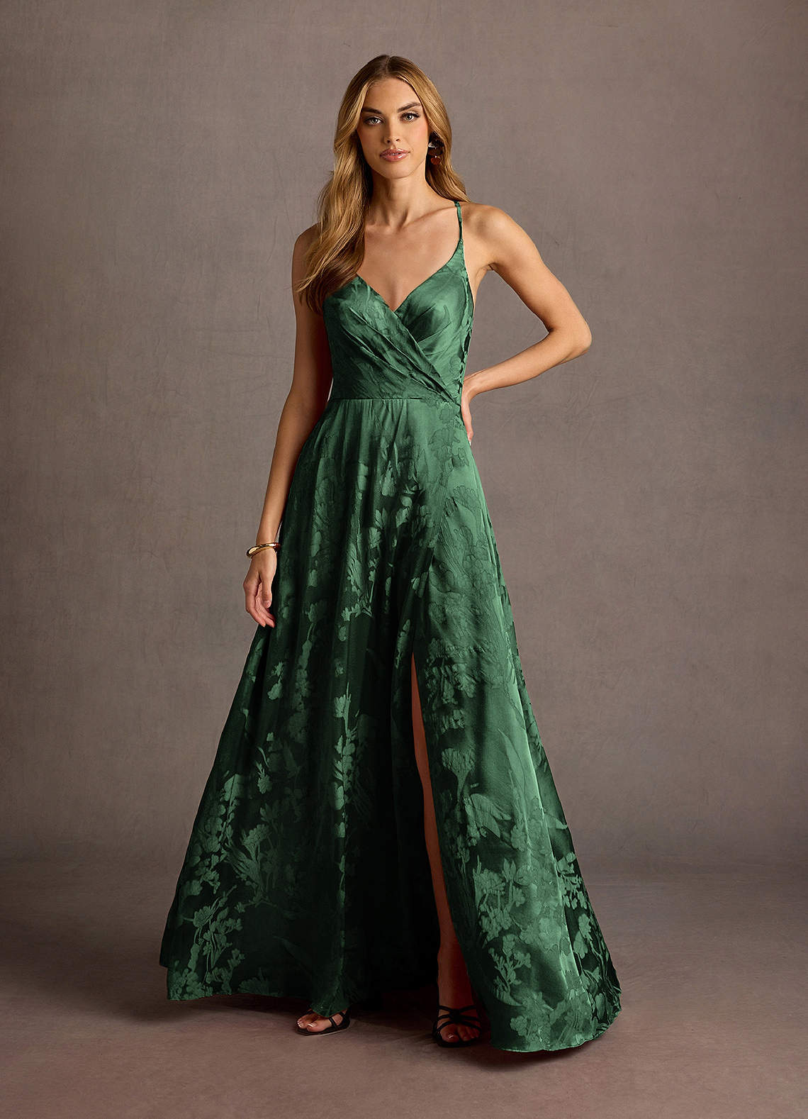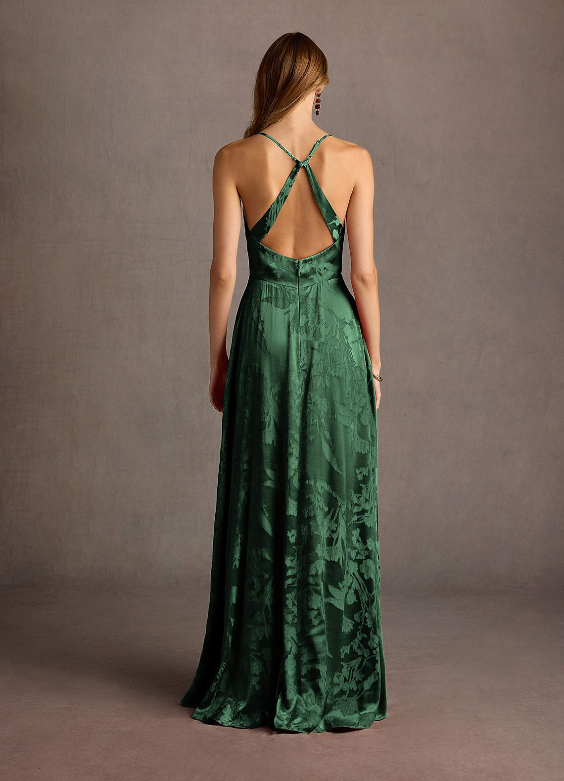 Unser Gabrielle Maxikleid mit offenem Rücken ist aus einem wunderschönen Jacquardstoff gefertigt. Es hat einen V-Ausschnitt und verstellbare Spaghettiträger für eine individuelle Passform. Tragen Sie dieses Kleid bei Ihrem nächsten formellen Mittagessen, einem schicken Abend oder einer Hochzeitsfeier.