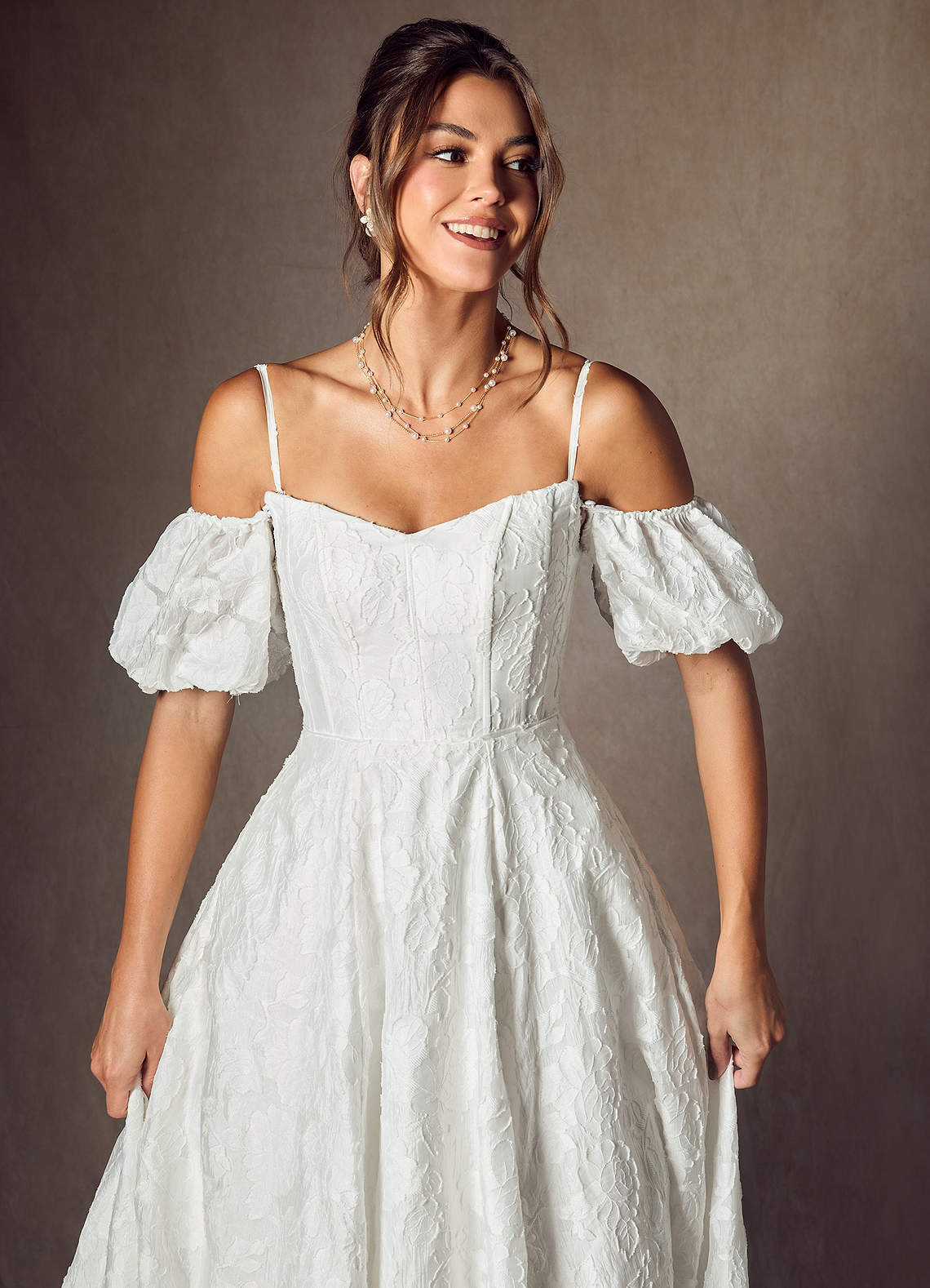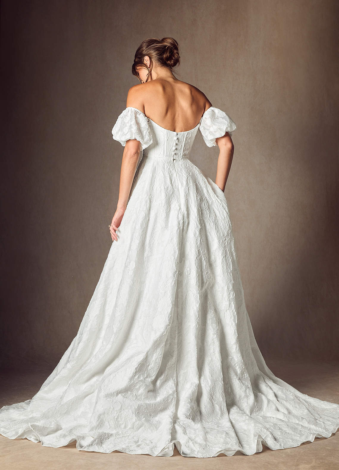 Fühlen Sie sich an Ihrem großen Tag wie eine Prinzessin im Gladiola Ballkleid. Dieses atemberaubende florale Burnout-Jacquard-Modell kombiniert einen herzförmigen Ausschnitt, abnehmbare Puffärmel, die auf oder über der Schulter getragen werden können, und einen voluminösen Rock mit Taschen und Kapellenschleppe.