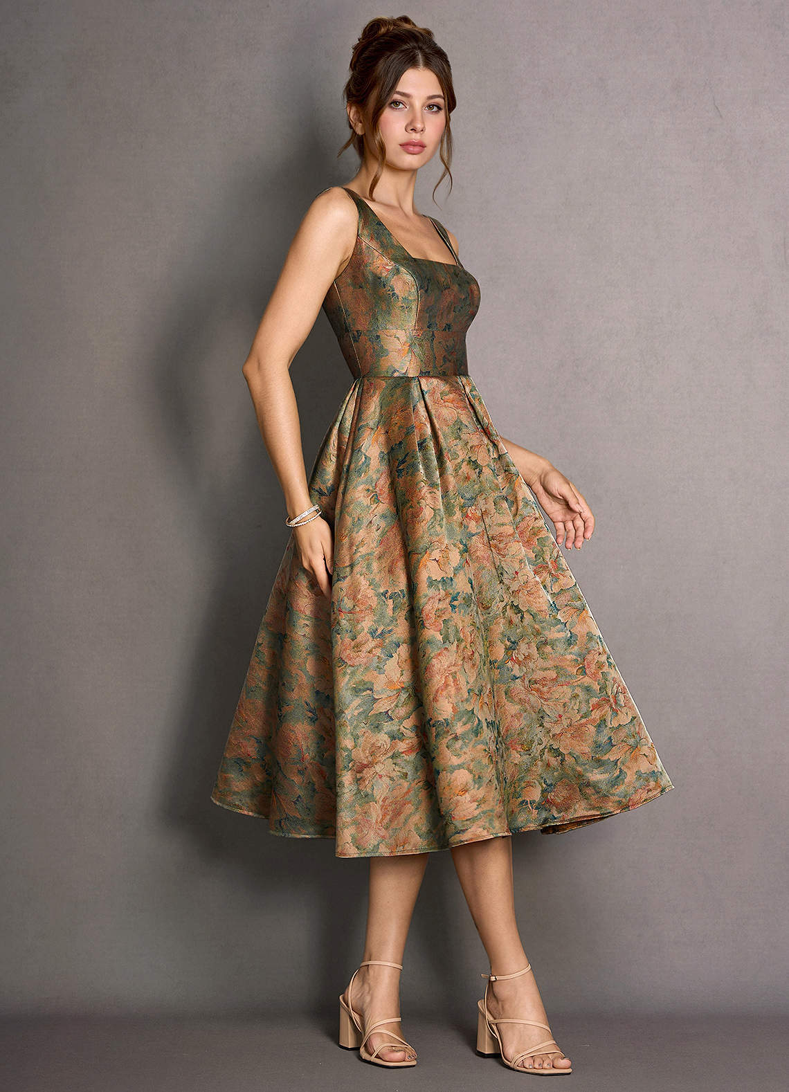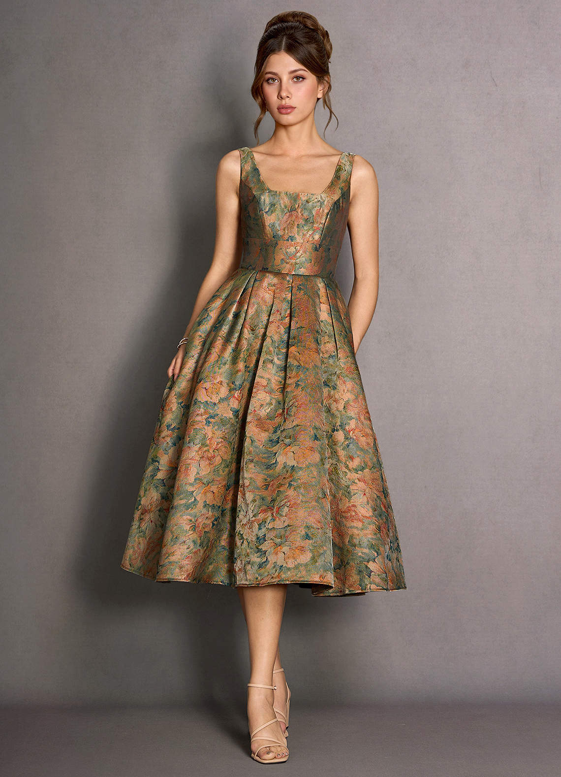 Kurzes Abendkleid aus Brokat. Präsentiert mit quadratischem Ausschnitt, quadratischem Rücken und Trägern. Im Katel Midi-Look.