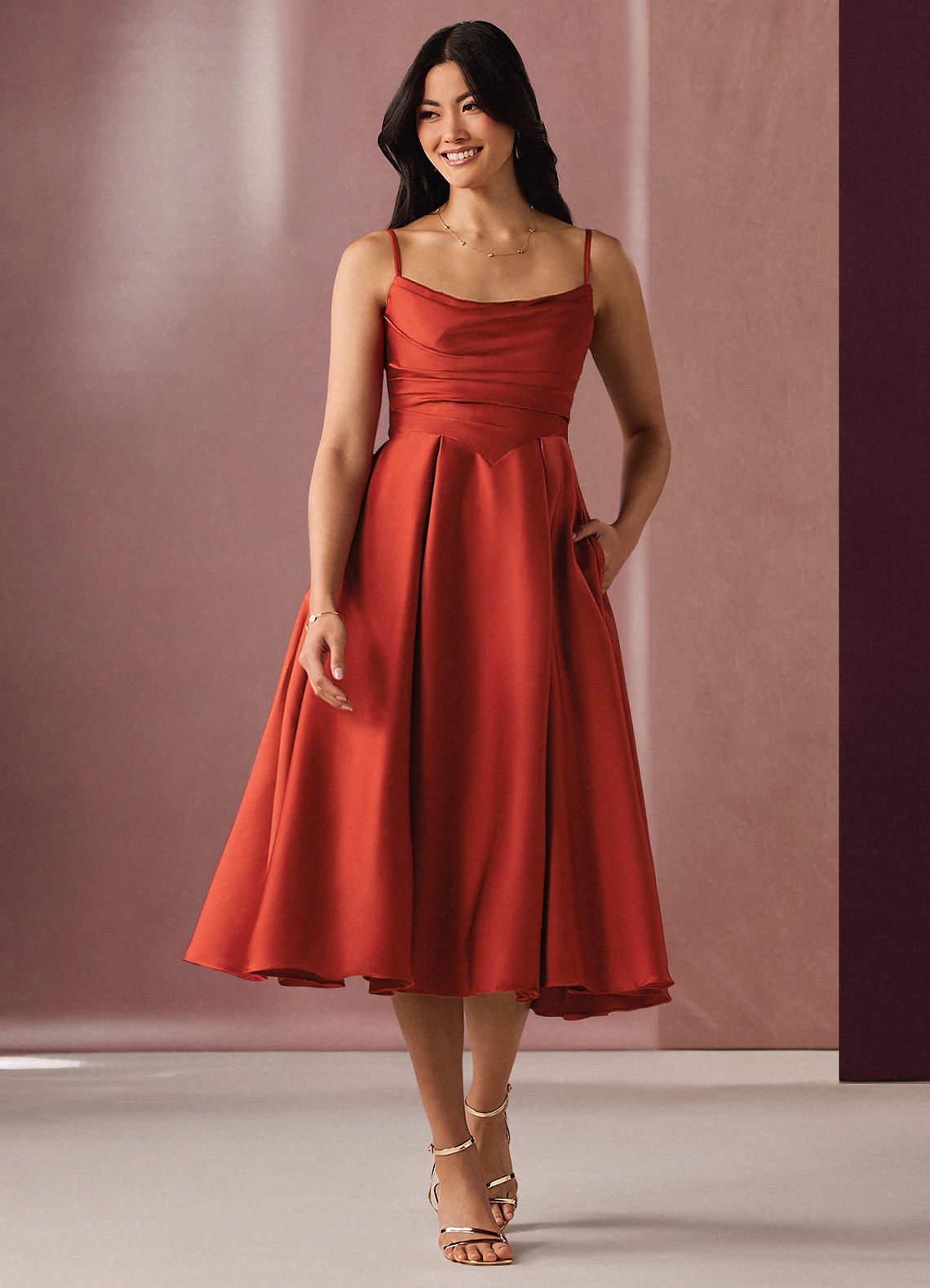 Tragen Sie unser Kelsie Sienna Midikleid und seien Sie auf der Liste der am besten gekleideten Menschen. Dieser Stil kombiniert einen Wasserfallausschnitt, ein offenes Schlüssellochdetail am Rücken und einen schmeichelnden A-Linienrock mit Taschen. Tragen Sie diesen Stil zu Ihrem besonderen Anlass oder Ihrer Hochzeitsfeier.