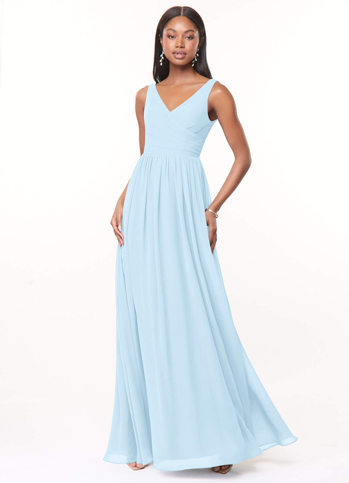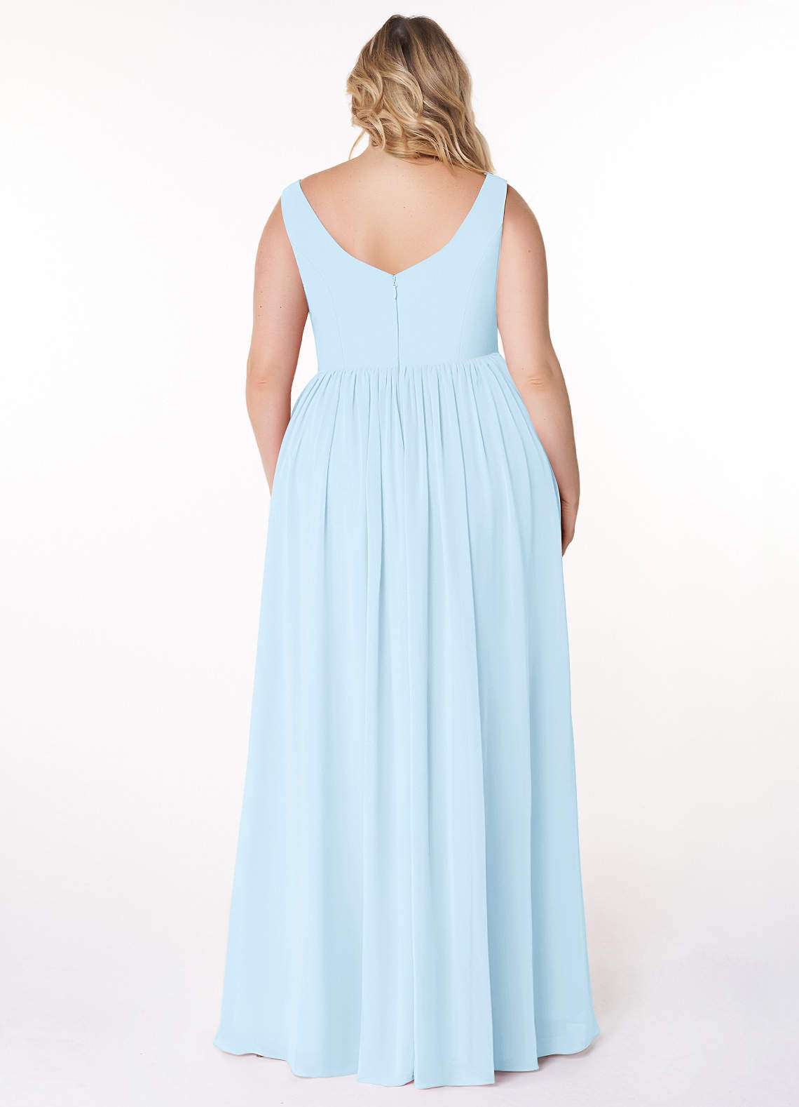 Keyla ist ein bodenlanges Kleid in A-Linie. Dieses Kleid aus Chiffon hat einen V-Ausschnitt. Erhältlich in voller Größe (EU32-EU62) und maßgeschneiderter Größe.