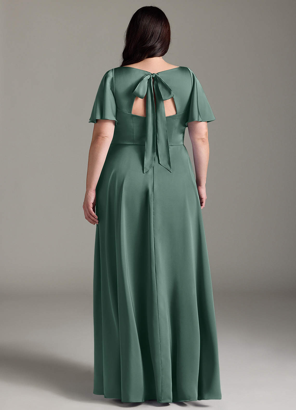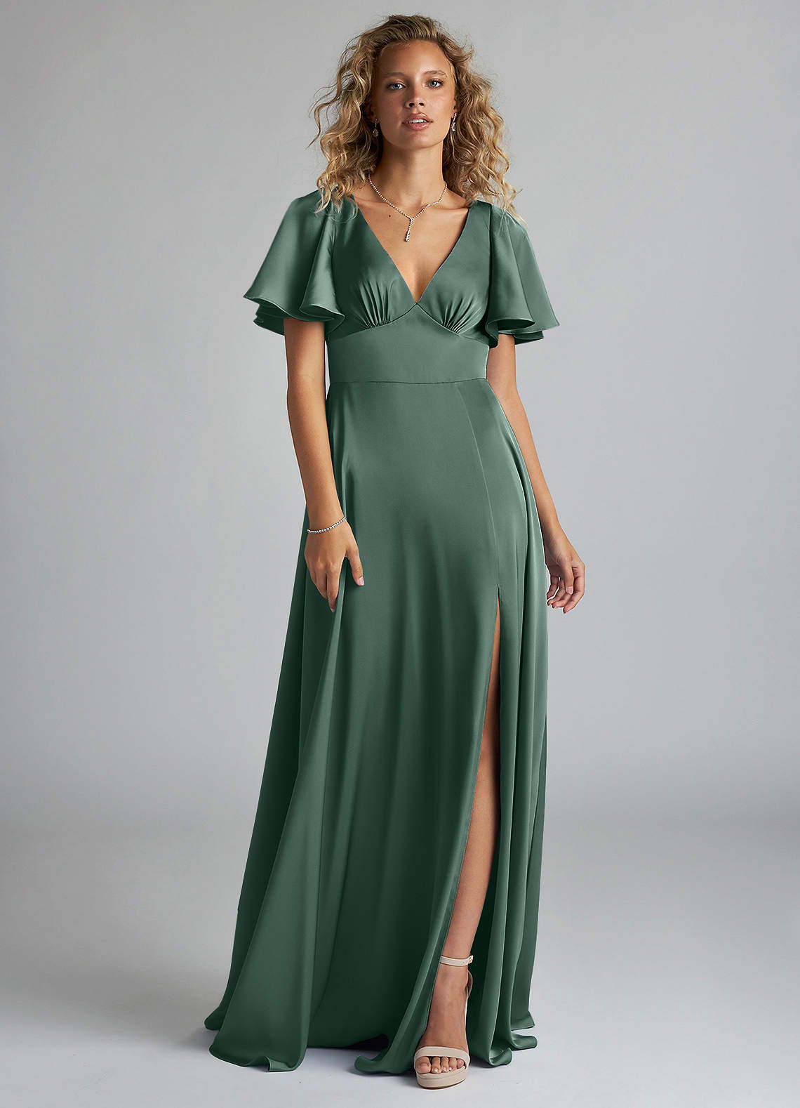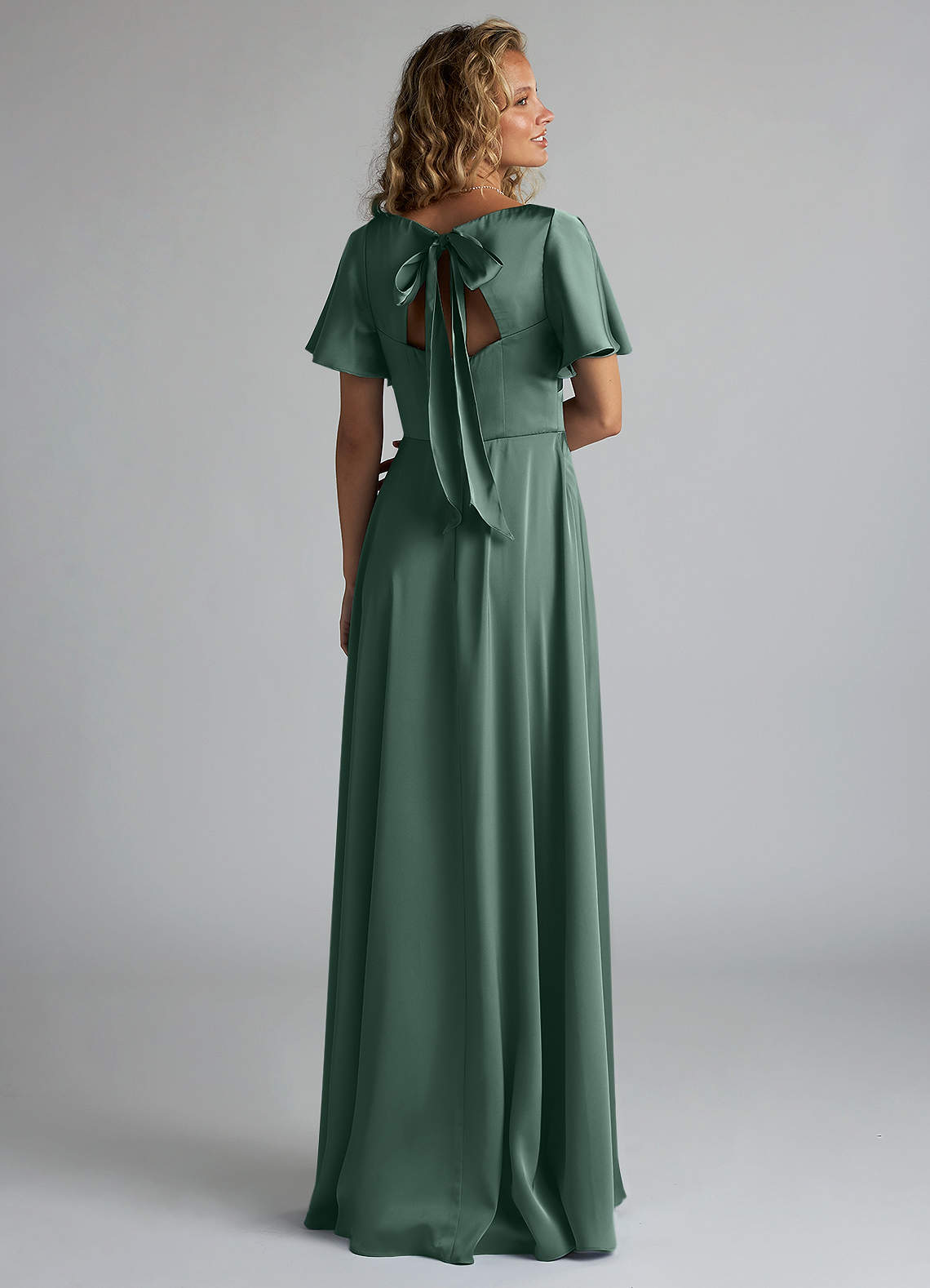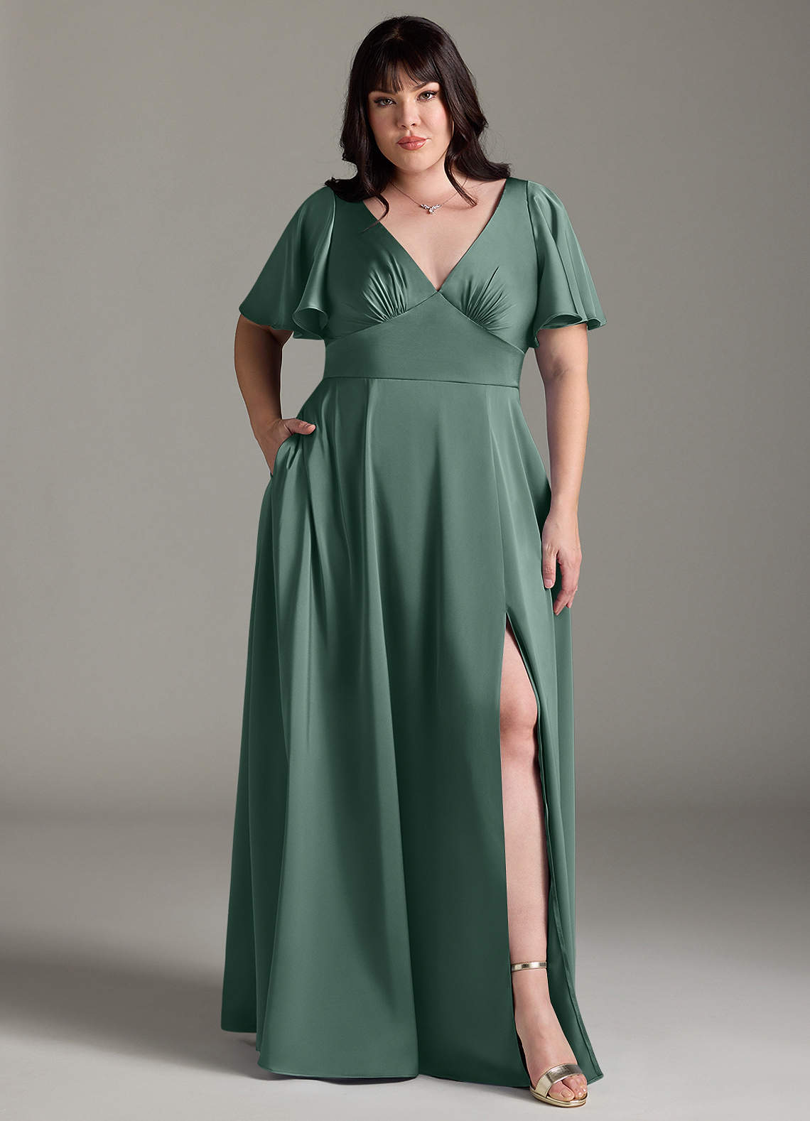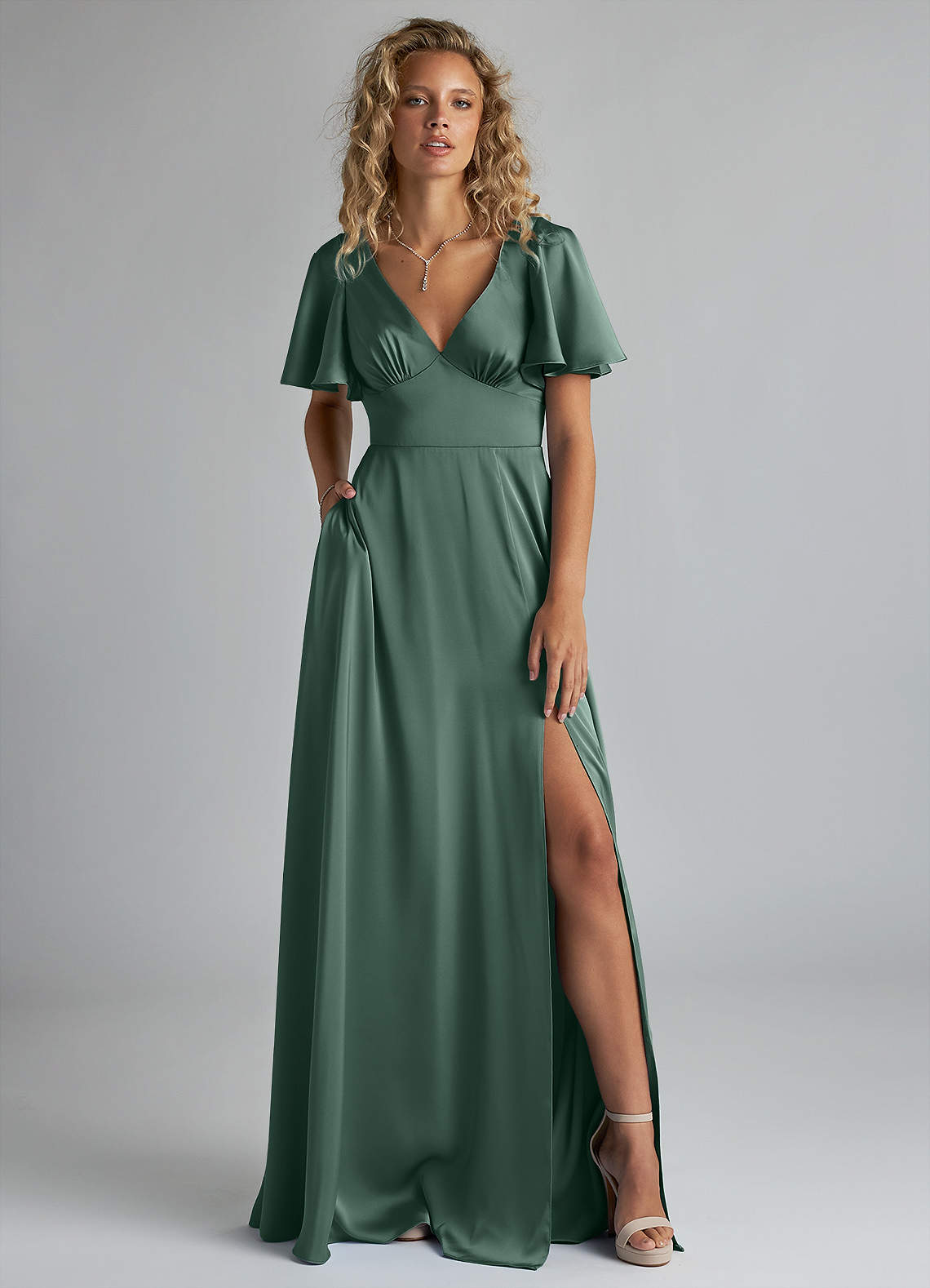 Kimber ist eine erfrischende, moderne Wahl für Ihre Brautparty. Das Oberteil hat einen V-Ausschnitt und eine akzentuierende Naht unter der Brust. Die Silhouette wird durch ein atemberaubendes Schmetterlingsärmeldesign hervorgehoben. Ihr Rückenmieder ist mit einer Schleife zum Binden und einer Schlüssellochöffnung versehen. Ihr bodenlanger A-Linien-Rock hat einen Beinschlitz, der für Komfort beim Gehen sorgt. Wir haben auch Taschen hinzugefügt!