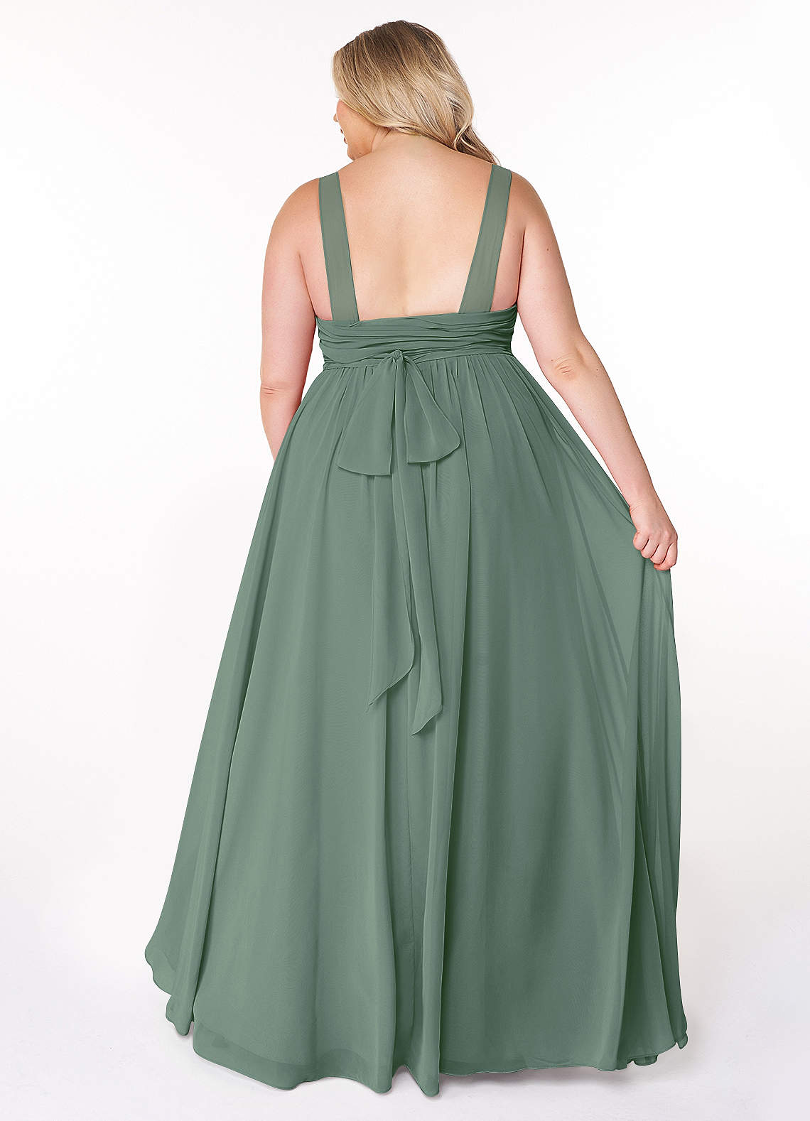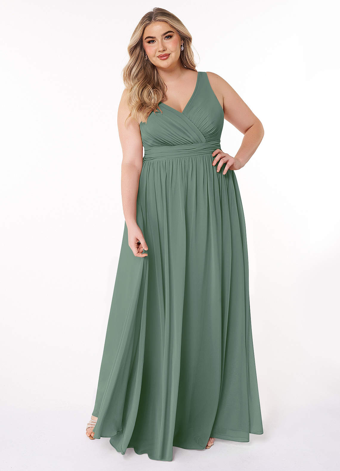 Das attraktive bodenlange Brautjungfernkleid von Azazie hat einen A-Linien-/Princess-Schnitt aus wunderschönem Chiffon. Der Stil hat einen V-Ausschnitt und ist in allen Größen erhältlich (EU32-EU62). Ein Faltendetail an der Vorder- und Rückseite des fließenden Rocks macht ihn perfekt für den Empfang oder eine Hochzeit im Rathaus.