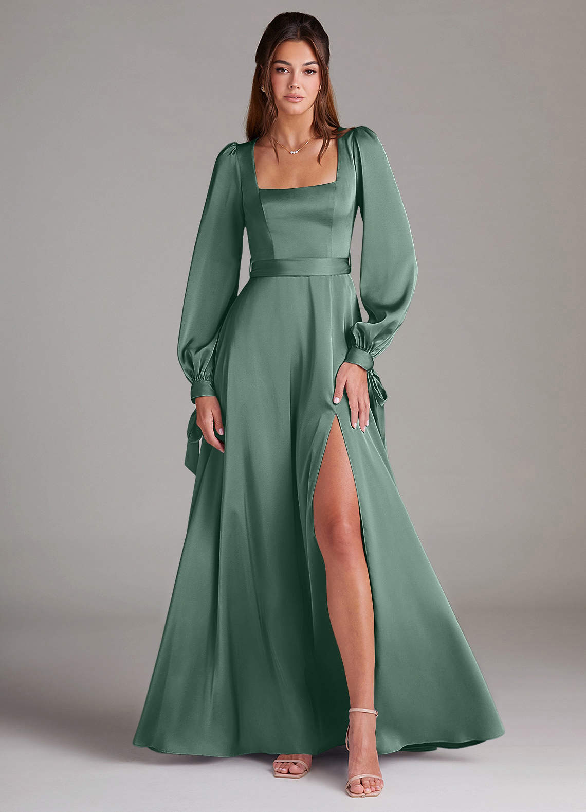 Für jedes Mädchen, das ein schlichtes Brautjungfernkleid sucht, ist Leonia die perfekte Wahl. Sie hat einen schmeichelhaften quadratischen Ausschnitt, wunderschöne Bischofsärmel, die zu einer Schleife um Ihr Handgelenk gebunden werden, und einen Beinschlitz.