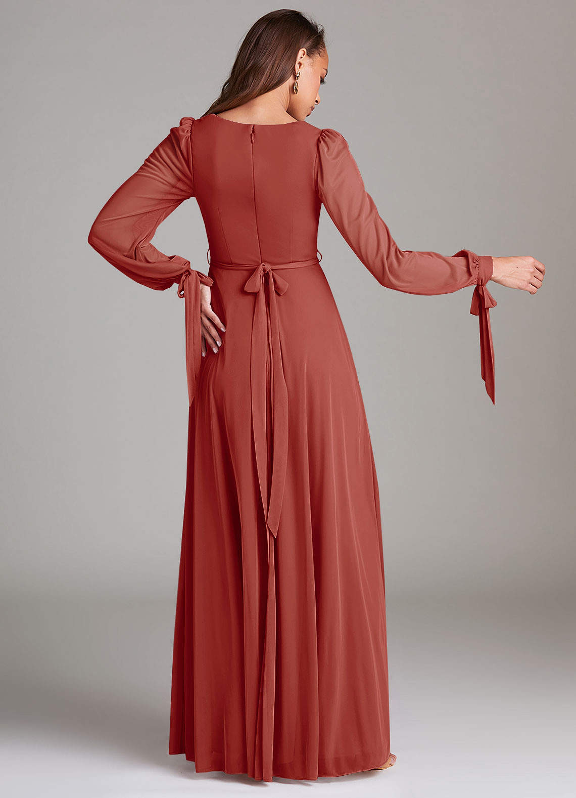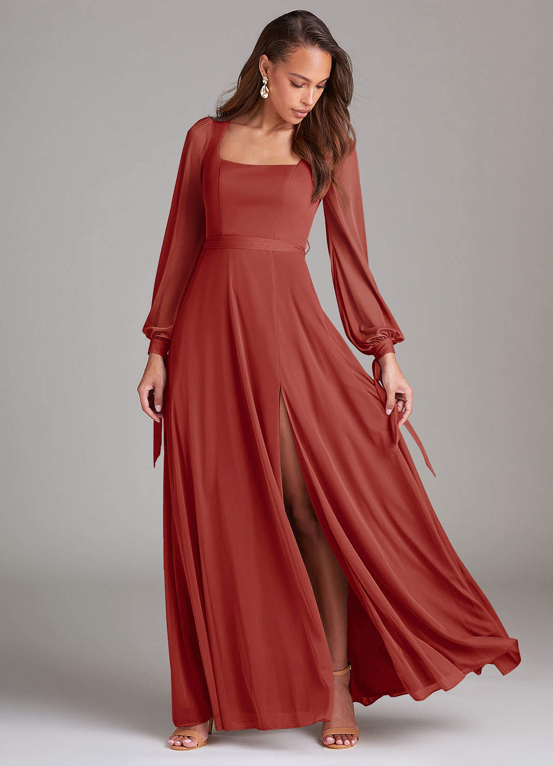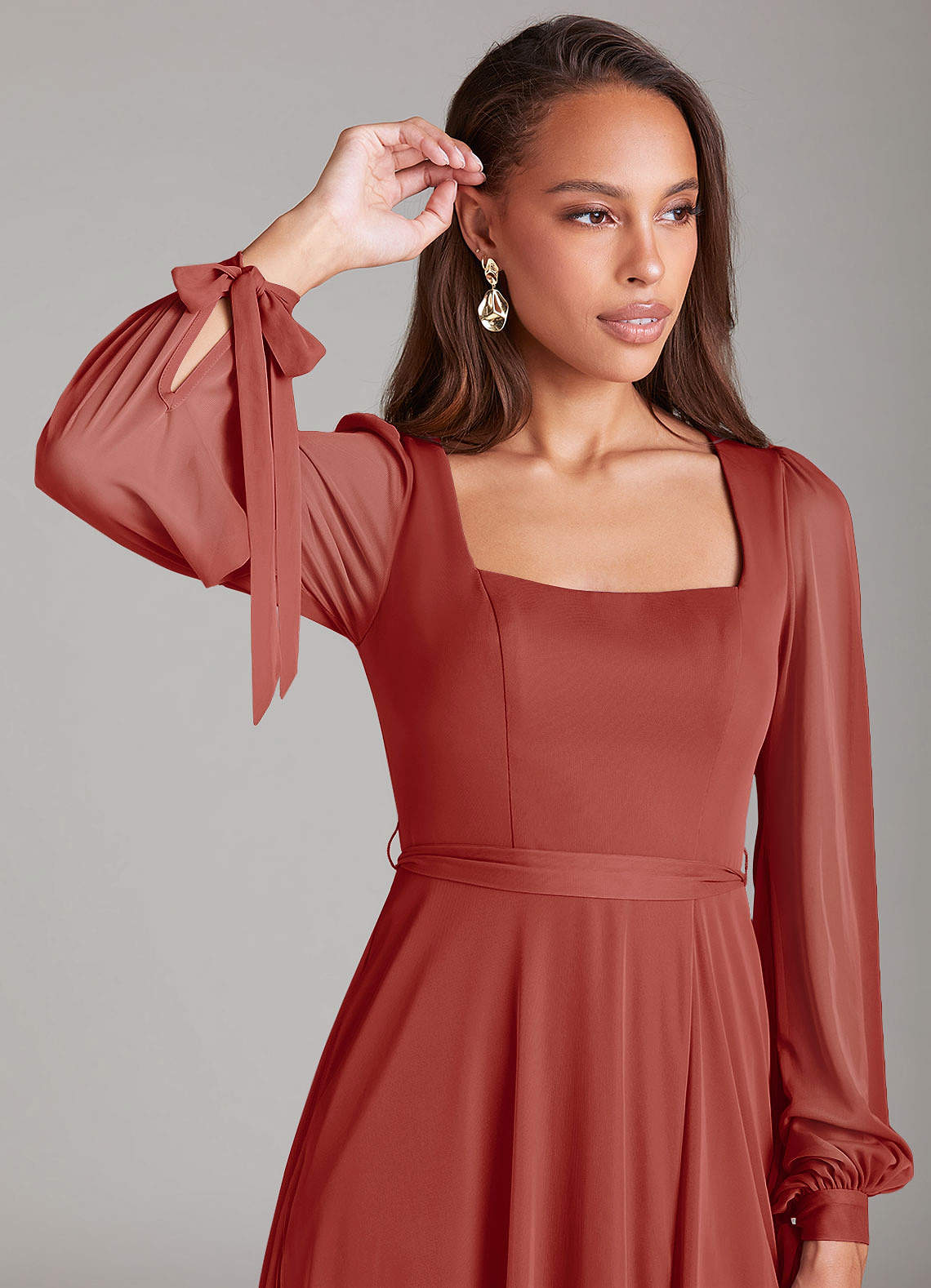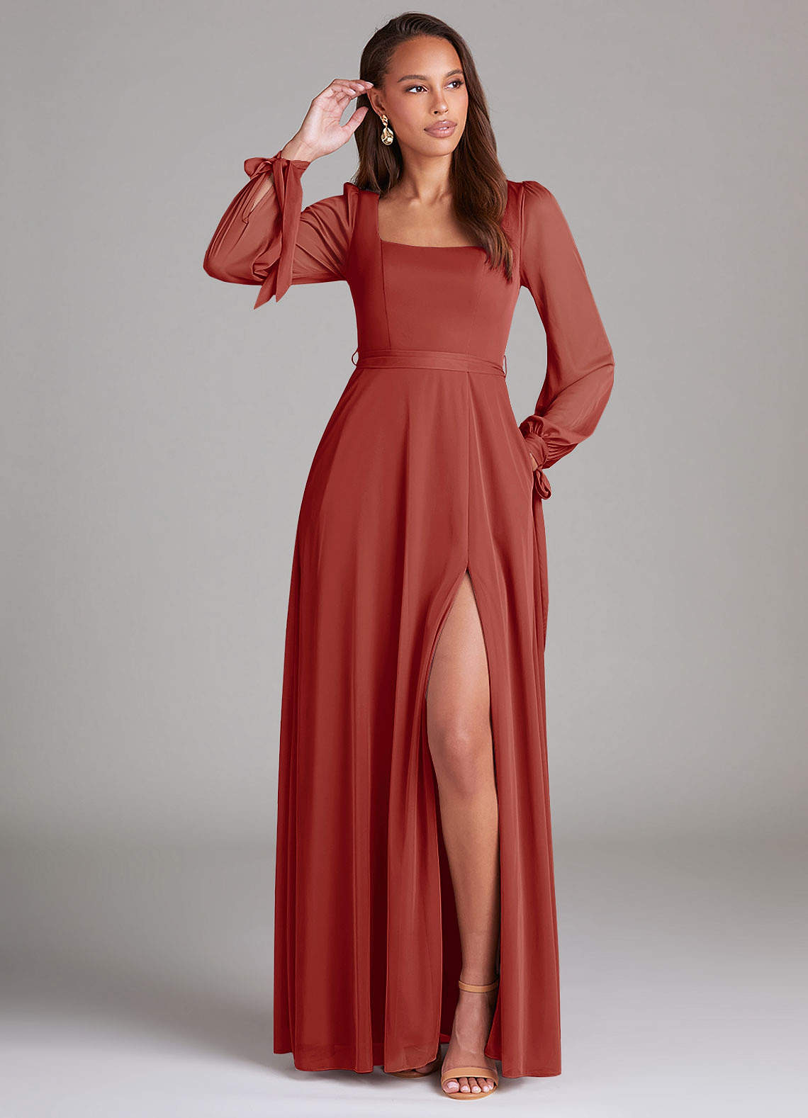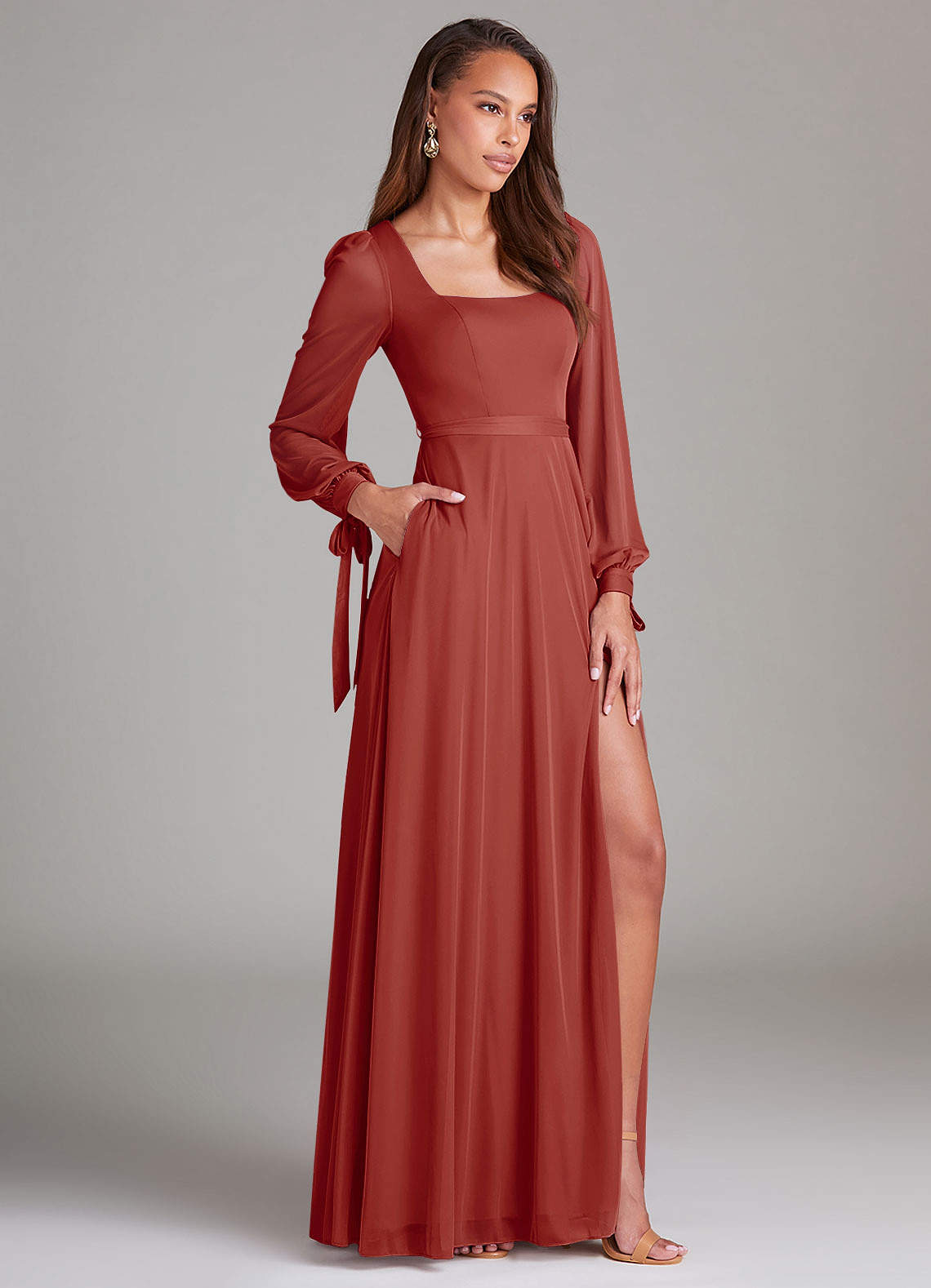 Für jedes Mädchen, das ein schlichtes Brautjungfernkleid sucht, ist Leonia die perfekte Wahl. Sie hat einen schmeichelhaften quadratischen Ausschnitt, wunderschöne Bischofsärmel, die zu einer Schleife um Ihr Handgelenk gebunden werden, und einen Beinschlitz.
