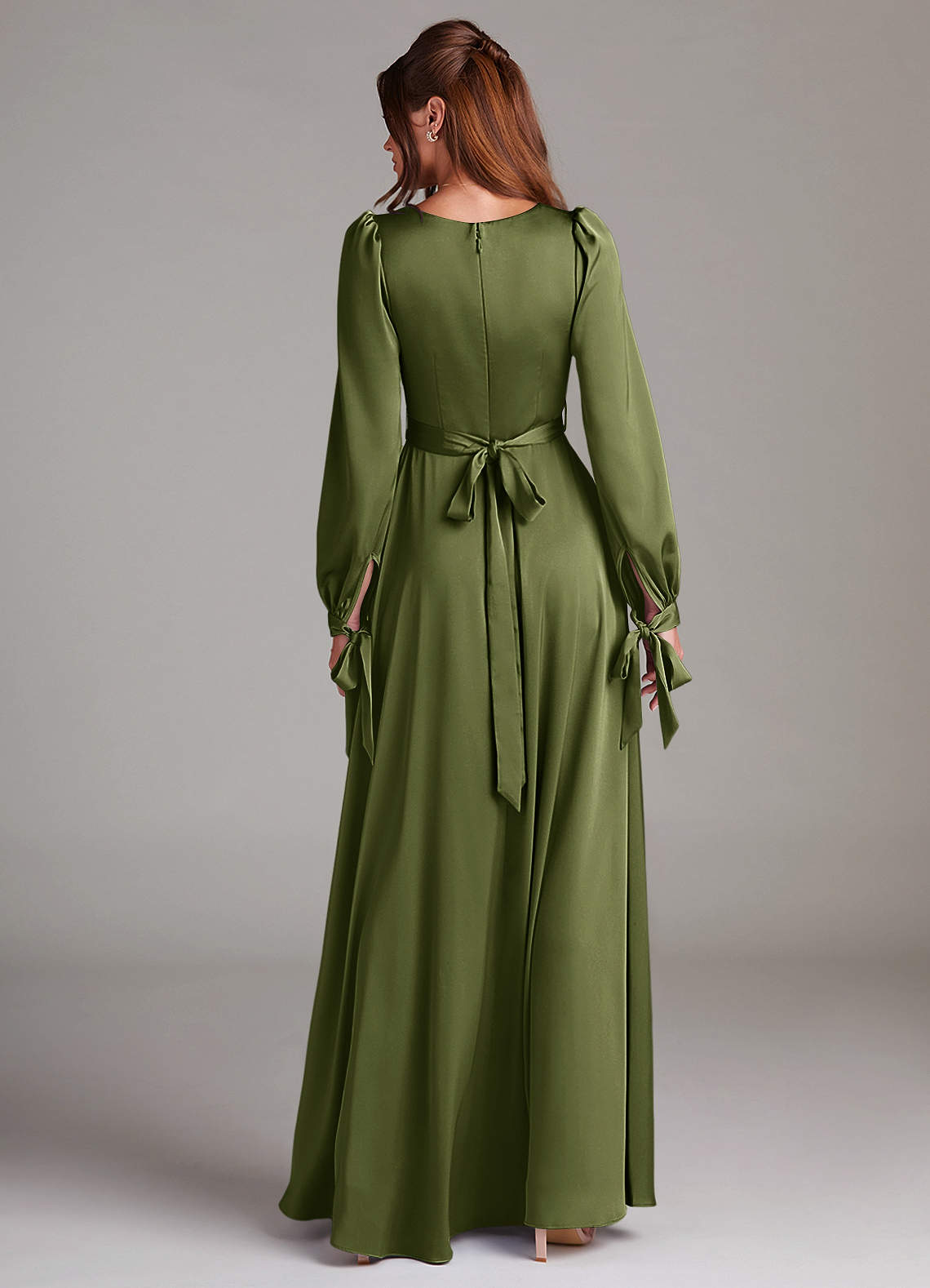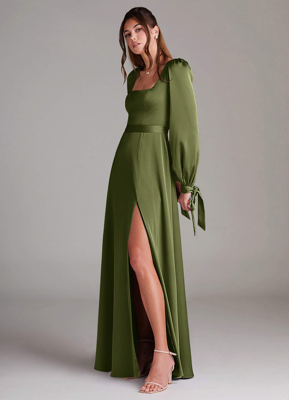 Für jedes Mädchen, das ein schlichtes Brautjungfernkleid sucht, ist Leonia die perfekte Wahl. Sie hat einen schmeichelhaften quadratischen Ausschnitt, wunderschöne Bischofsärmel, die zu einer Schleife um Ihr Handgelenk gebunden werden, und einen Beinschlitz.