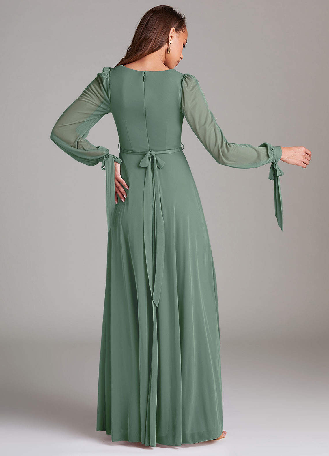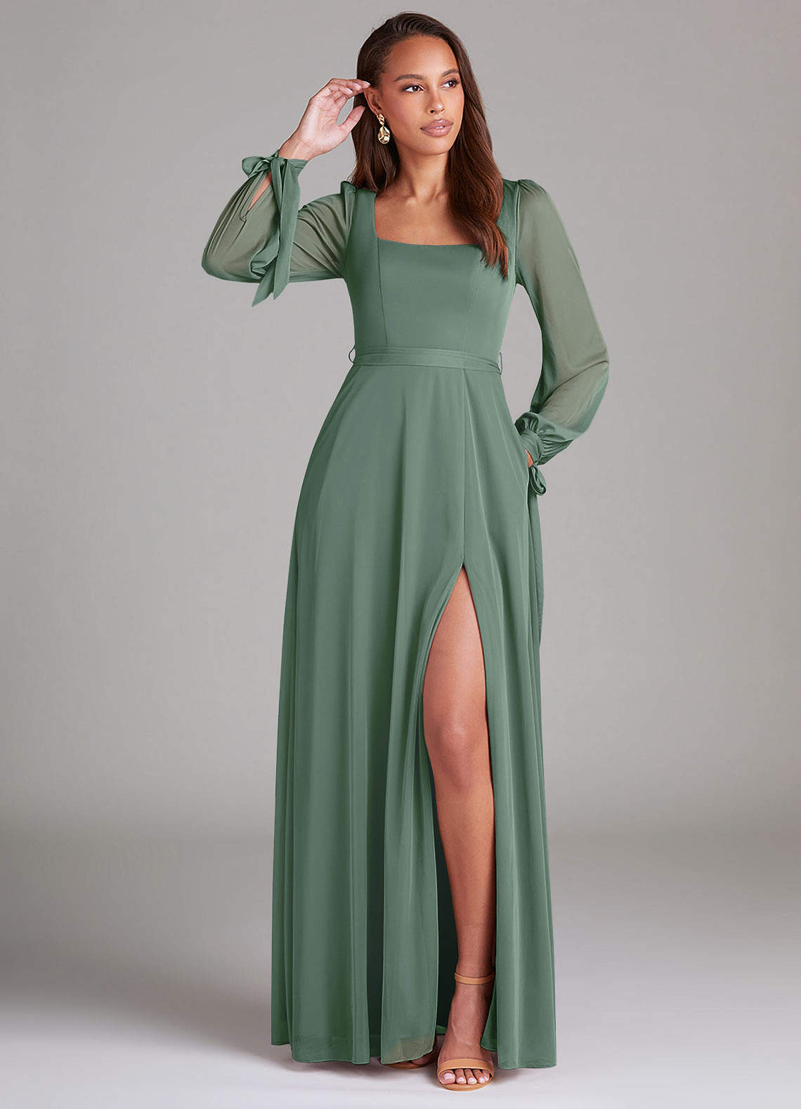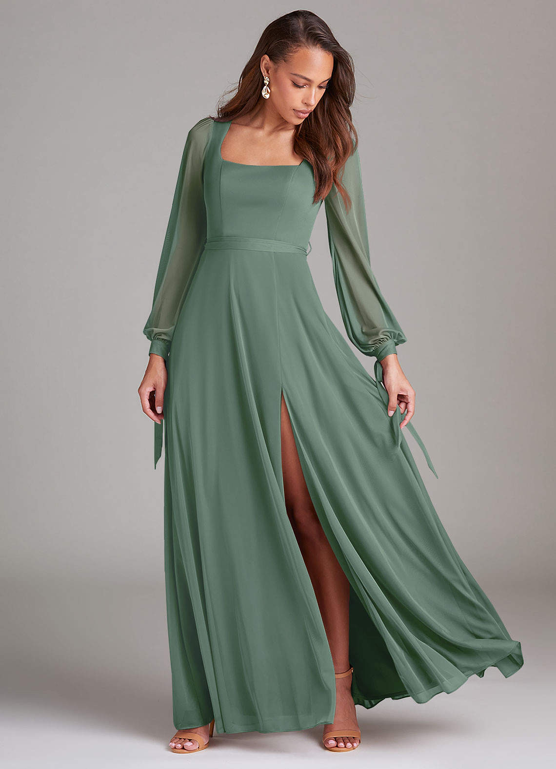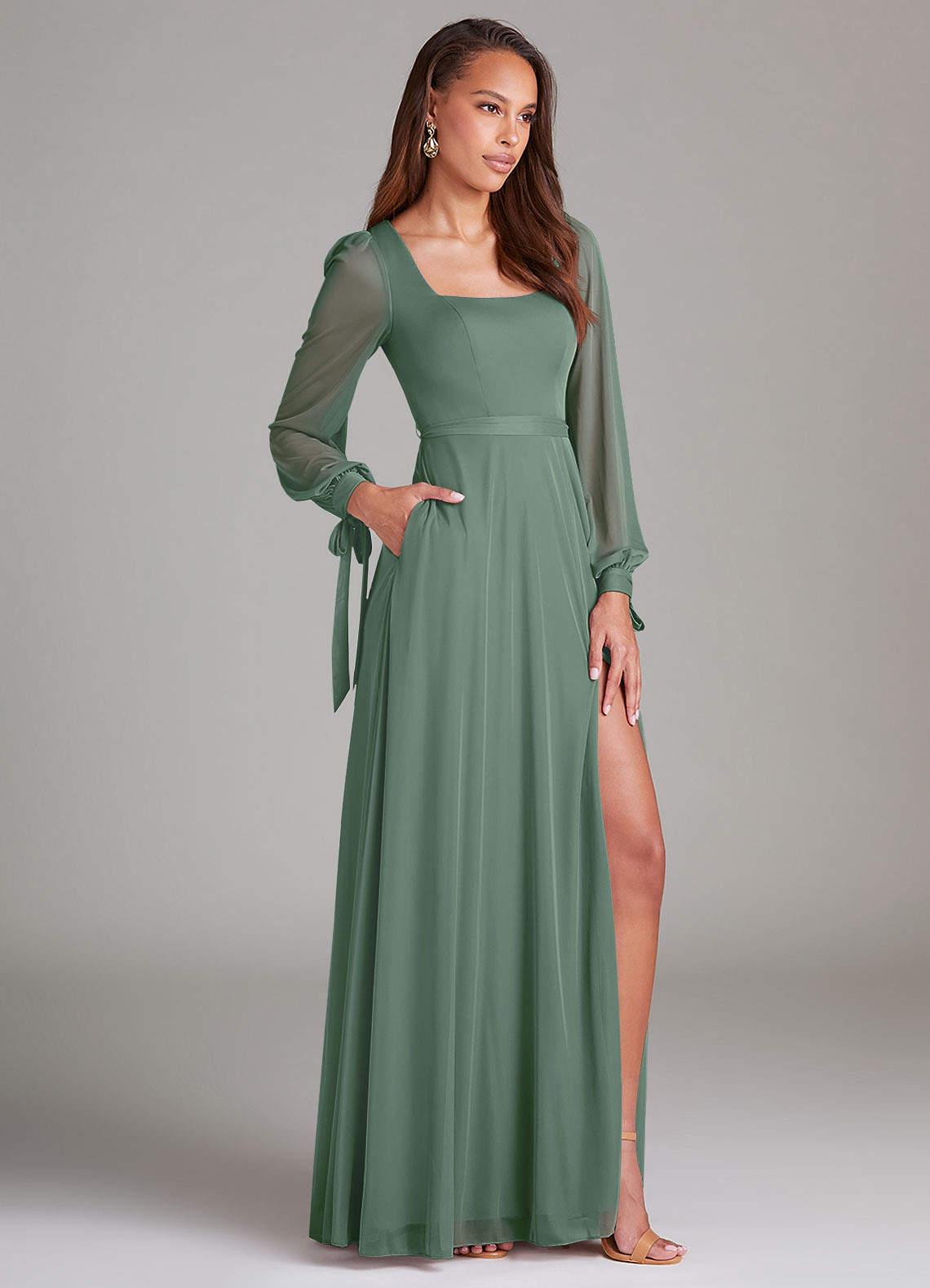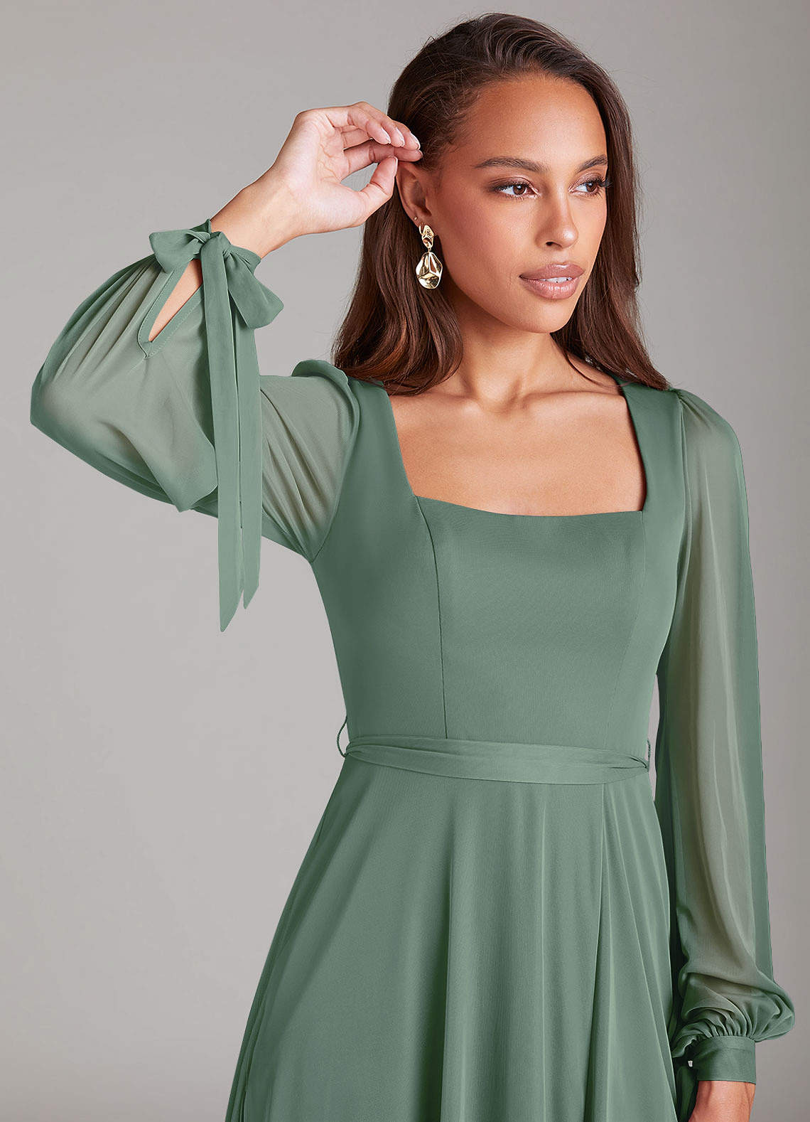 Für jedes Mädchen, das ein schlichtes Brautjungfernkleid sucht, ist Leonia die perfekte Wahl. Sie hat einen schmeichelhaften quadratischen Ausschnitt, wunderschöne Bischofsärmel, die zu einer Schleife um Ihr Handgelenk gebunden werden, und einen Beinschlitz.