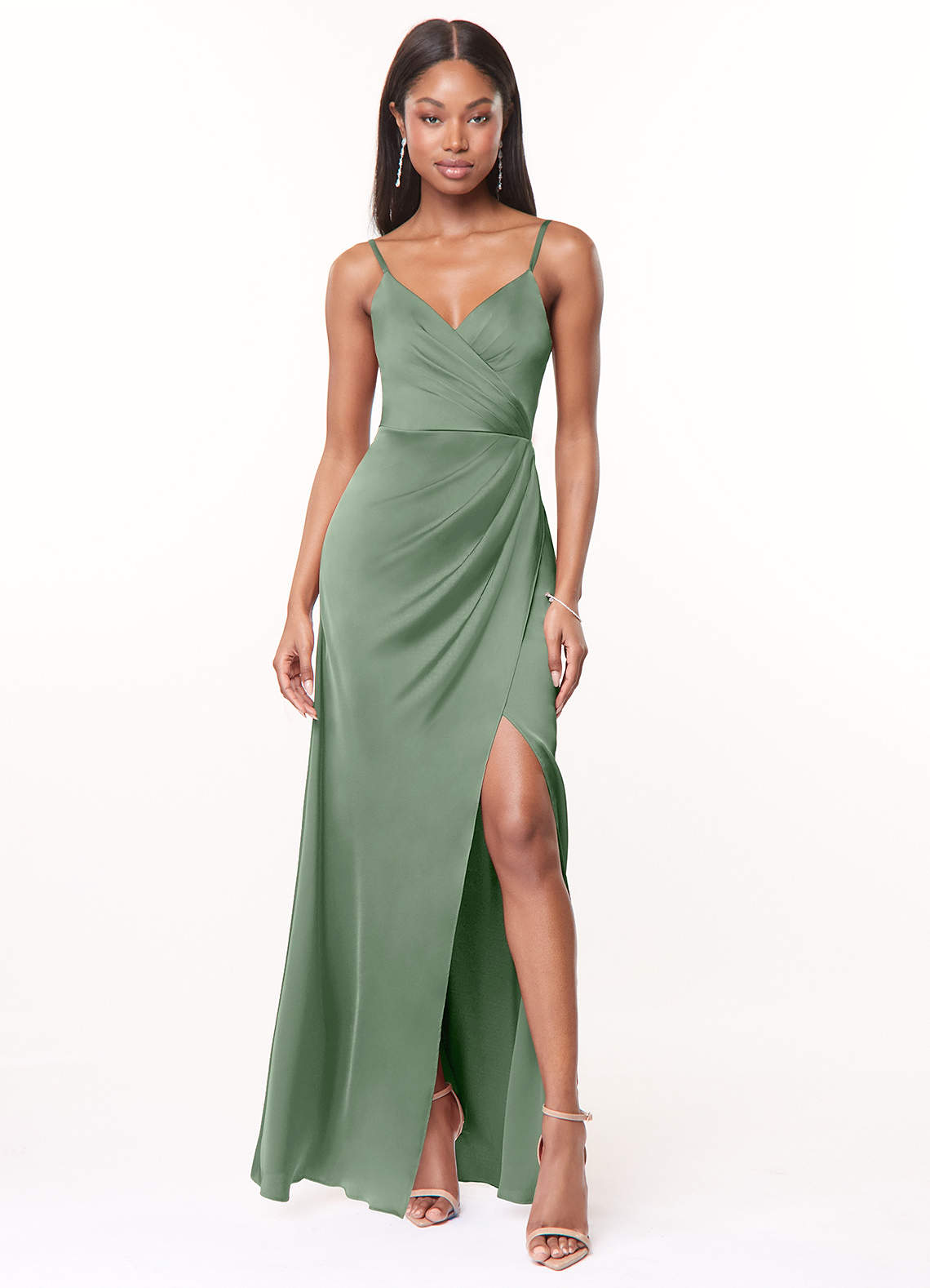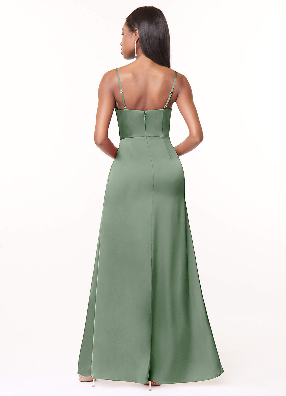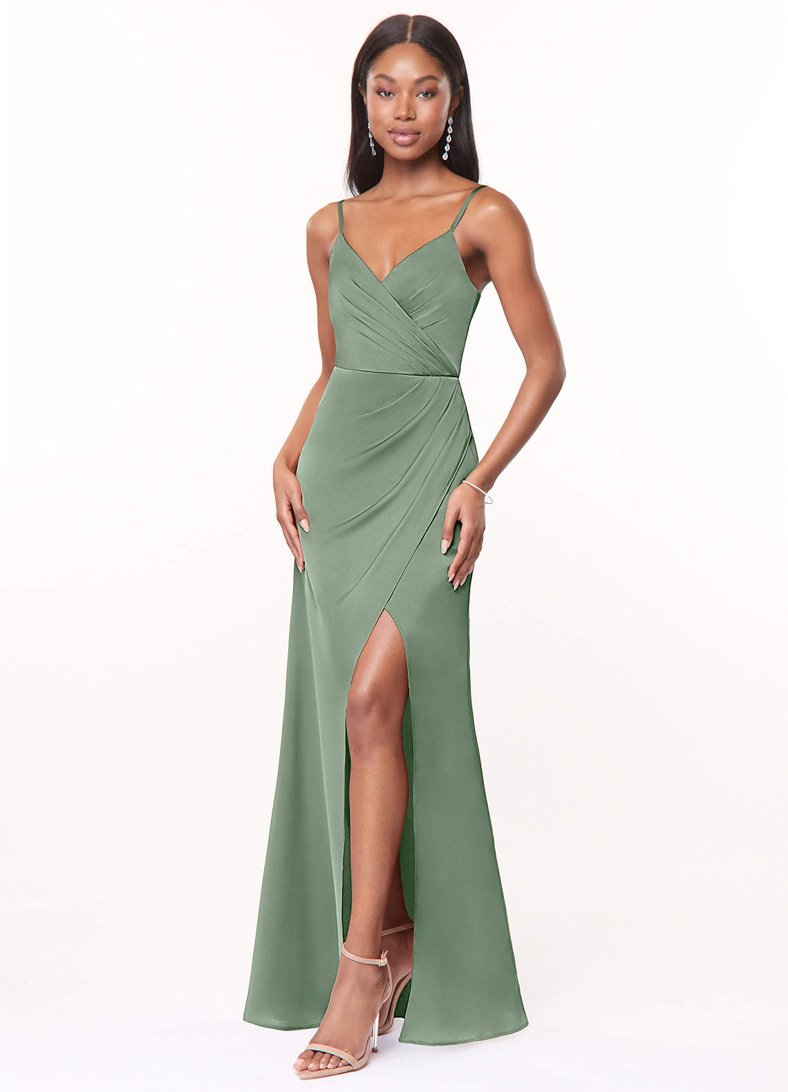 Halten Sie Ihre Brautparty stilvoll wie immer, während Sie unser Stretch-Satin-Spaltenkleid Maci tragen. Sie hat einen V-Ausschnitt, der von zarten Spaghettiträgern gehalten wird, ergänzt durch weiche Falten, die anmutig in den drapierten Rock fließen, der sich zu einem Beinschlitz öffnet.