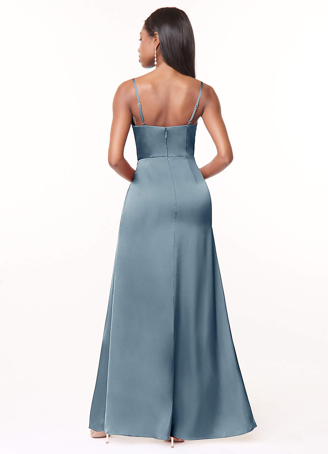 Halten Sie Ihre Brautparty stilvoll wie immer, während Sie unser Stretch-Satin-Spaltenkleid Maci tragen. Sie hat einen V-Ausschnitt, der von zarten Spaghettiträgern gehalten wird, ergänzt durch weiche Falten, die anmutig in den drapierten Rock fließen, der sich zu einem Beinschlitz öffnet.