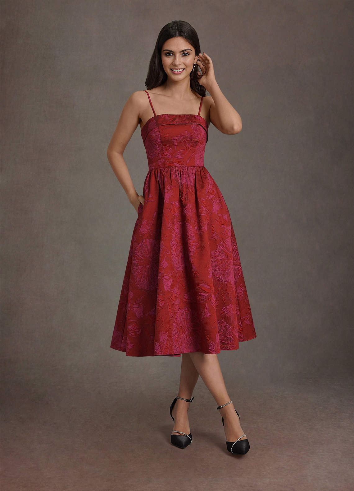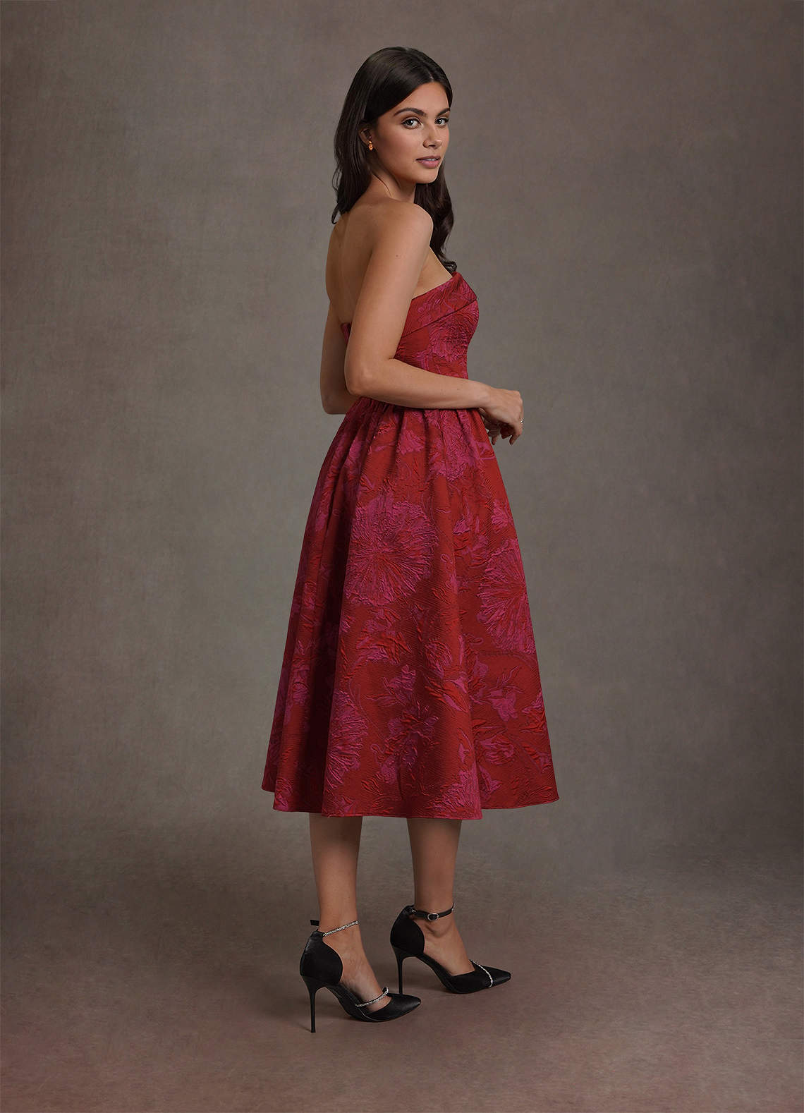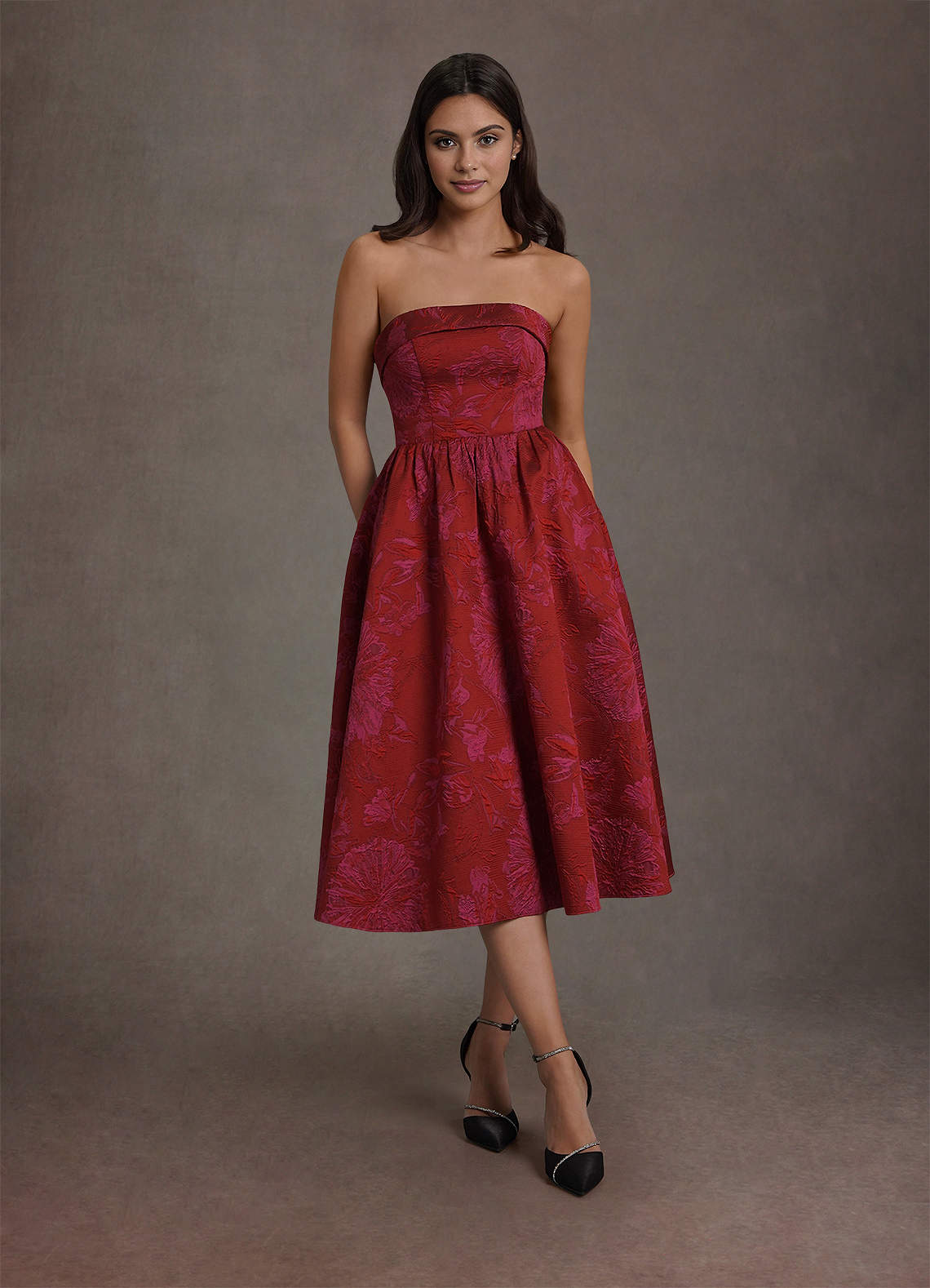 Das Midikleid Madeline präsentiert luxuriösen floralen Jacquardstoff in einer A-Linien-Silhouette und bietet einen anspruchsvollen und zeitlosen Look, der sich ideal für formelle Veranstaltungen und besondere Anlässe eignet.
