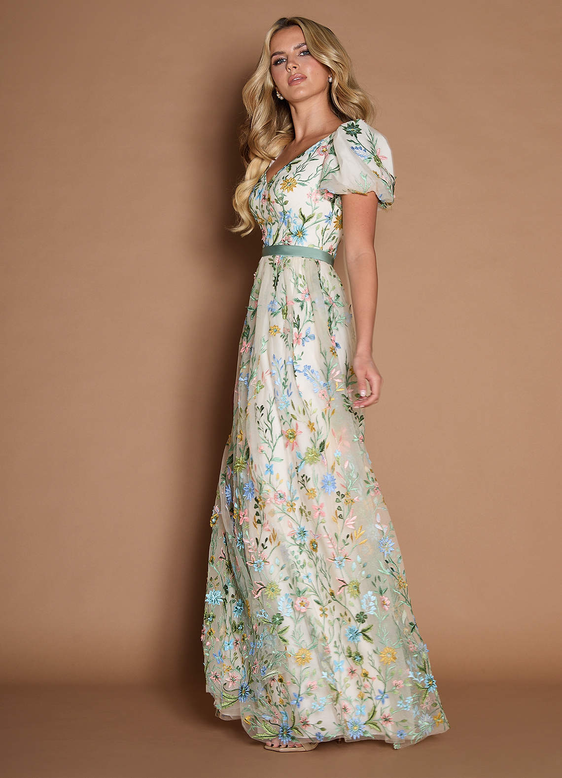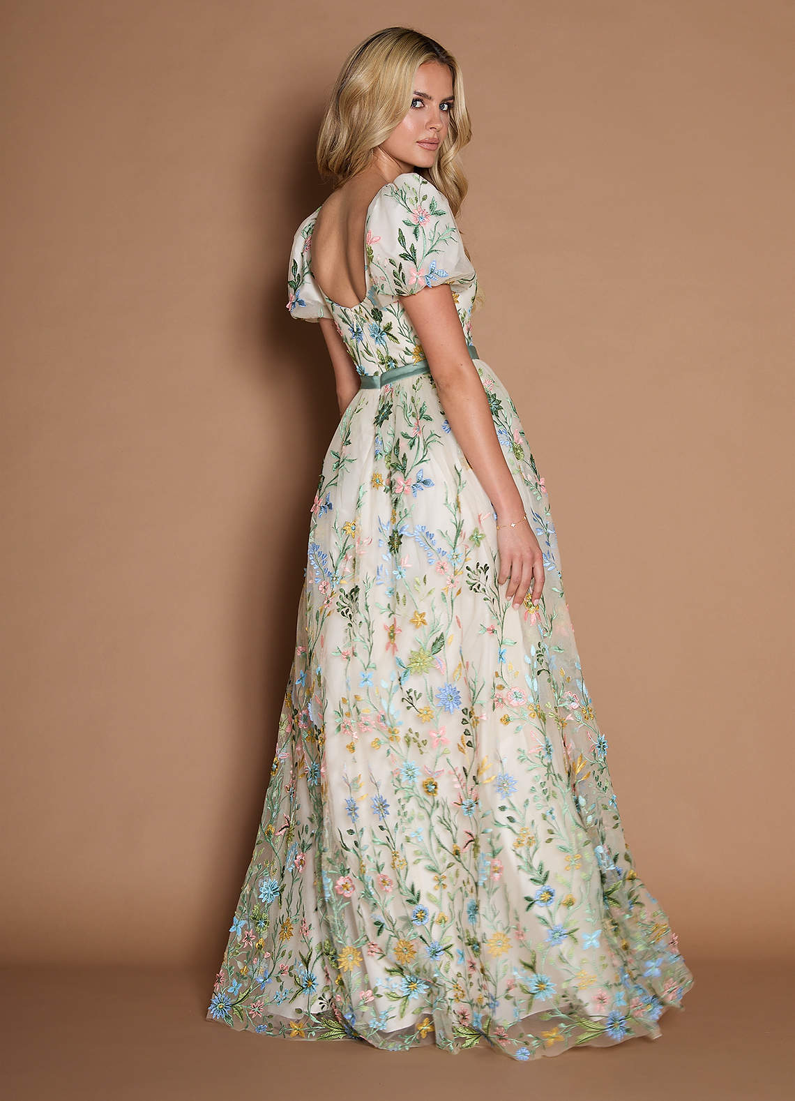 Mit dem Marisa Maxikleid fallen Sie bei Ihrem nächsten besonderen Anlass garantiert auf. Dieses wunderschöne, mit 3D-Blumen bestickte Kleid besticht durch einen V-Ausschnitt, kurze Puffärmel und einen bodenlangen A-Linien-Rock mit Taschen. Tragen Sie es zu einer Hochzeitsfeier oder Ihrem nächsten besonderen Anlass.