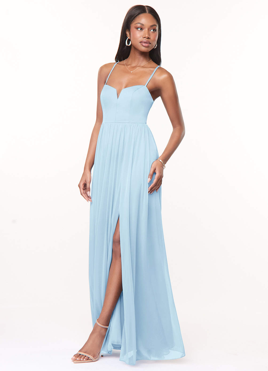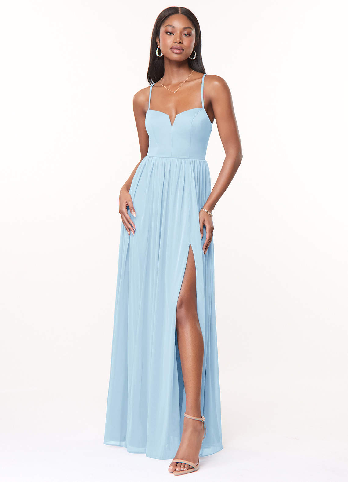 Marsol ist unser atemberaubendes Brautjungfernkleid aus Mesh. Sie hat einen V-Ausschnitt mit Spaghettiträgern, die zu einem Schnürrücken führen. Der Look wird durch einen Rock in A-Linie und einen Beinschlitz abgerundet.