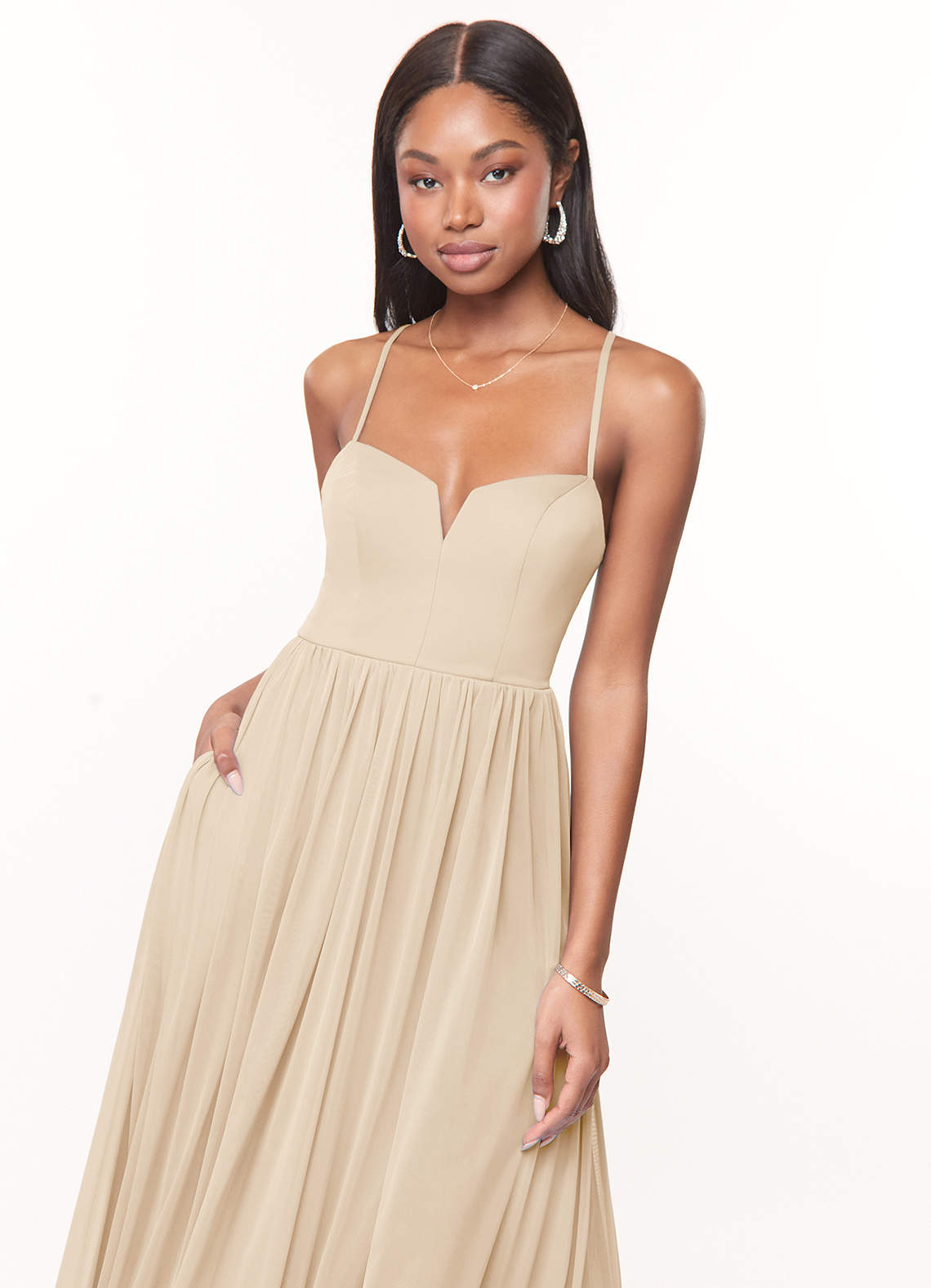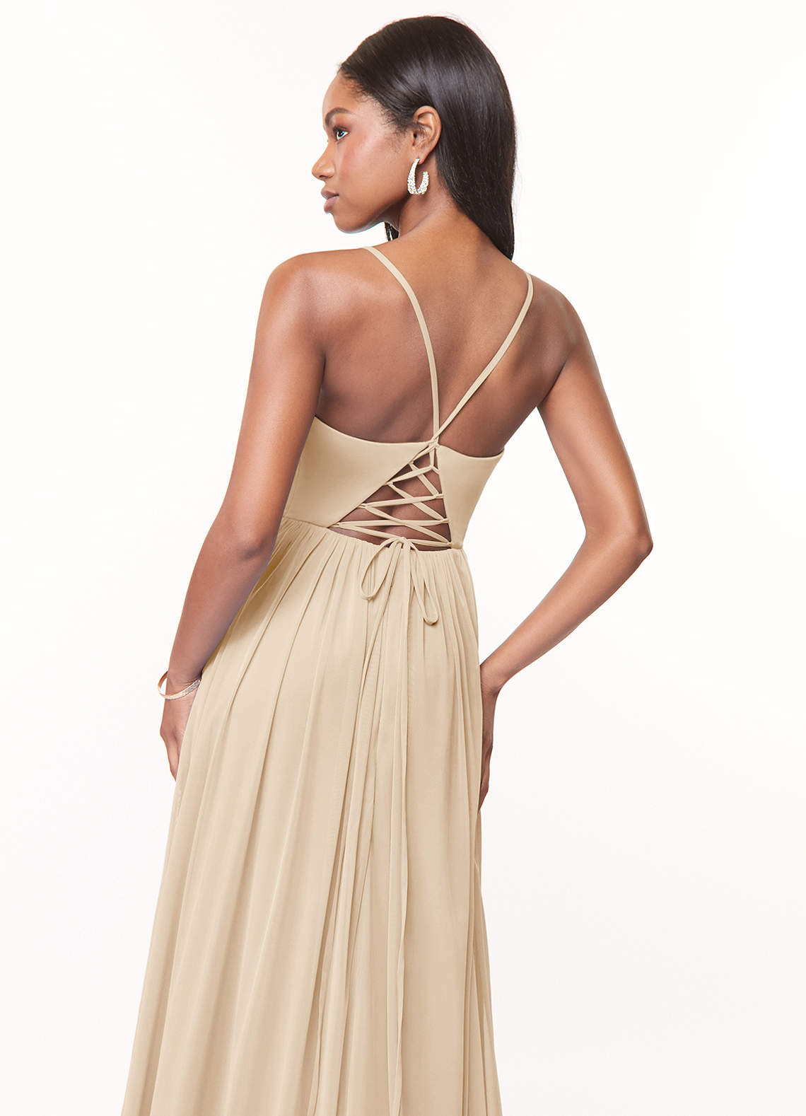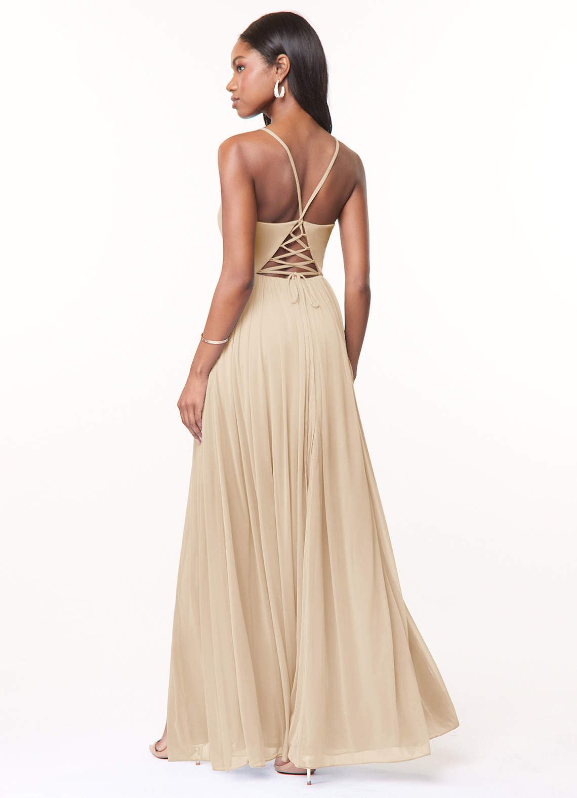 Marsol ist unser atemberaubendes Brautjungfernkleid aus Mesh. Sie hat einen V-Ausschnitt mit Spaghettiträgern, die zu einem Schnürrücken führen. Der Look wird durch einen Rock in A-Linie und einen Beinschlitz abgerundet.