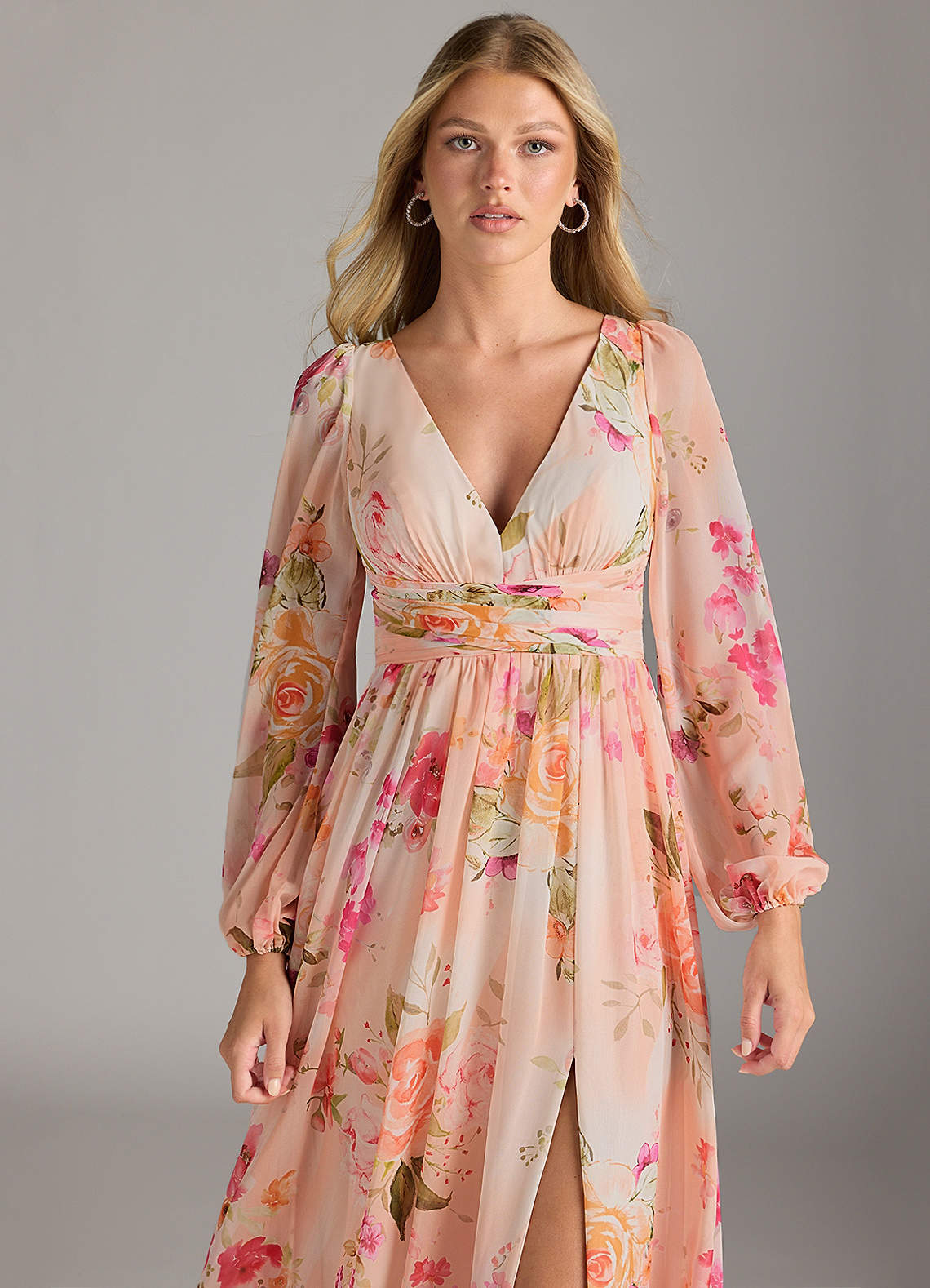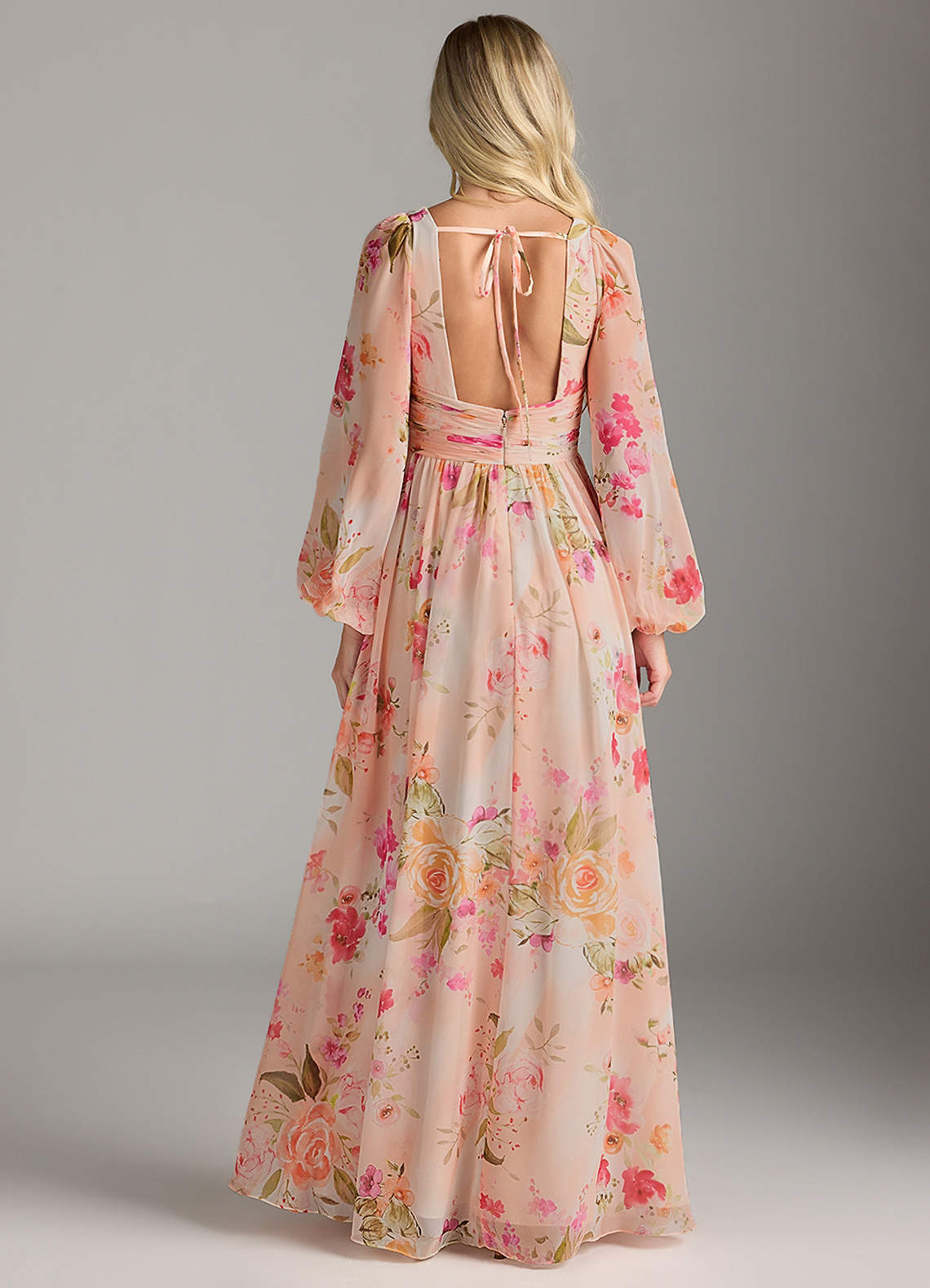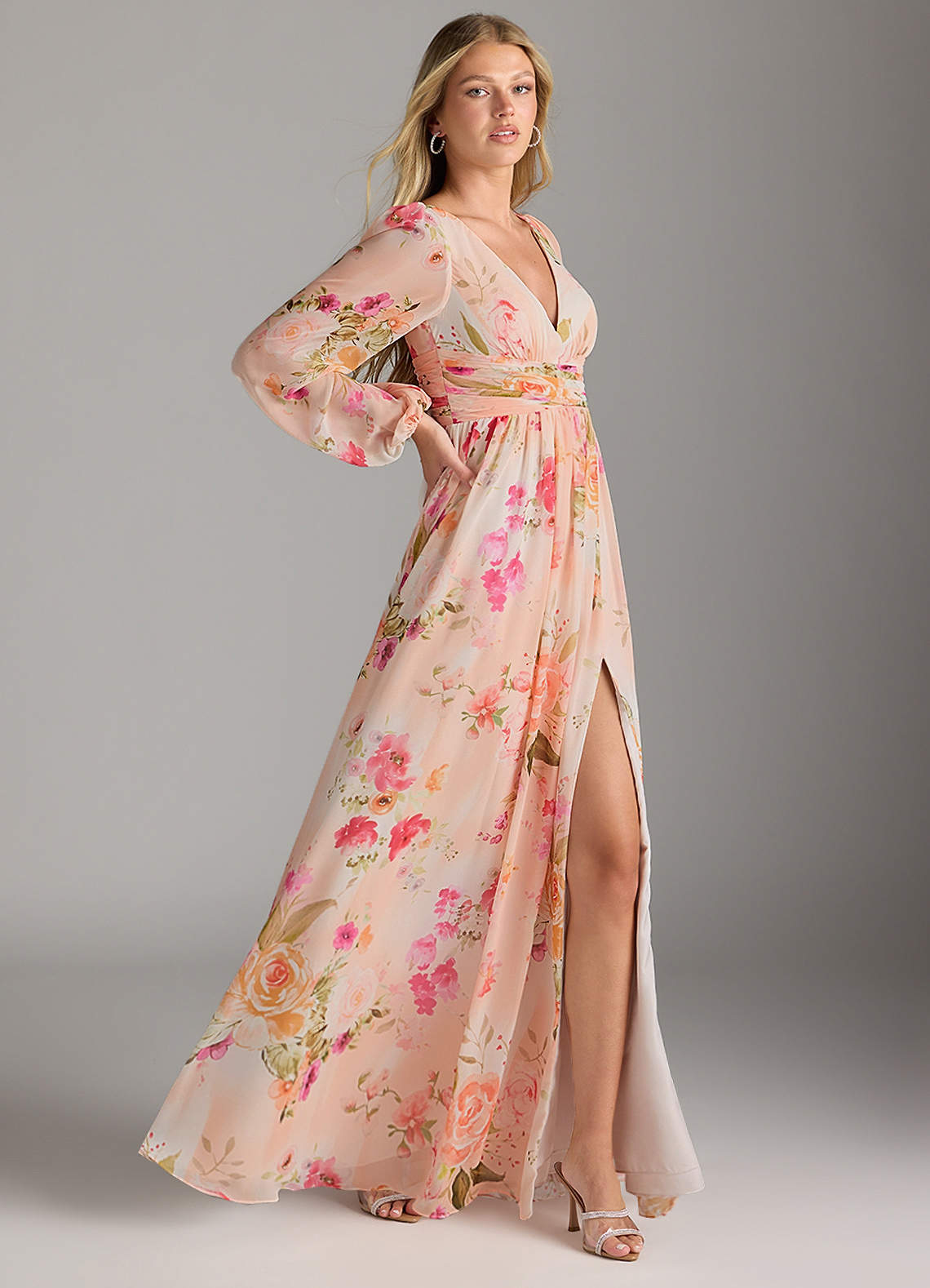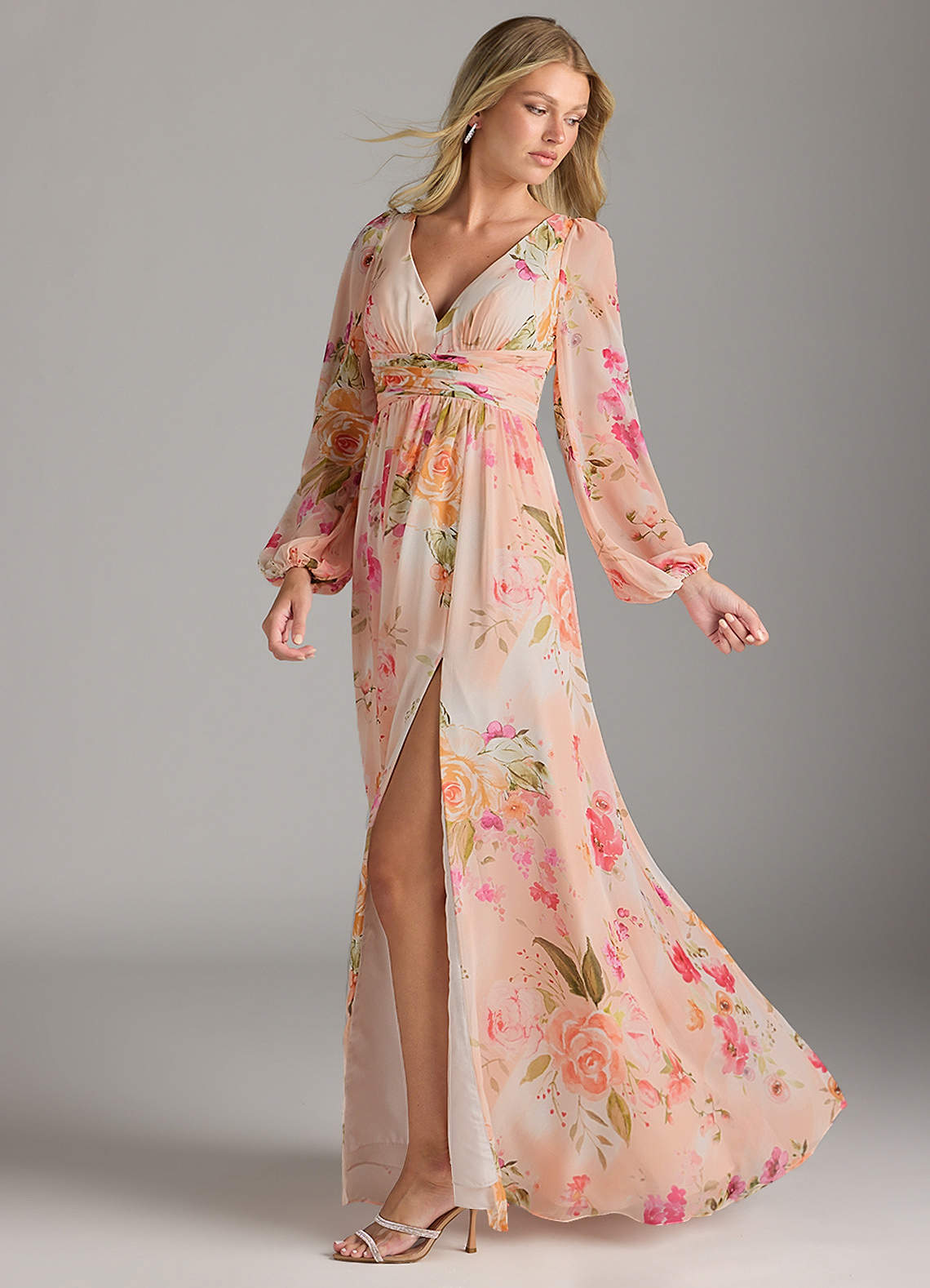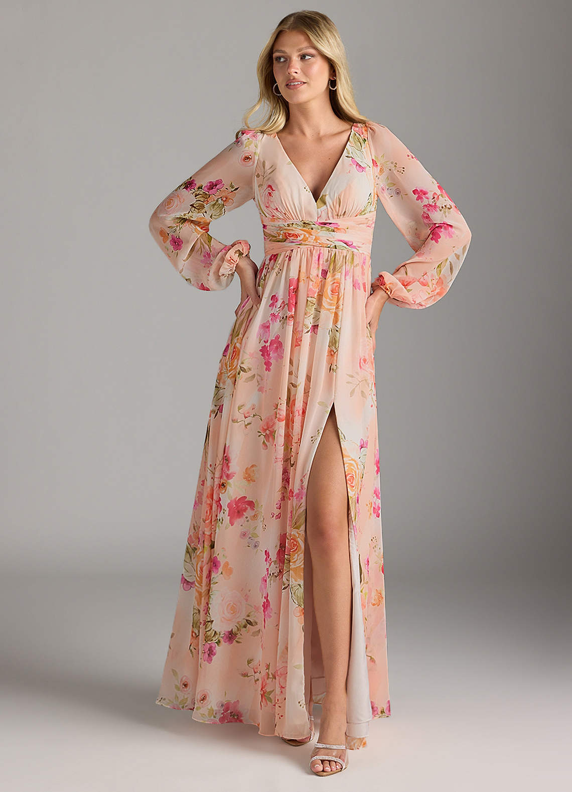 Sorgen Sie dafür, dass Ihre Brautjungfern mit unserem A-Linien-Chiffonkleid Norah großartig aussehen. Ihr V-Ausschnitt hat eine zarte Raffung und einen plissierten Empire-Bund. Lange Blousonärmel ergänzen das Oberteil. Der geraffte A-Linien-Rock fließt dank des Beinschlitzes bei jedem Schritt mit.