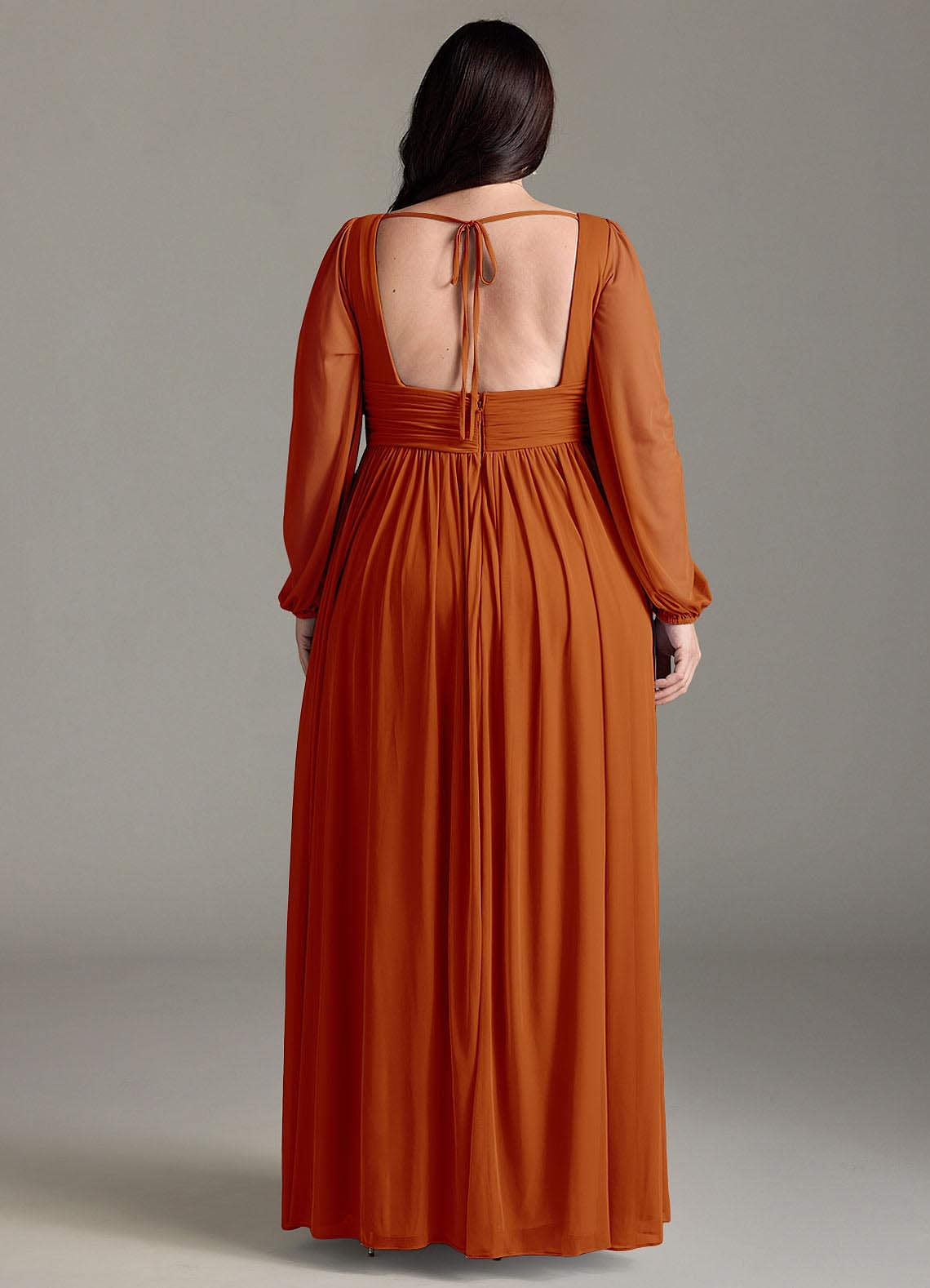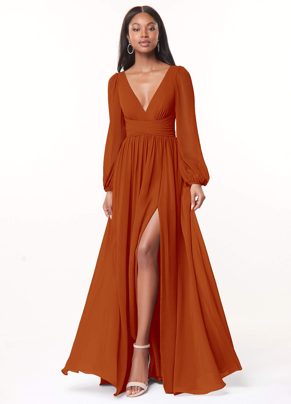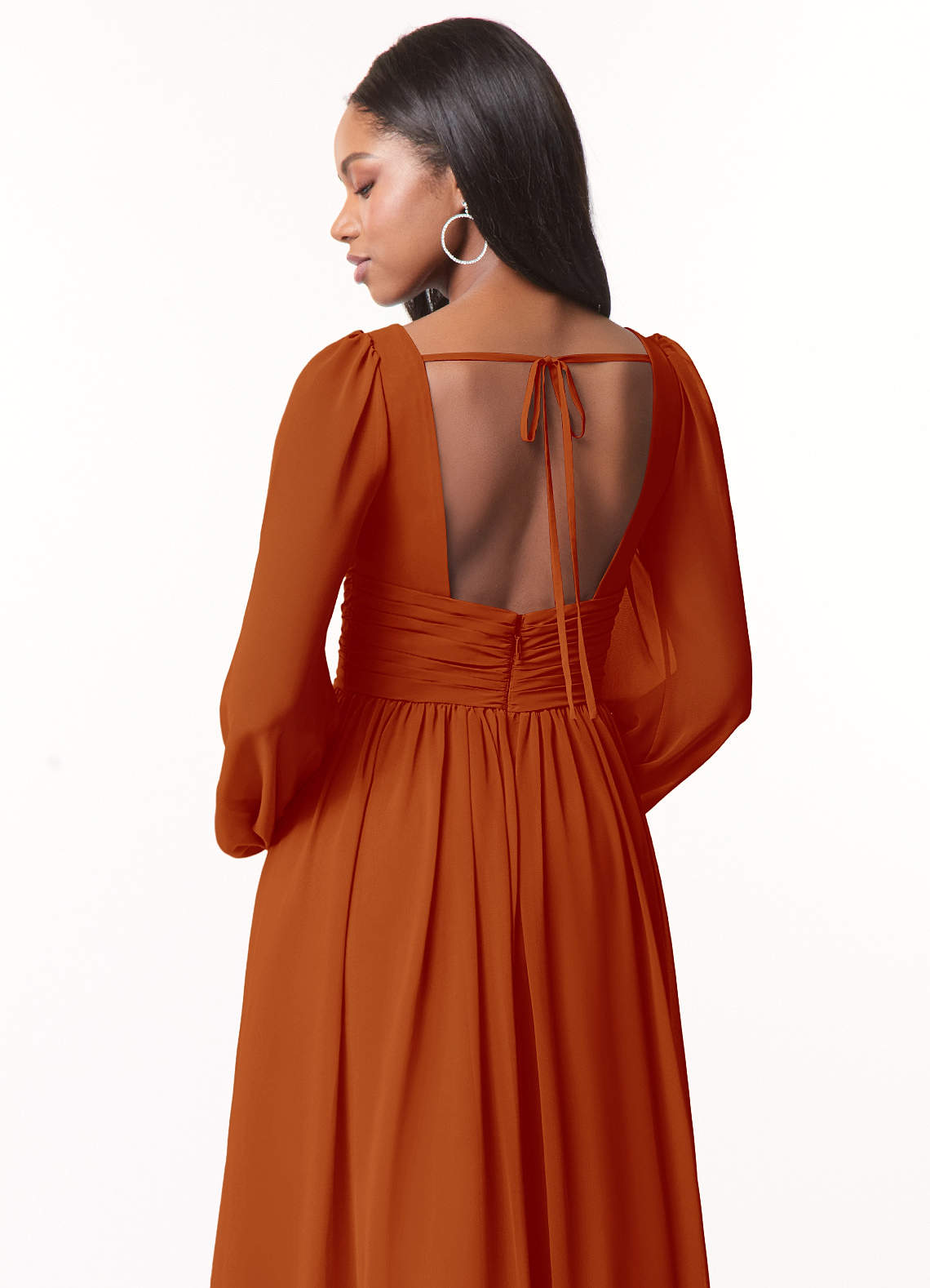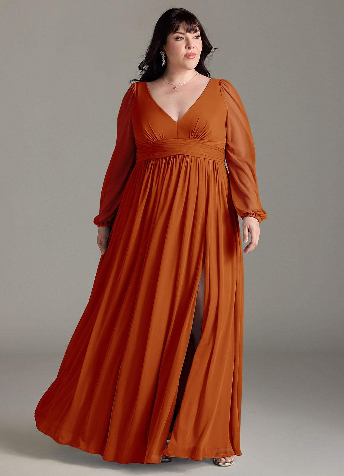 Sorgen Sie dafür, dass Ihre Brautjungfern mit unserem A-Linien-Chiffonkleid Norah großartig aussehen. Ihr V-Ausschnitt hat eine zarte Raffung und einen plissierten Empire-Bund. Lange Blousonärmel ergänzen das Oberteil. Der geraffte A-Linien-Rock fließt dank des Beinschlitzes bei jedem Schritt mit.