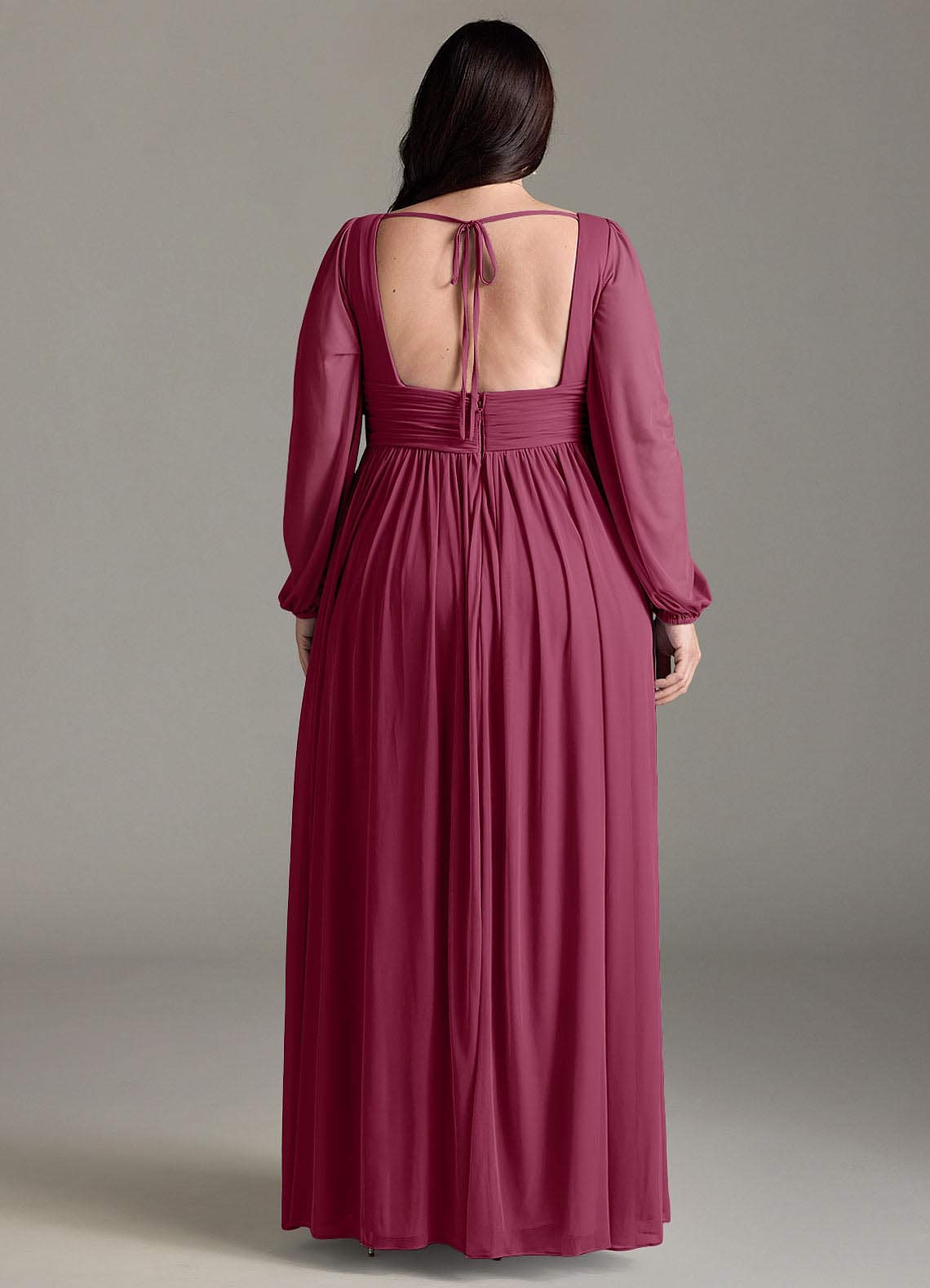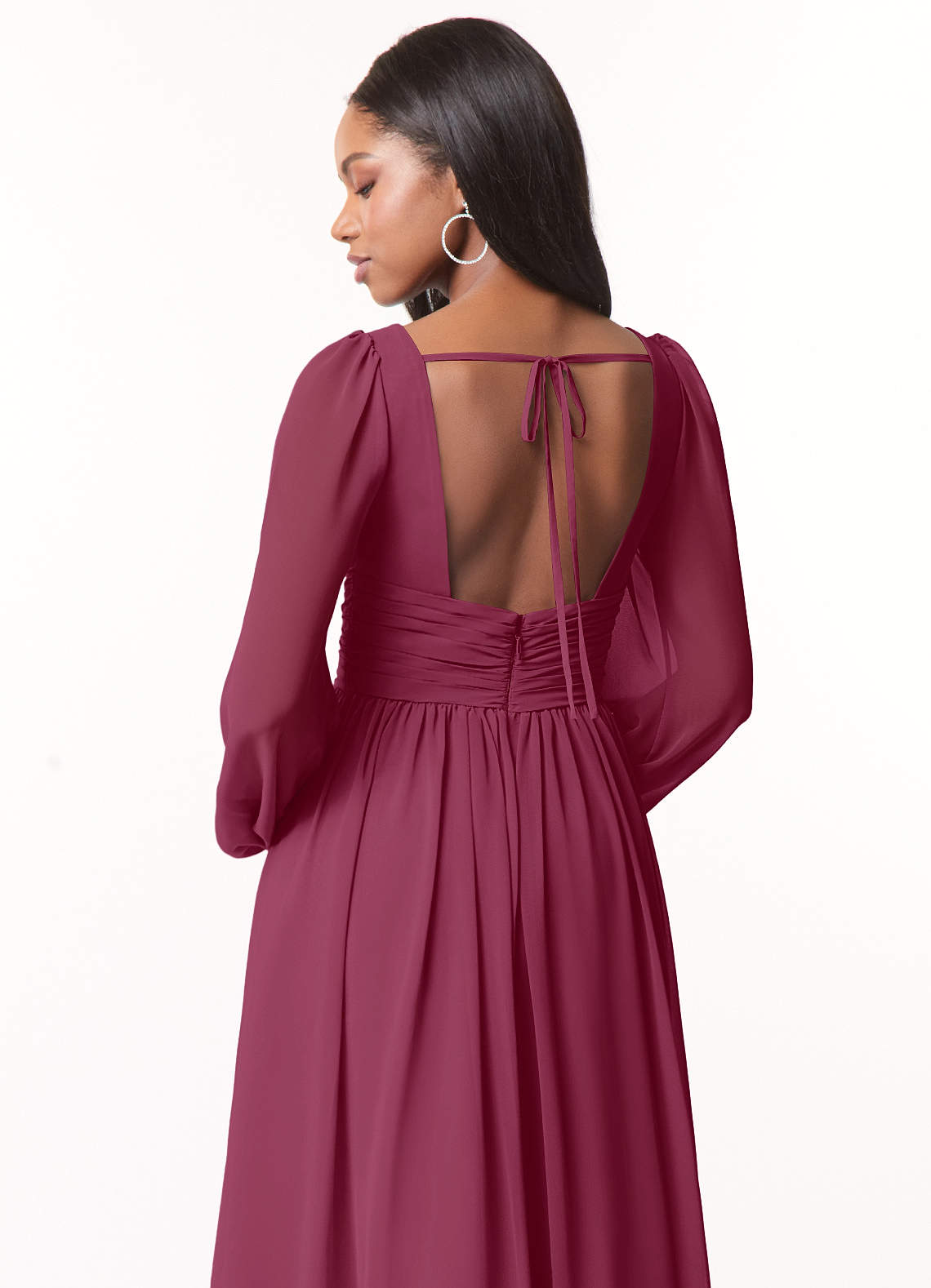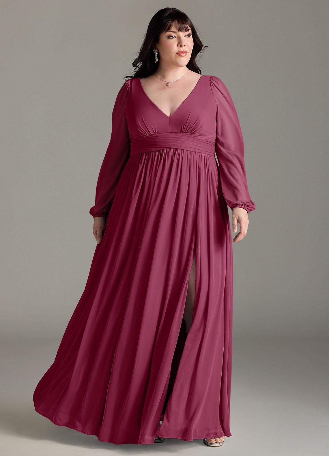 Sorgen Sie dafür, dass Ihre Brautjungfern mit unserem A-Linien-Chiffonkleid Norah großartig aussehen. Ihr V-Ausschnitt hat eine zarte Raffung und einen plissierten Empire-Bund. Lange Blousonärmel ergänzen das Oberteil. Der geraffte A-Linien-Rock fließt dank des Beinschlitzes bei jedem Schritt mit.
