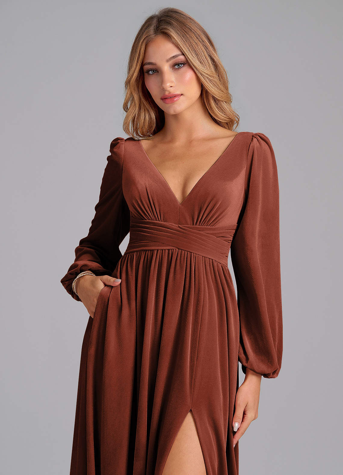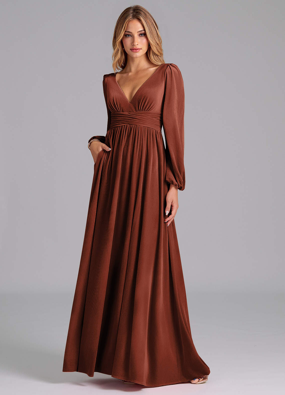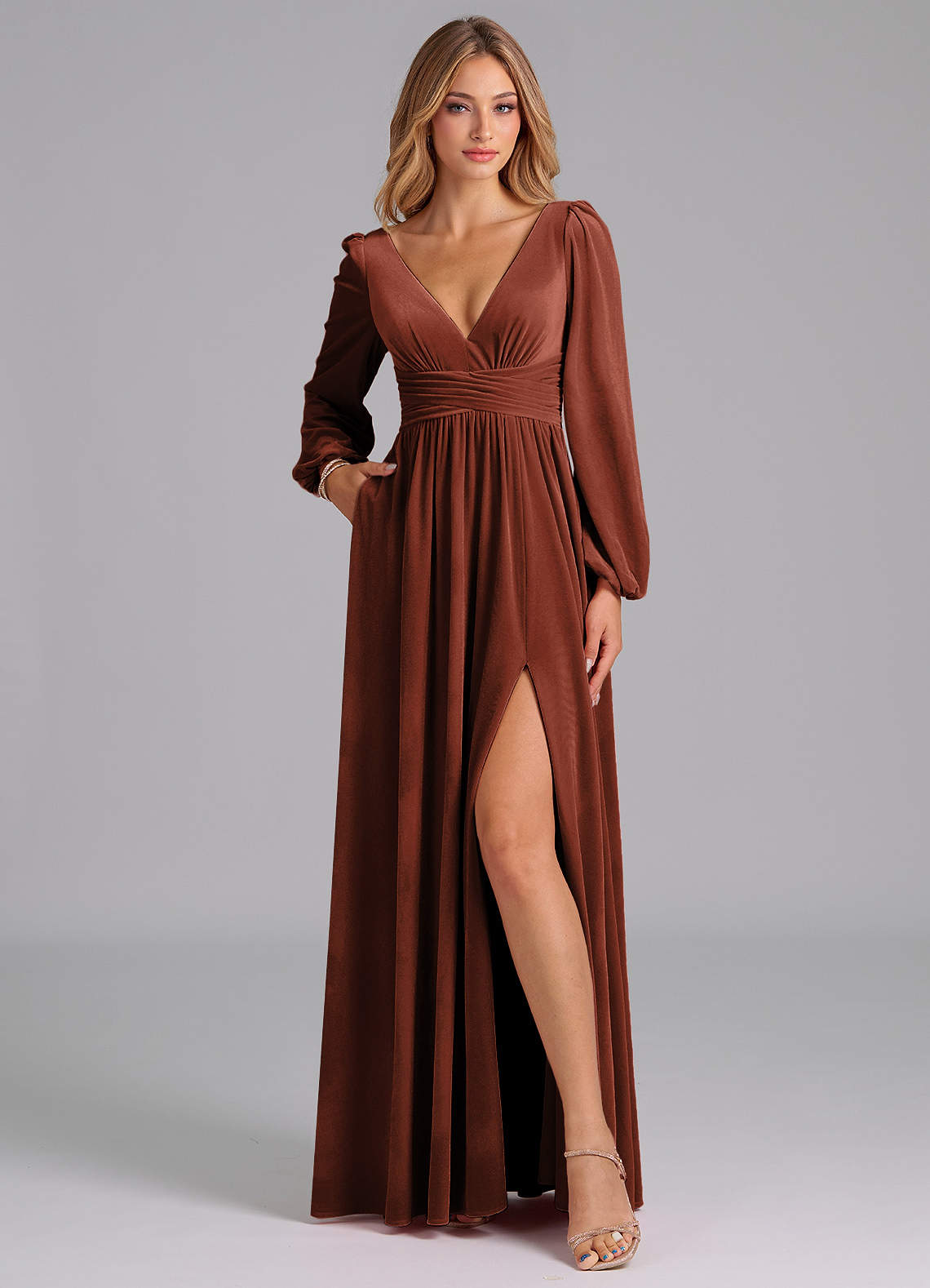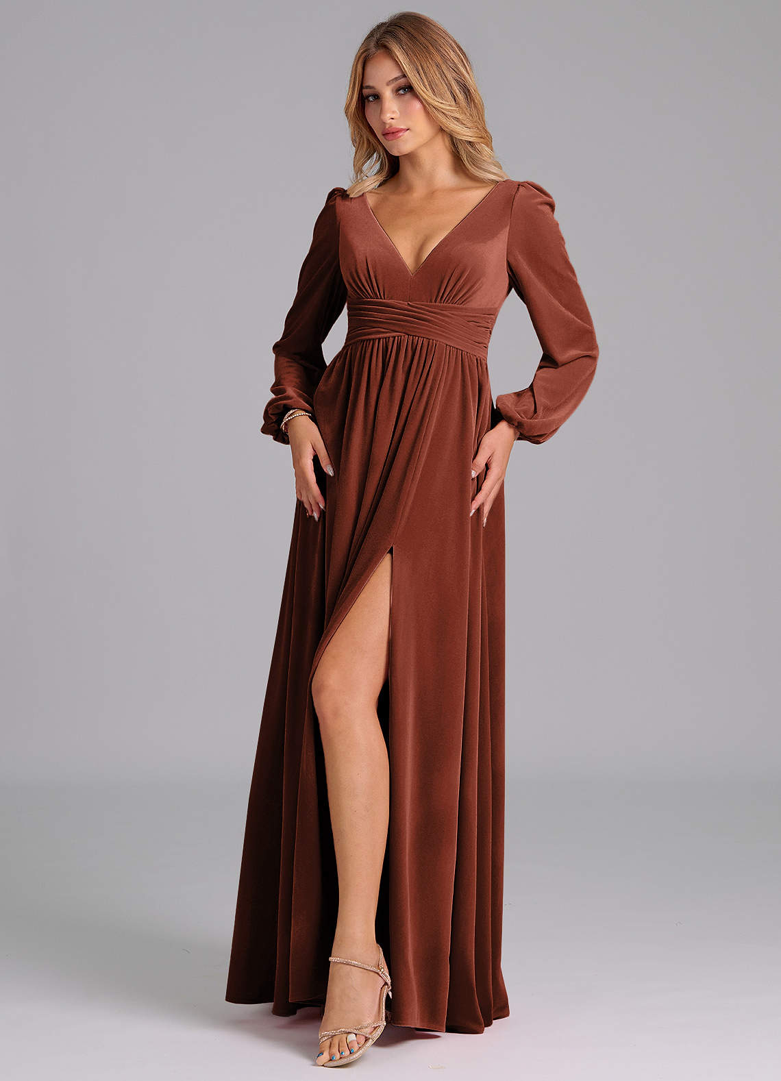 Lassen Sie Ihre Brautjungfern in unserem A-Linien-Samtkleid Norah einfach umwerfend aussehen. Der V-Ausschnitt ist zart gerafft und mit einem plissierten Empire-Bund versehen. Lange Blousonärmel harmonieren perfekt mit dem Oberteil. Der geraffte A-Linien-Rock schwingt dank des Beinschlitzes bei jedem Schritt.