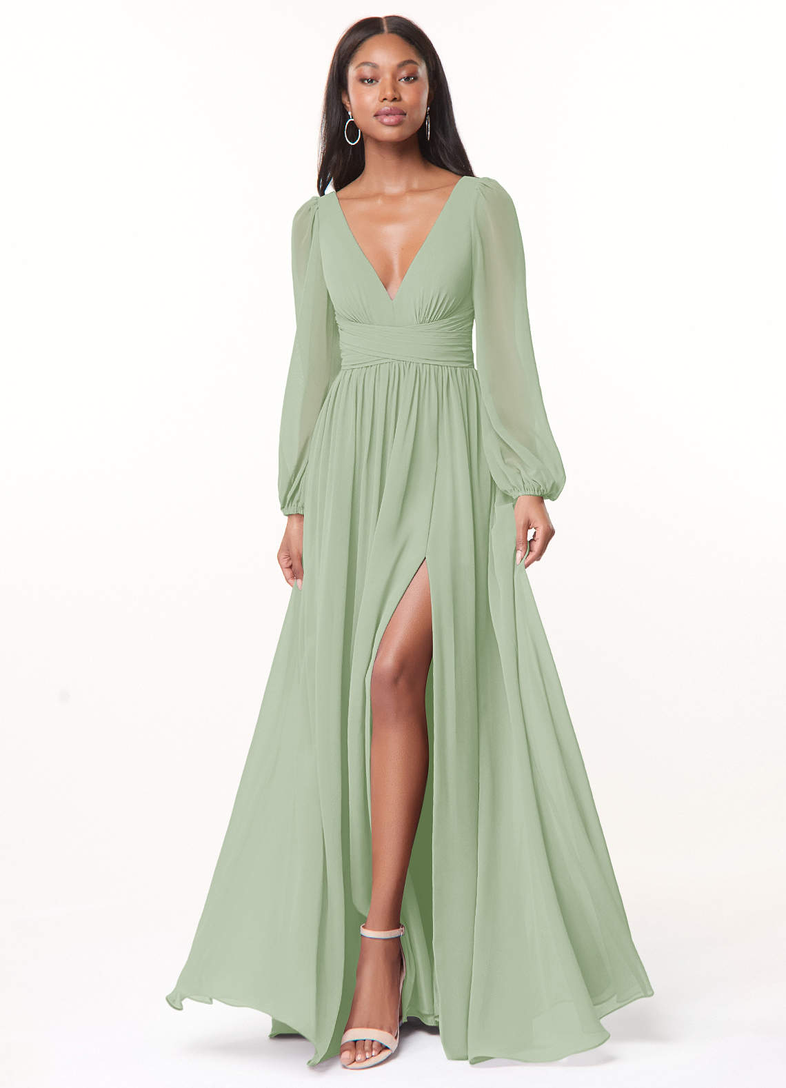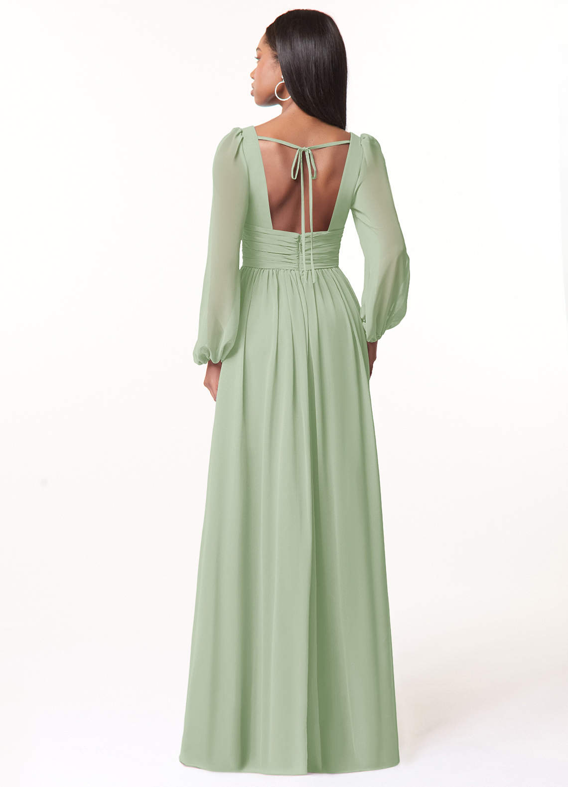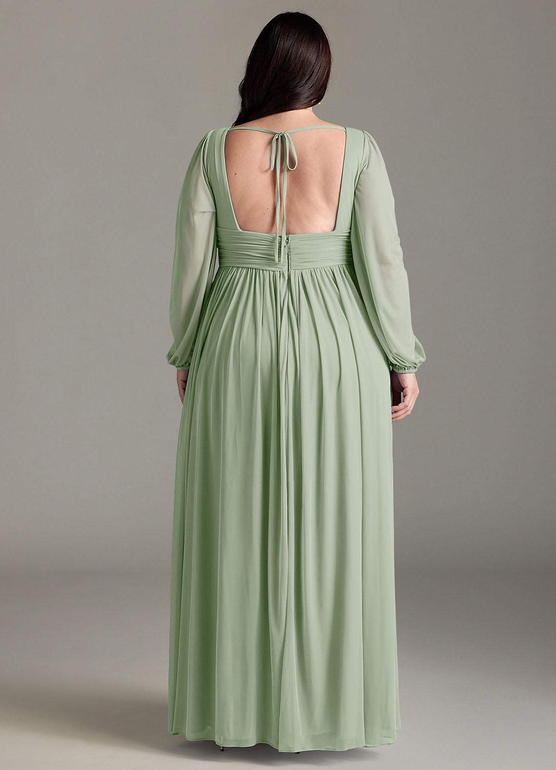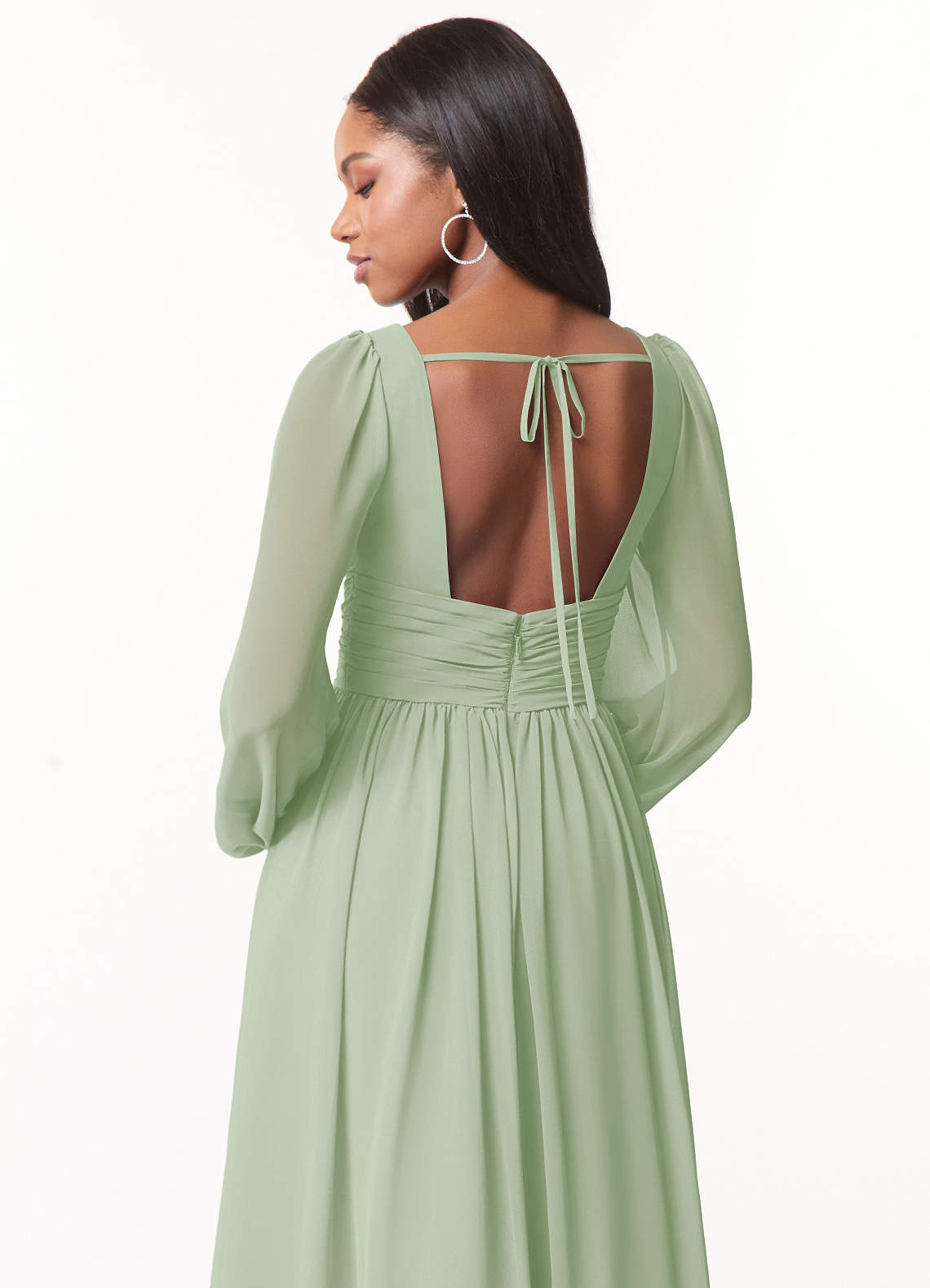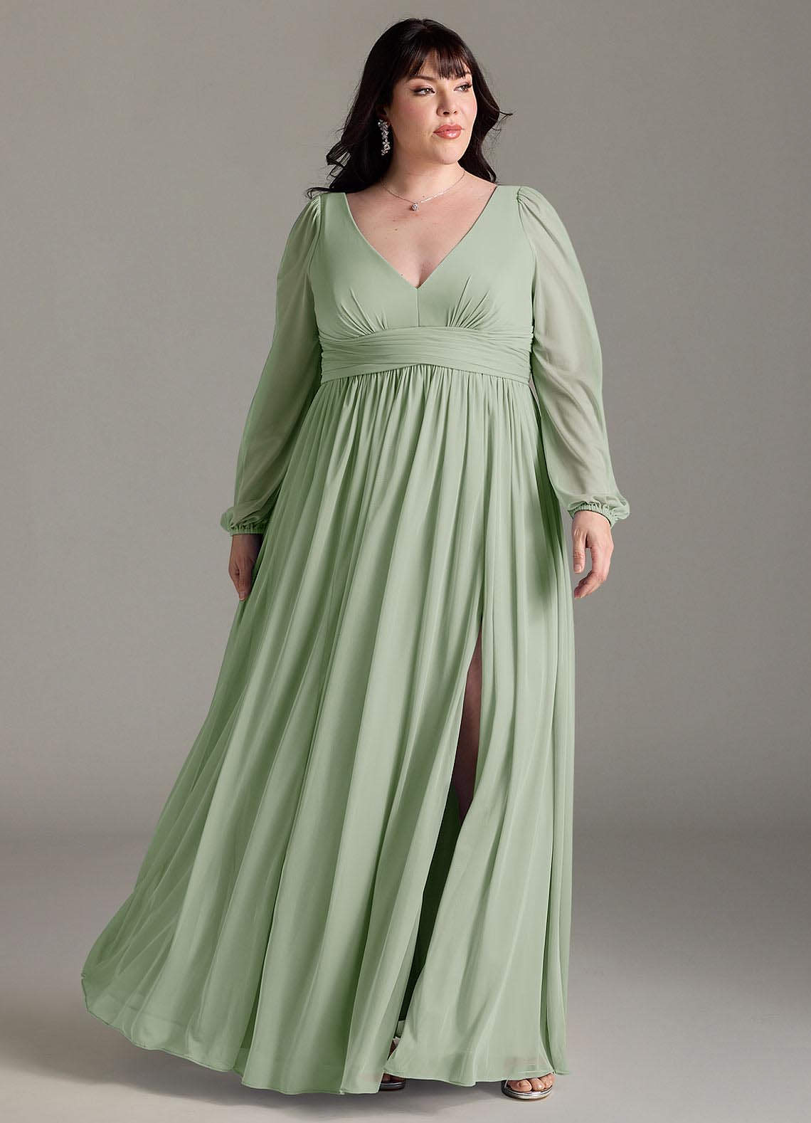 Sorgen Sie dafür, dass Ihre Brautjungfern mit unserem A-Linien-Chiffonkleid Norah großartig aussehen. Ihr V-Ausschnitt hat eine zarte Raffung und einen plissierten Empire-Bund. Lange Blousonärmel ergänzen das Oberteil. Der geraffte A-Linien-Rock fließt dank des Beinschlitzes bei jedem Schritt mit.