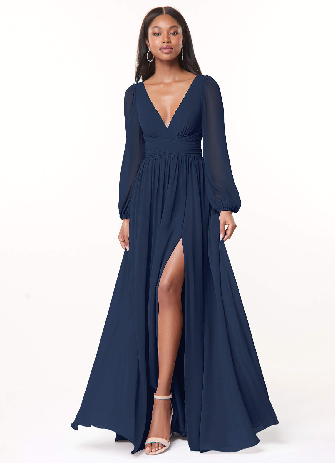 Sorgen Sie dafür, dass Ihre Brautjungfern mit unserem A-Linien-Chiffonkleid Norah großartig aussehen. Ihr V-Ausschnitt hat eine zarte Raffung und einen plissierten Empire-Bund. Lange Blousonärmel ergänzen das Oberteil. Der geraffte A-Linien-Rock fließt dank des Beinschlitzes bei jedem Schritt mit.
